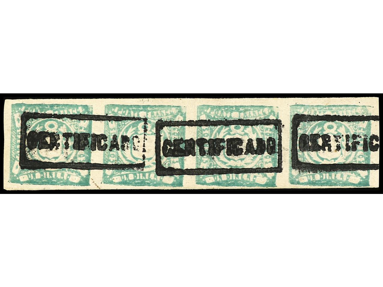 PERU. 1 dinero verde. Tira de cuatro, mat. CERTIFICADO de Moyabamba. PRECIOSO y RARO. Firmado CÁCERES. Sc.14. (Image1)