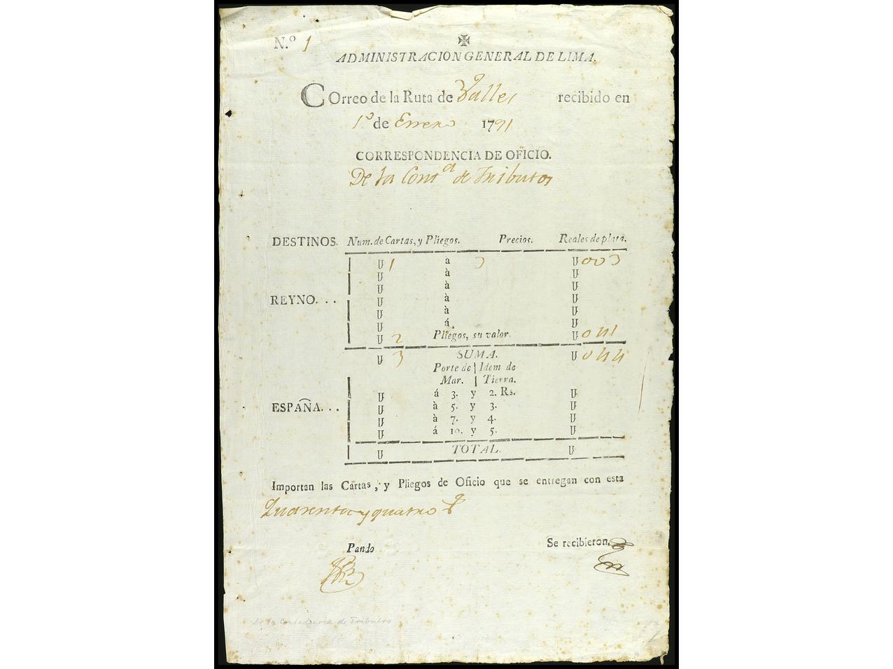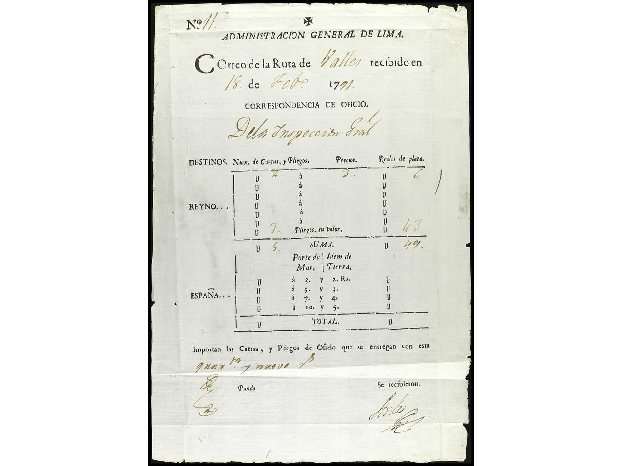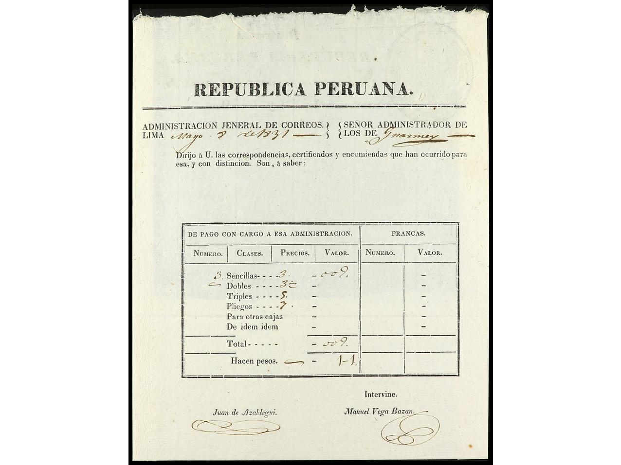 PERU. 1791-1831. Conjunto de seis GUIAS DE CORRESPONDENCIA de Callao (Ejército de Oviedo), Pasco, Guamey, Valles (2) y Cuzco. (Image1) (Image2)