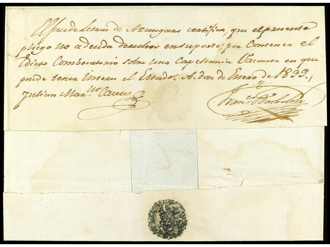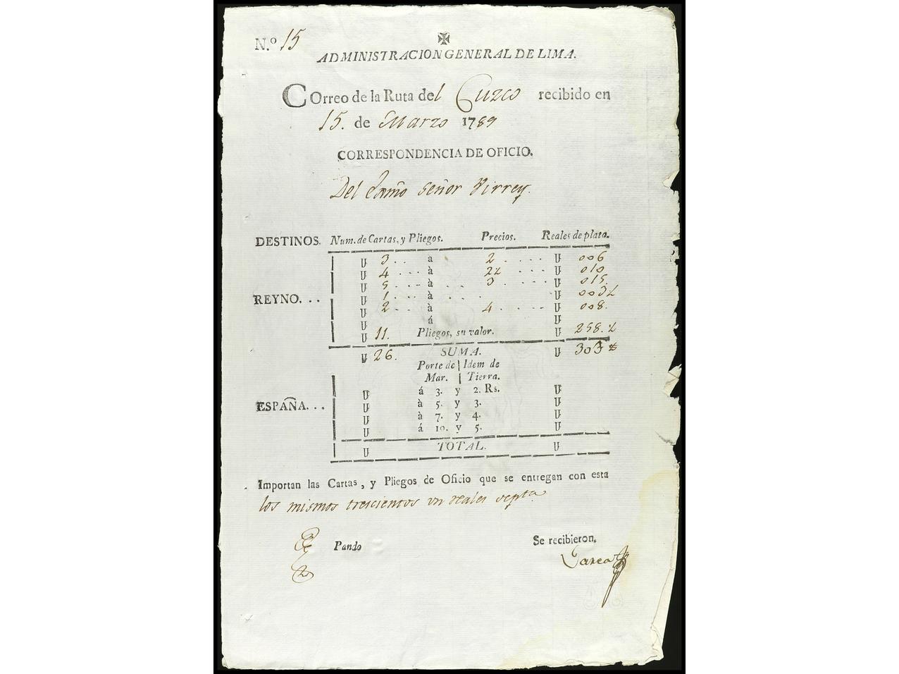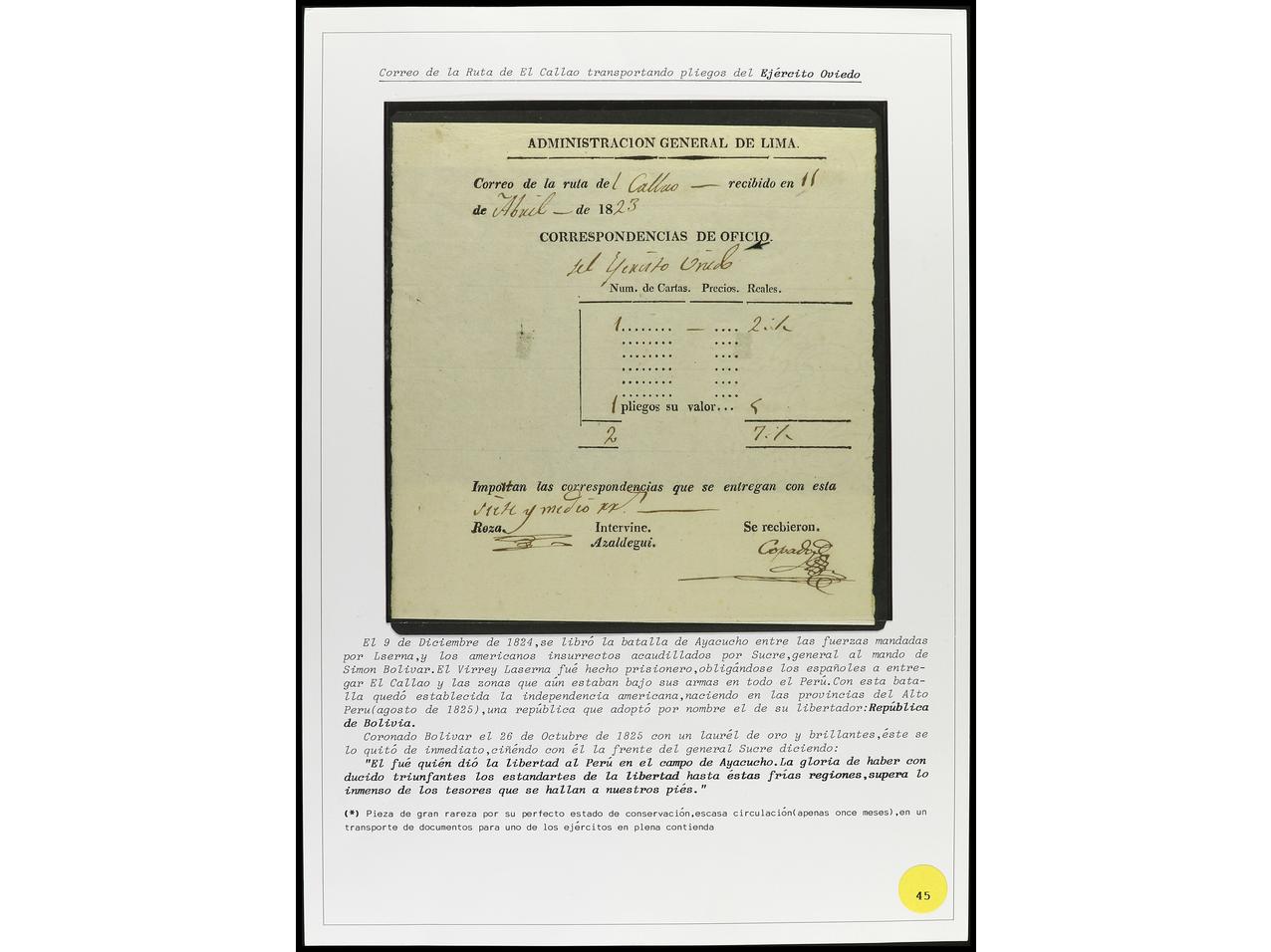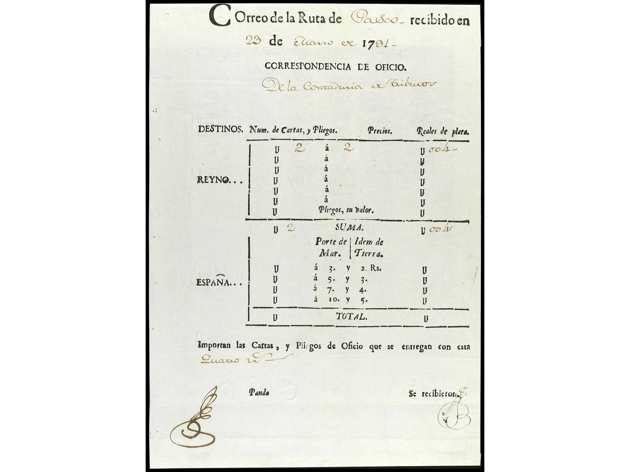 PERU. 1791-1831. Conjunto de seis GUIAS DE CORRESPONDENCIA de Callao (Ejército de Oviedo), Pasco, Guamey, Valles (2) y Cuzco. (Image1) (Image2)