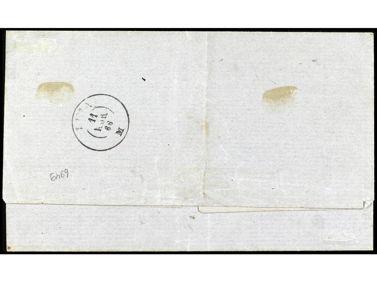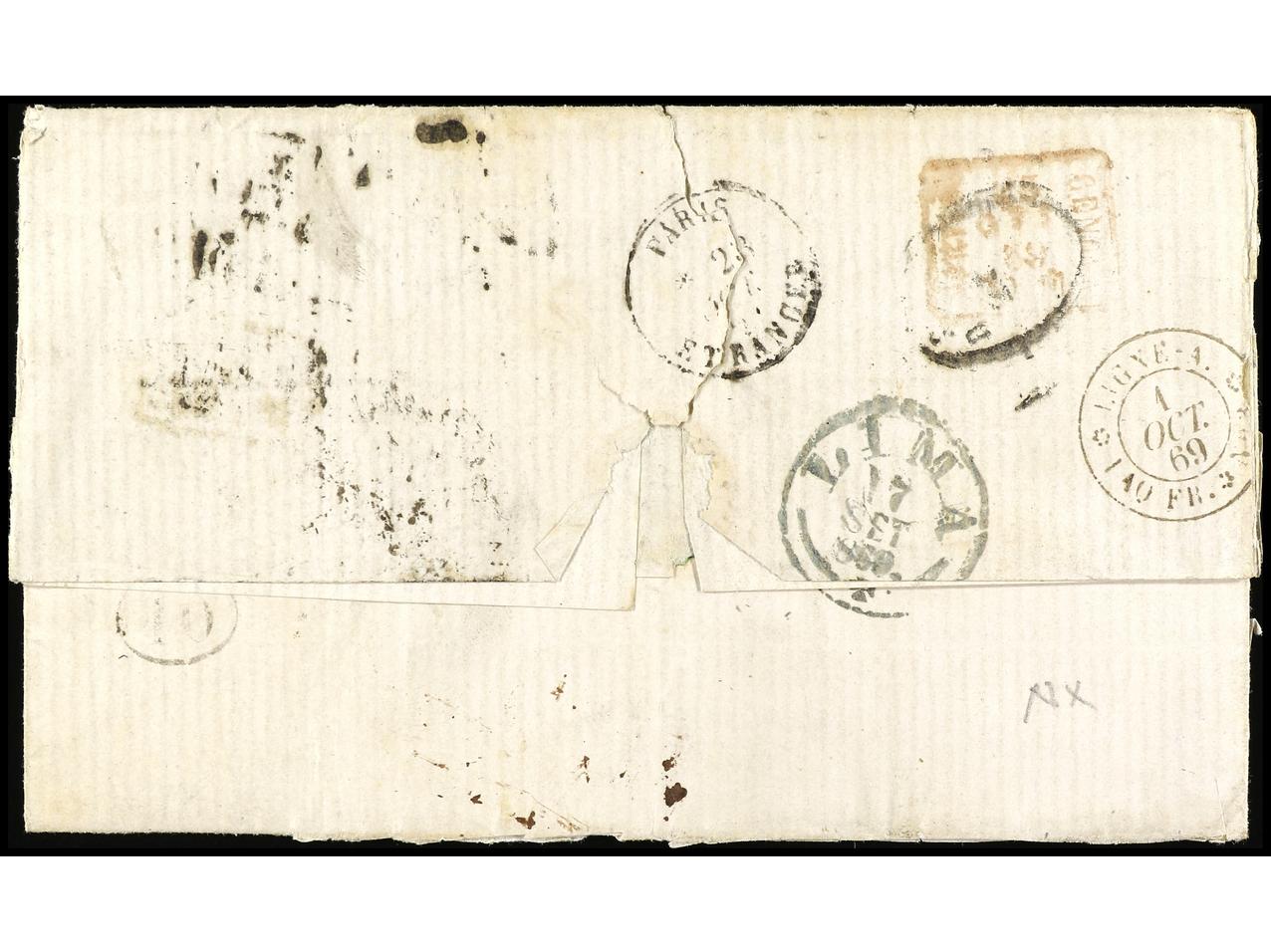 PERU. 1869. PASCO a ITALIA. 1 dinero verde circulada por correo inglés y francés vía Panamá, algunos defectos en la envuelta. (Image1) (Image2)