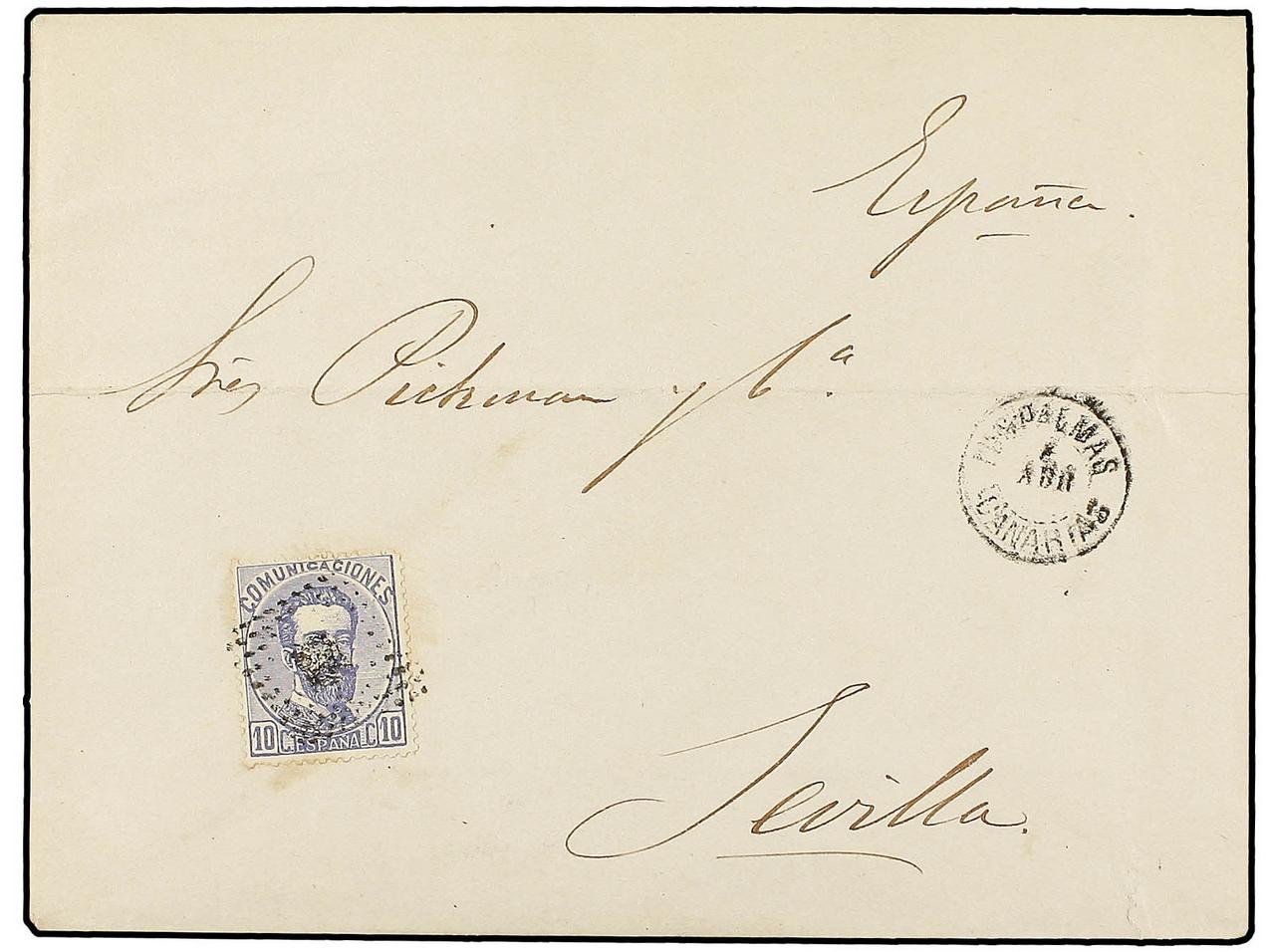 ESPAÑA. 1872. LAS PALMAS a SEVILLA. 10 cts. azul, mat. ROMBO DE PUNTOS y fechador LAS PALMAS/CANARIAS. Ed.121. (Image1) (Image2)