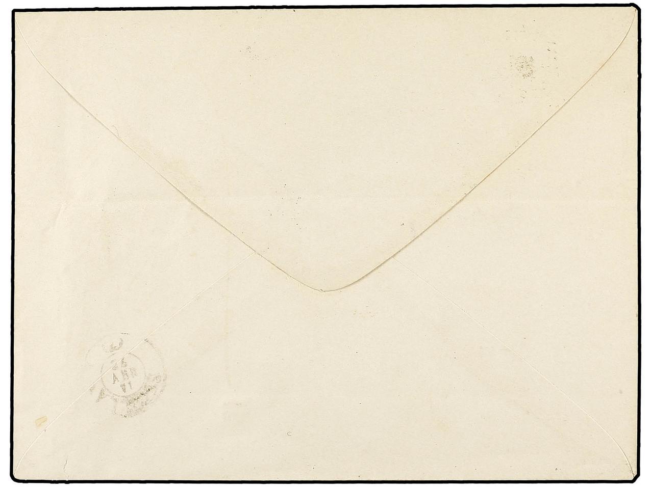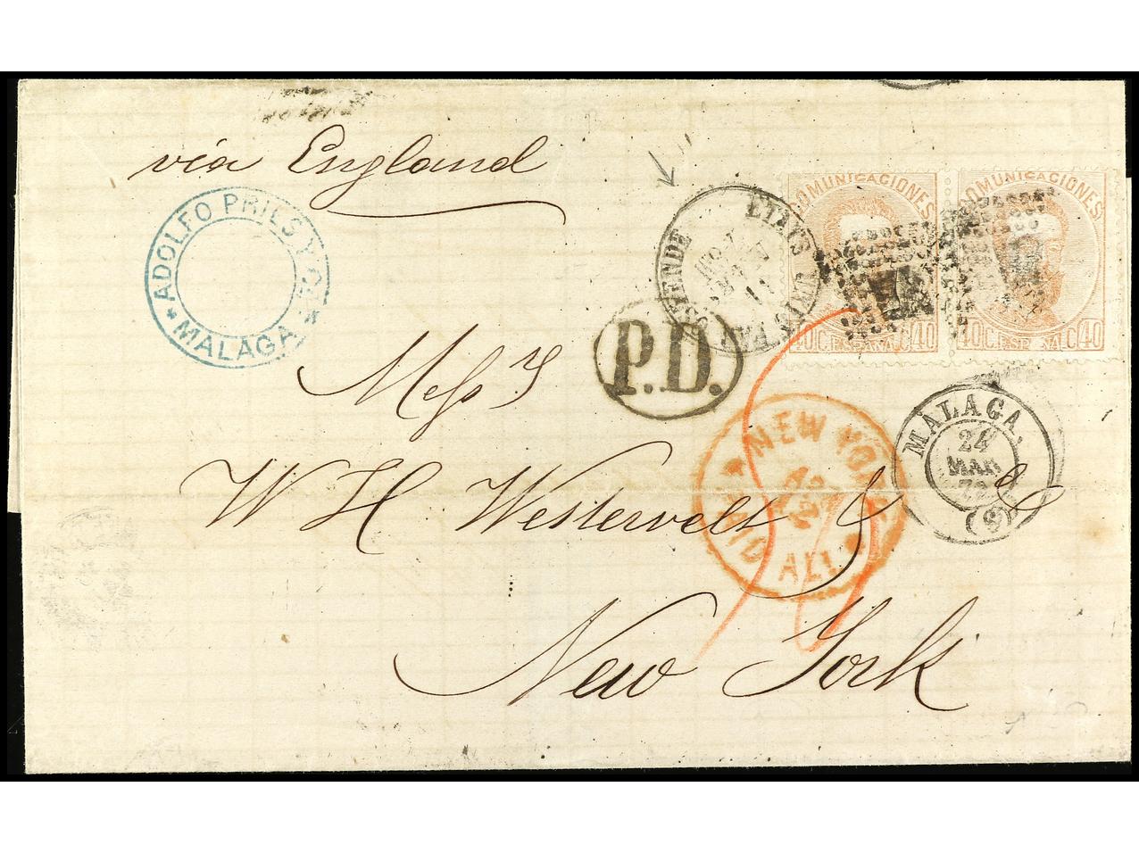 ESPAÑA. 1873. MÁLAGA a NEW YORK. 40 cts. castaño (2) circulado por la inusual vía de Ostende (Bélgica) fechador en el frente ETATS UNIS PAR OSTENDE raro fechador con esta excelente estampación. Ed.125 (2). (Image1) (Image2)