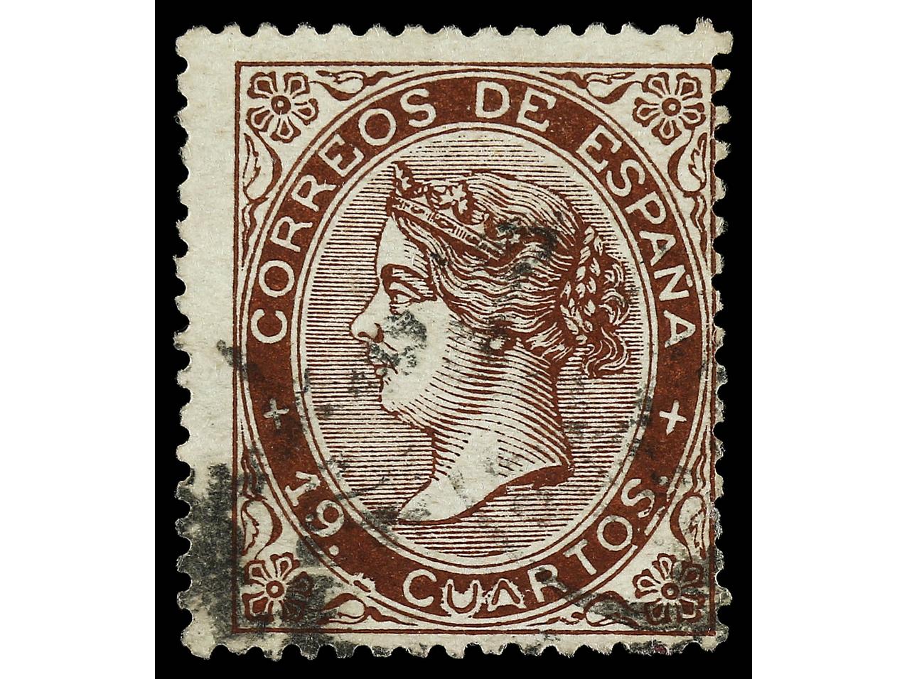 ESPAÑA. 19 cuartos castaño. Retoque en ´UA´ de CUARTOS con perfil interior en dichas letras. RARO. Ed.101m. Cat. 775€. (Image1)