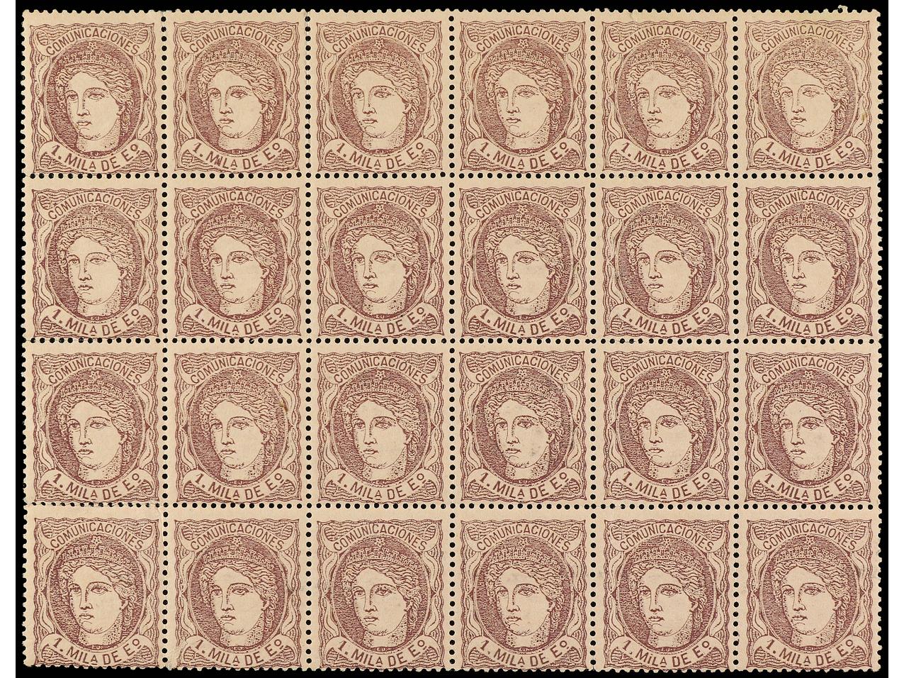 ESPAÑA. 1 mils. violeta s. salmón. Bloque de 24 sellos, excelente centraje. MAGNÍFICO. Ed.102 (24). Cat. 312€. (Image1)