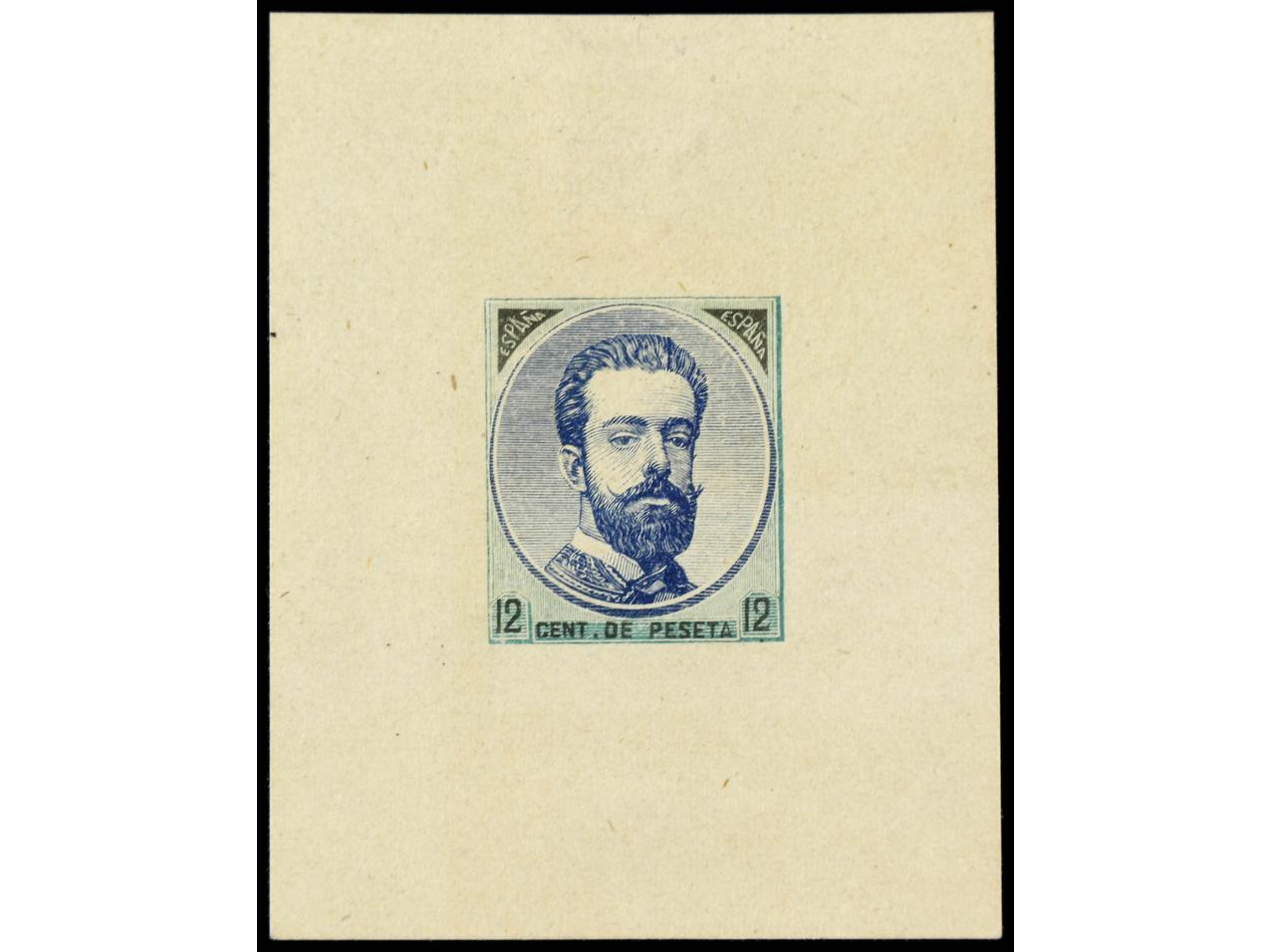 ESPAÑA. 12 cts. verde, negro y azul PRUEBA DE PUNZÓN (Gálvez 702). Ed.122. (Image1)