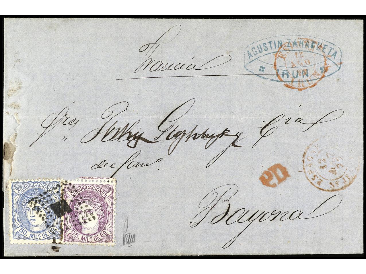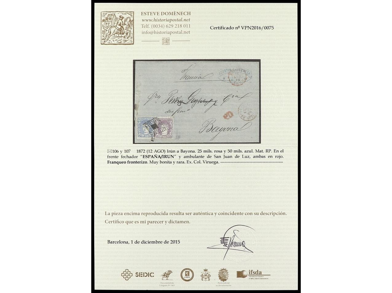ESPAÑA. 1872. IRÚN a BAYONA. 25 mils. lila y 50 mils. azul. Franqueo fronterizo. Ed.106, 107. (Image1) (Image2)
