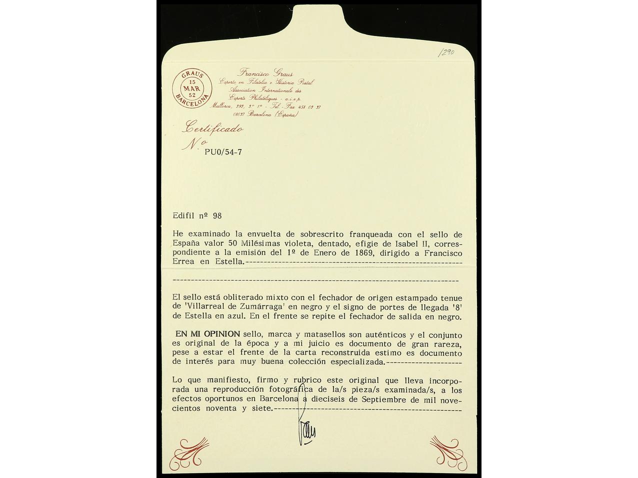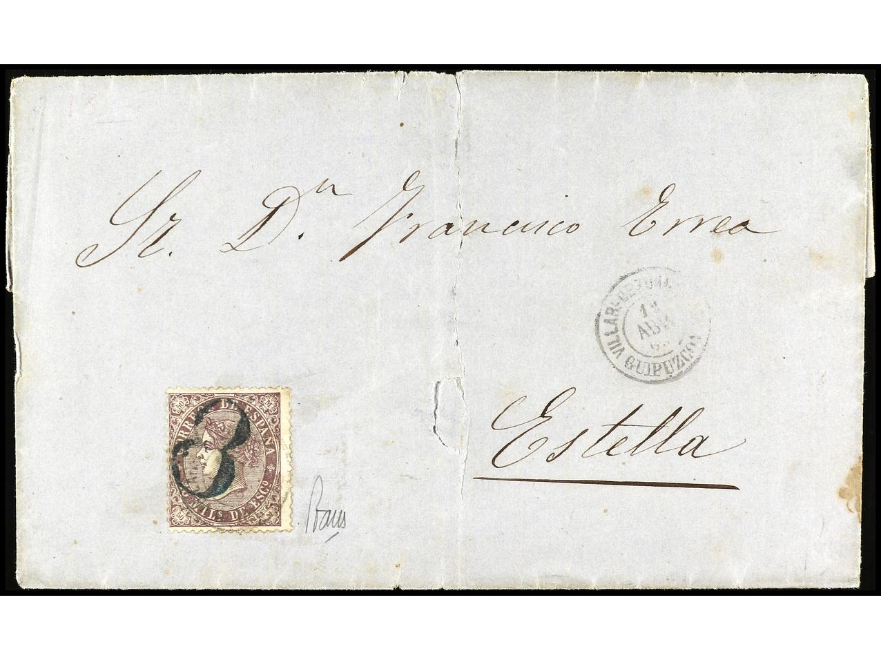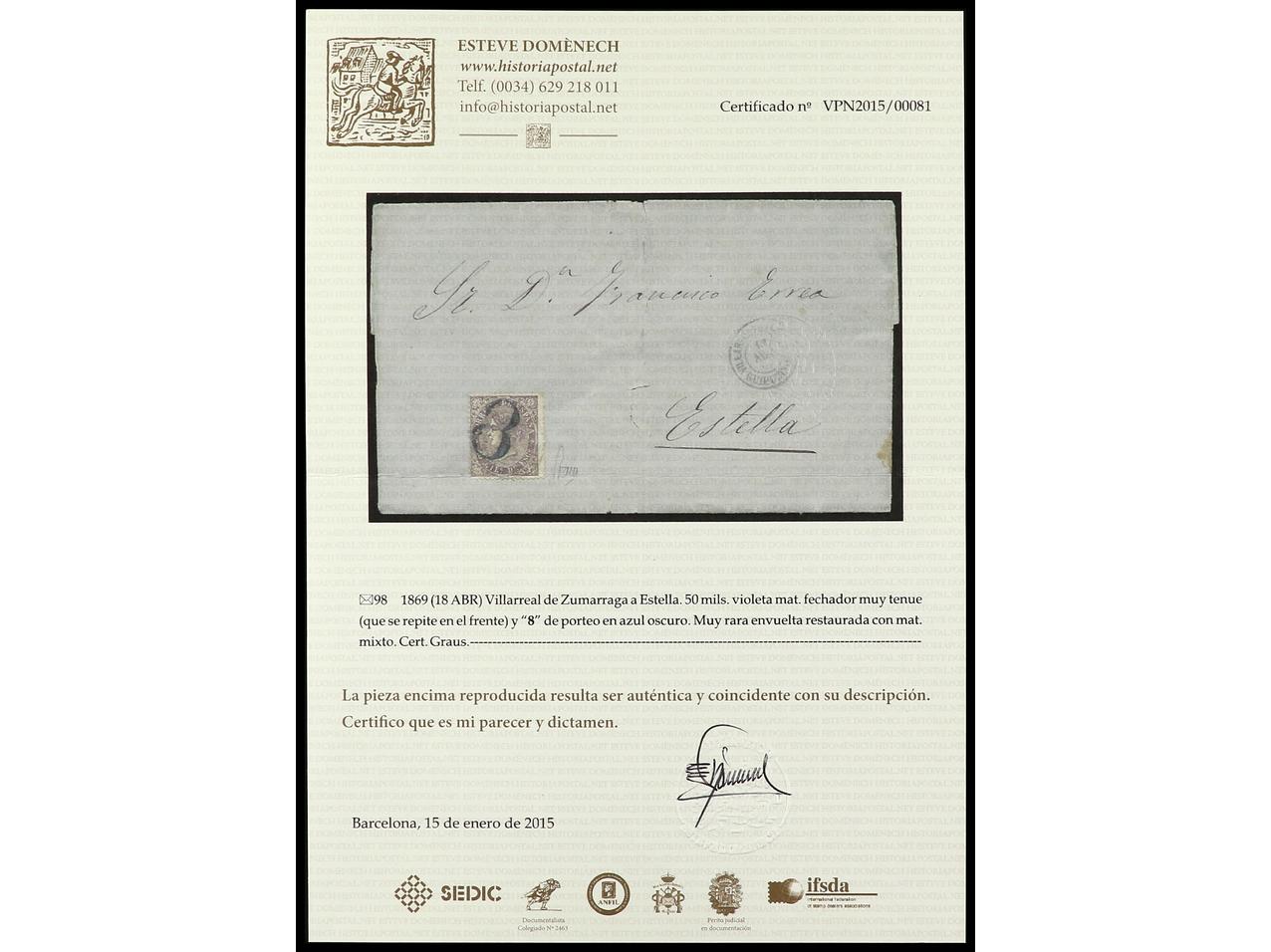 ESPAÑA. 1869. VILLARREAL DE ZUMARRAGA a ESTELLA. 50 mils. violeta mat. fechador muy tenue que a la llegada a Estella fue matasellado con un 8 de porteo en azul. Rotura restaurada. Cert. GRAUS. Ed.98. (Image1) (Image2)