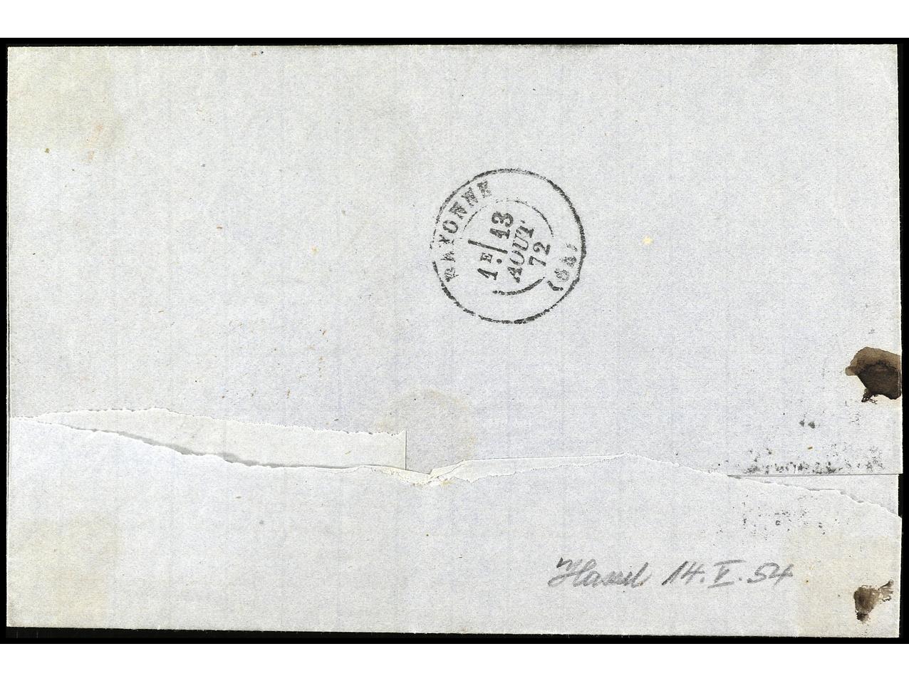 ESPAÑA. 1871. BARCELONA a HOLANDA. 50 mils. (dentado retocado a tijera en origen), 12 cuartos castaño (2) (uno defecto). Tarifa de 450 mils. a Holanda vía Ginebra. RARA. Ed.107, 113 (2). (Image1) (Image2)