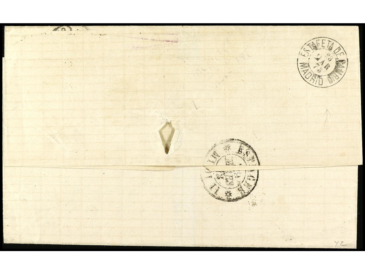 ESPAÑA. 1871. BARCELONA a MADRID. 200 mils. castaño. RARO franqueo de cuatro portes pagados con sello de 200 mils. Ed.109. (Image1) (Image2)