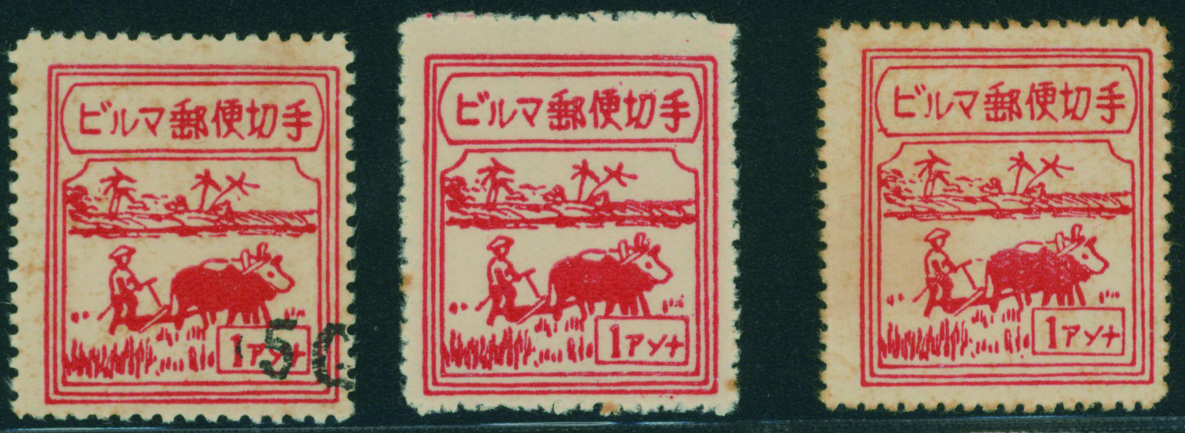Burma two 1 Annna. and a 5c ovpt. on 1 Anna. unused stained, (Image1) (Image2)