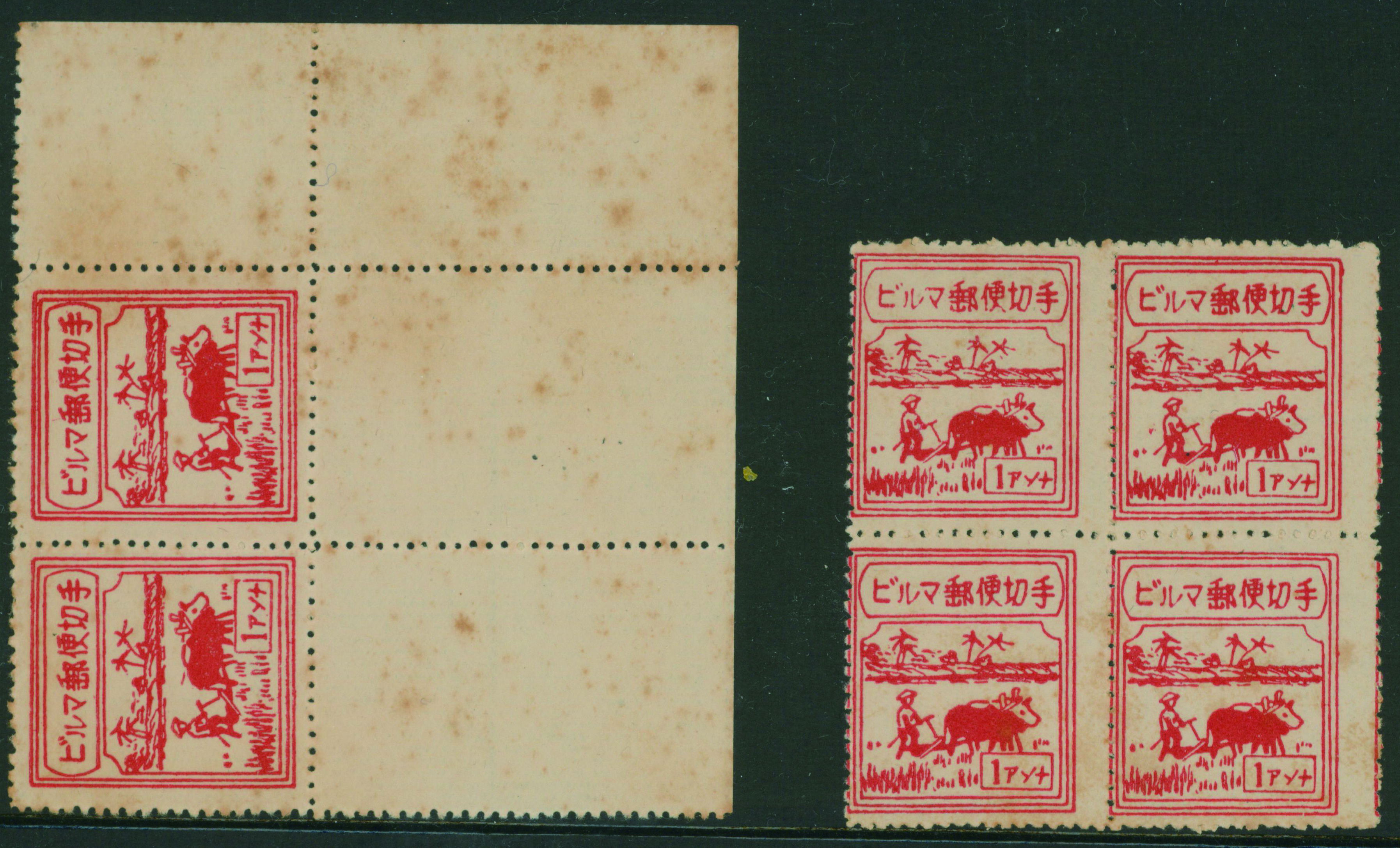 Burma 1 Annna, corner marginal pair, but dirty and a block of four unused stained, full original