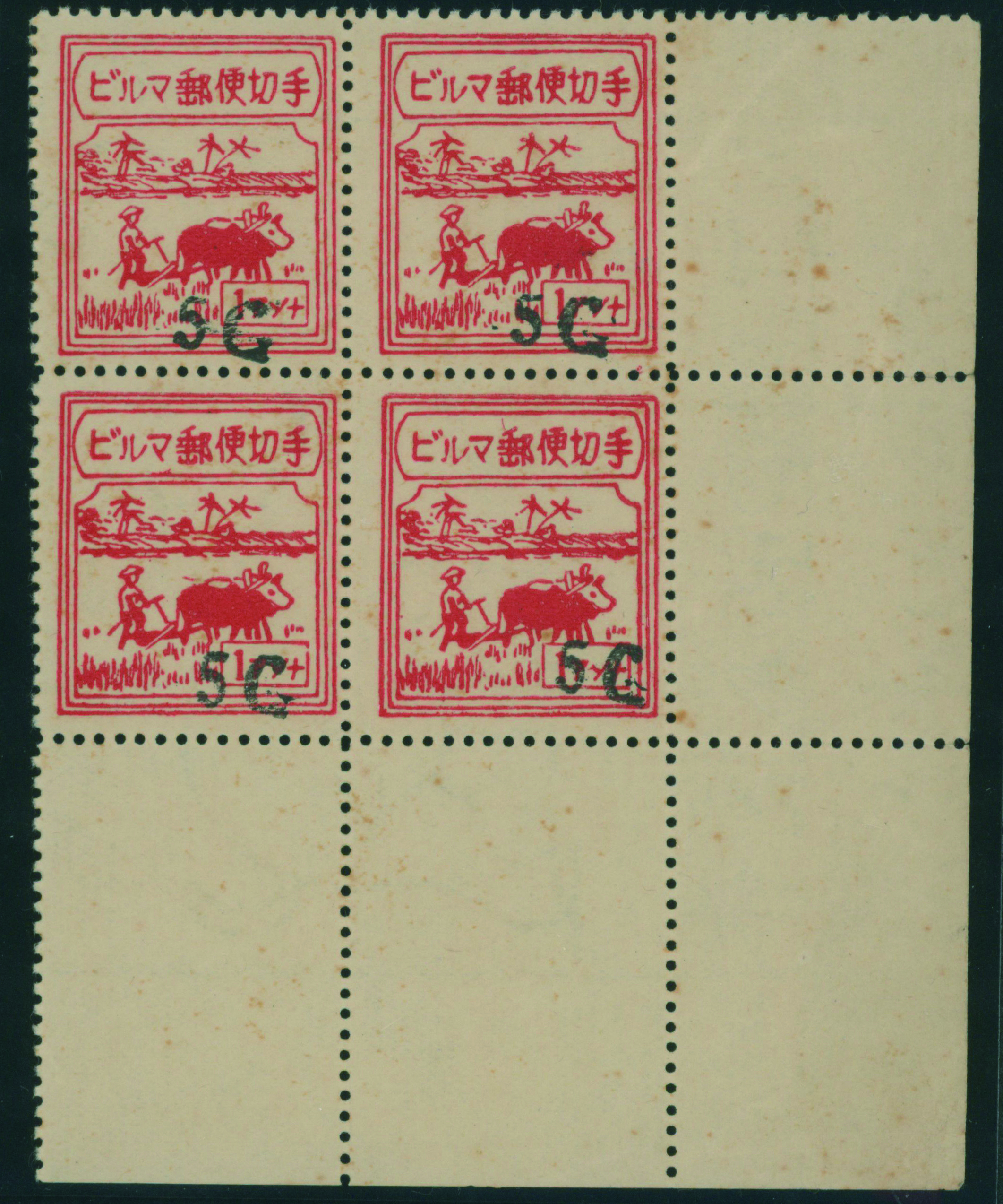 Burma 5c OVPT. on 1 Anna, corner marginal block of four unused stained, full original gum, (Image1)