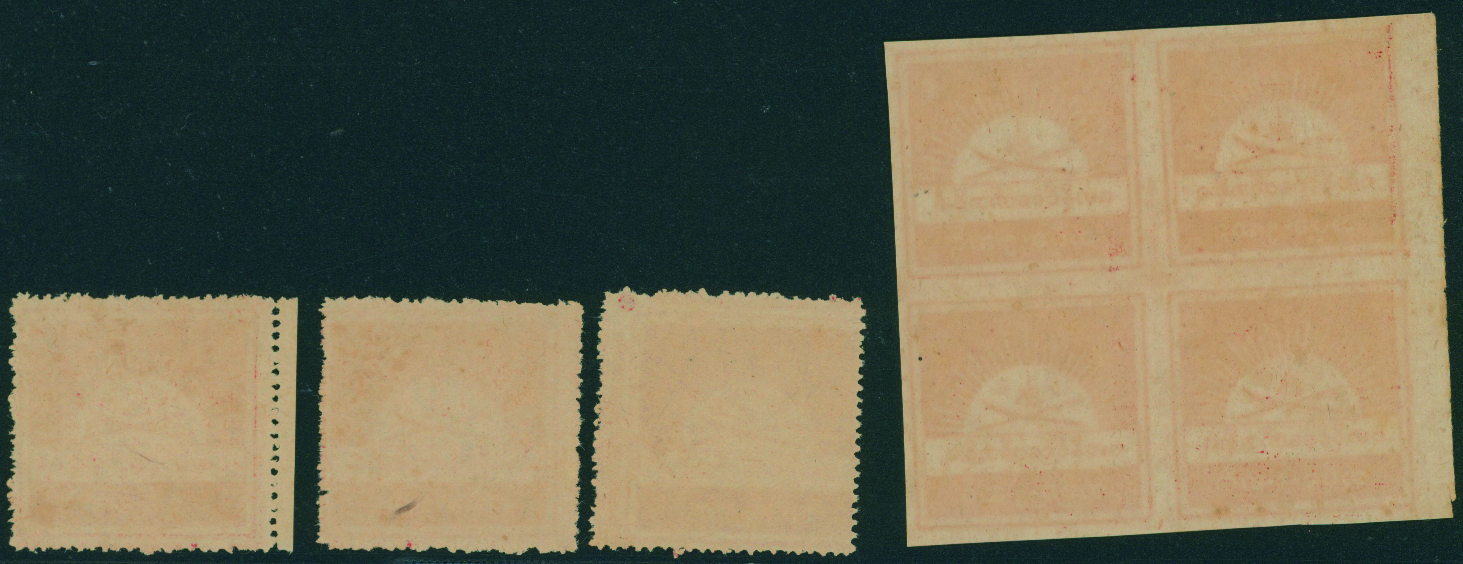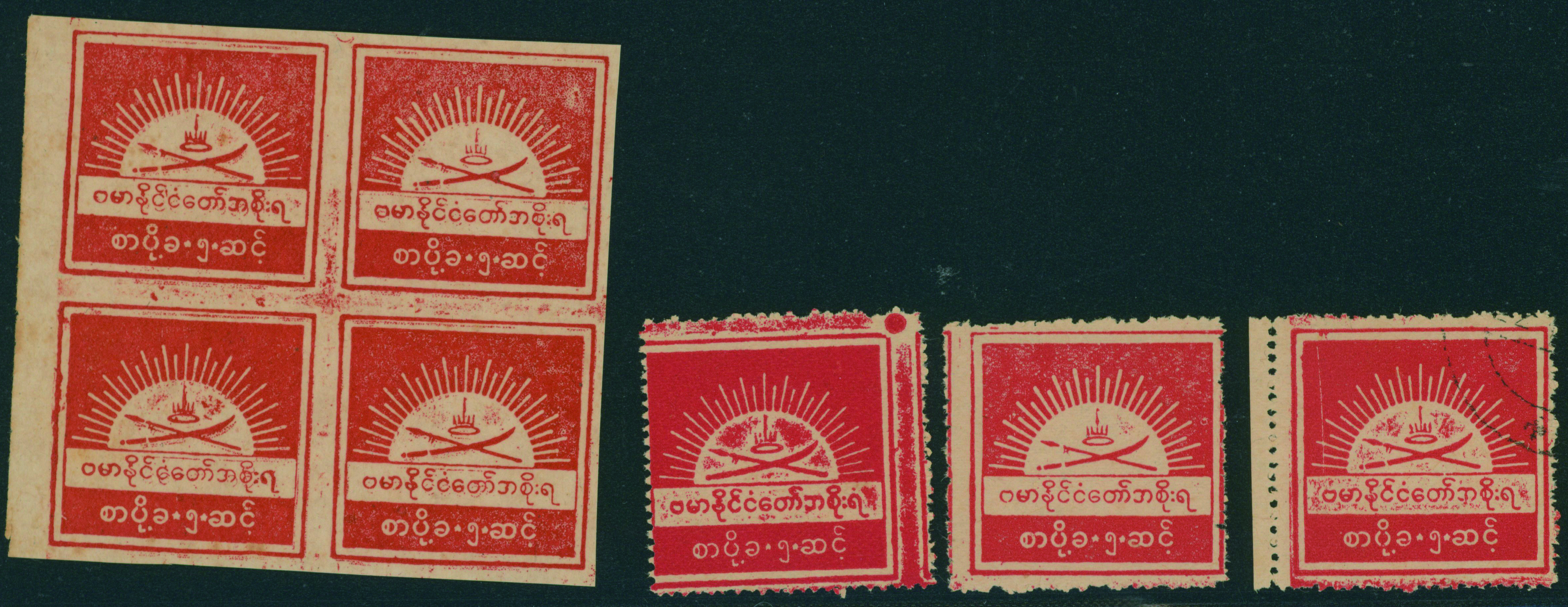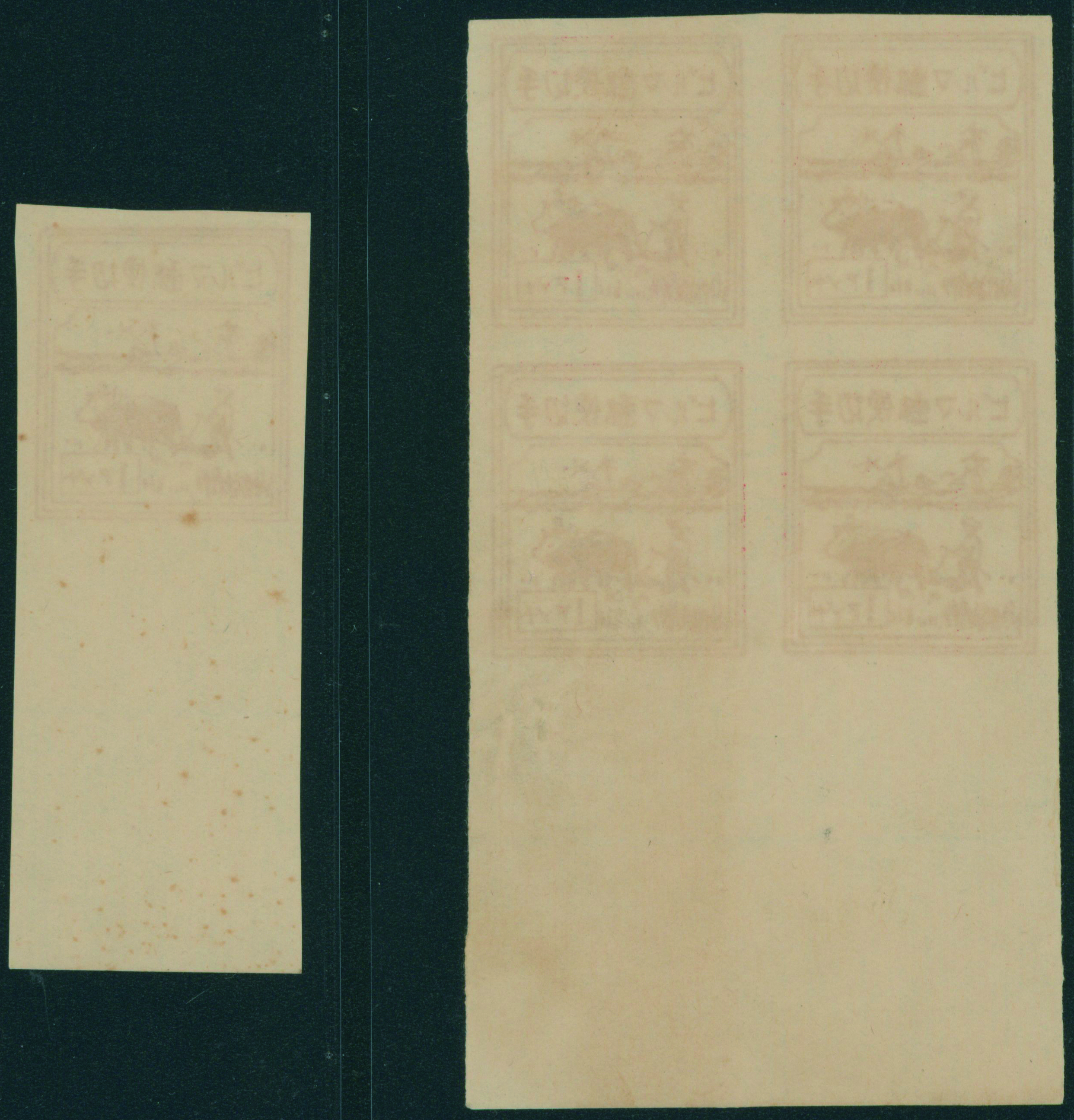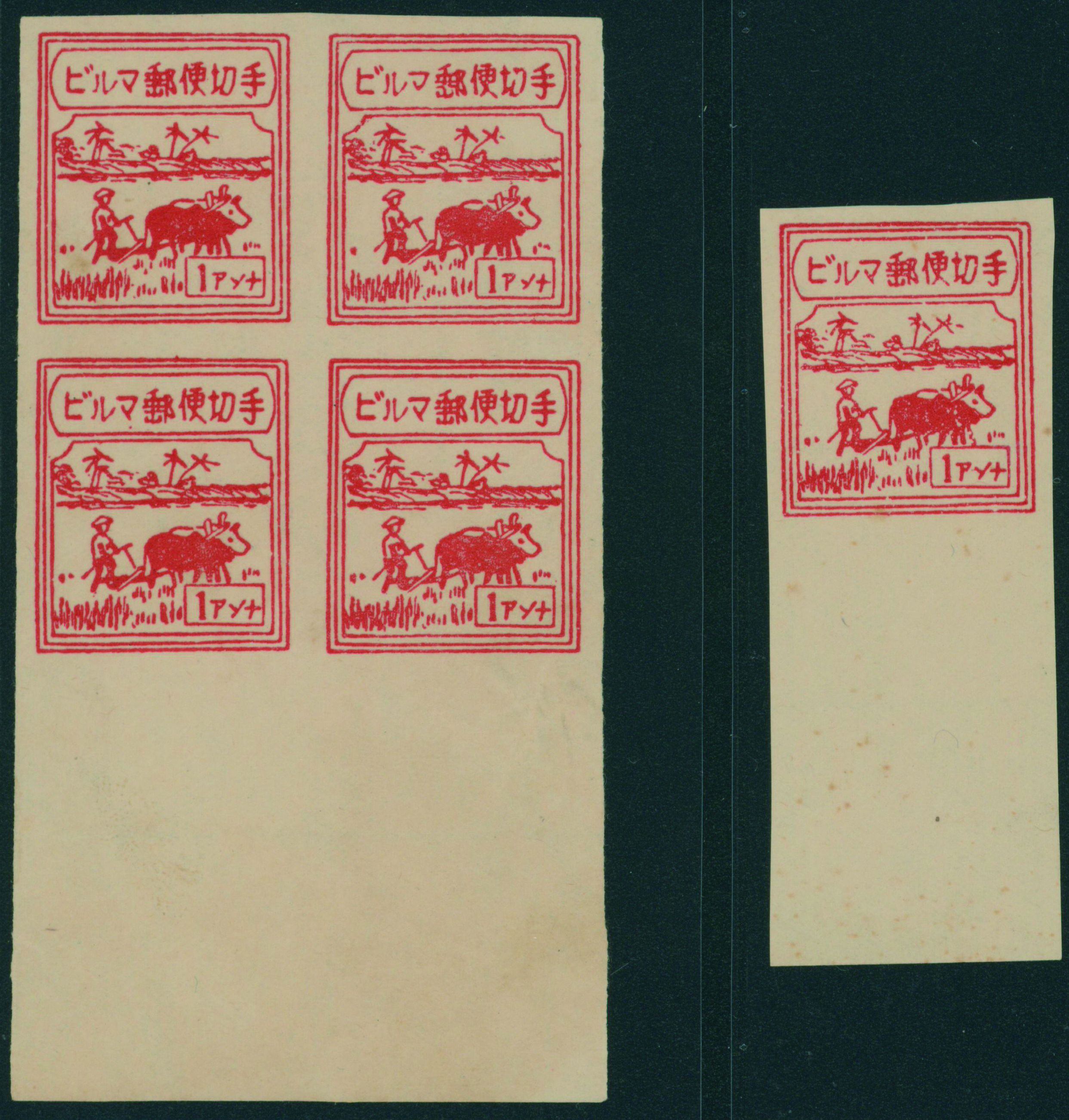 Burma 1 Annna imperf. marginal block of four and a marginal single unused full original gum, (Image1) (Image2)