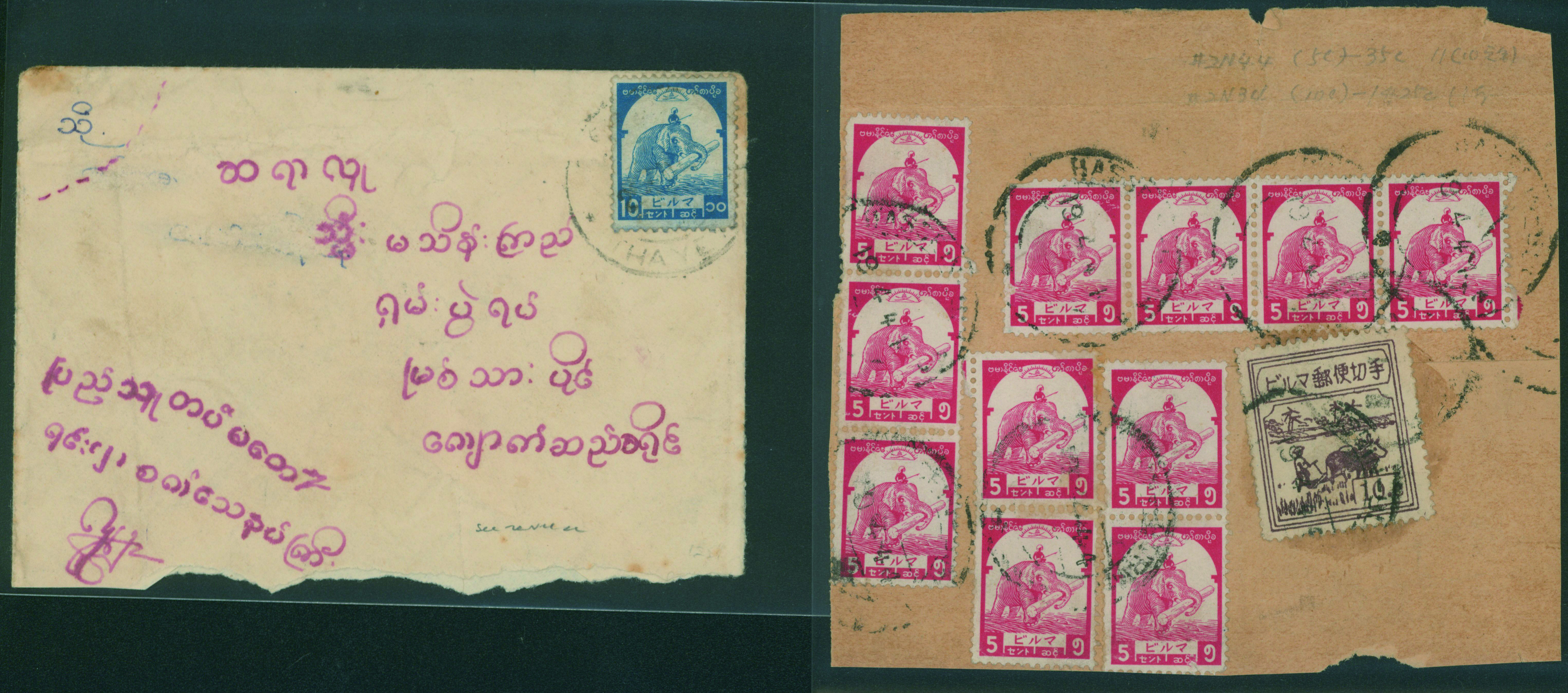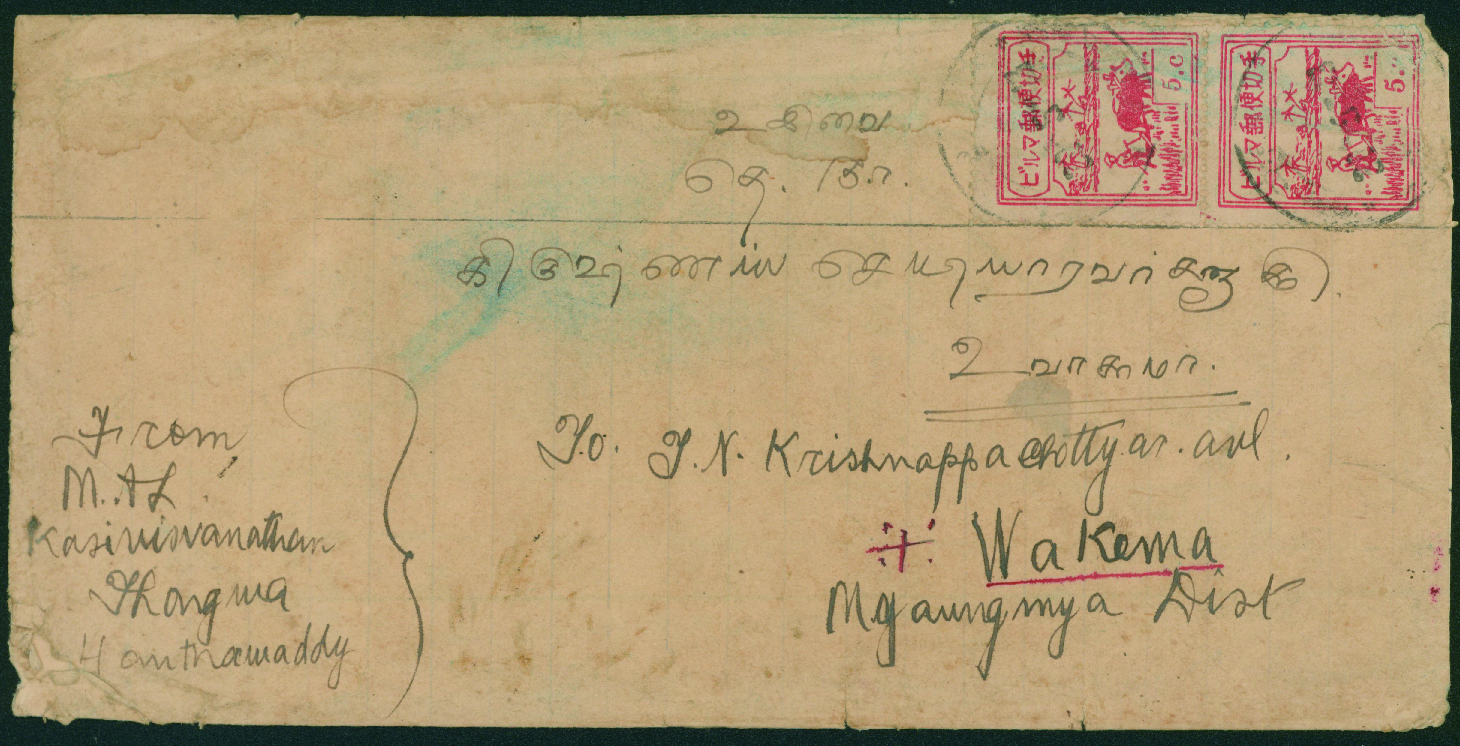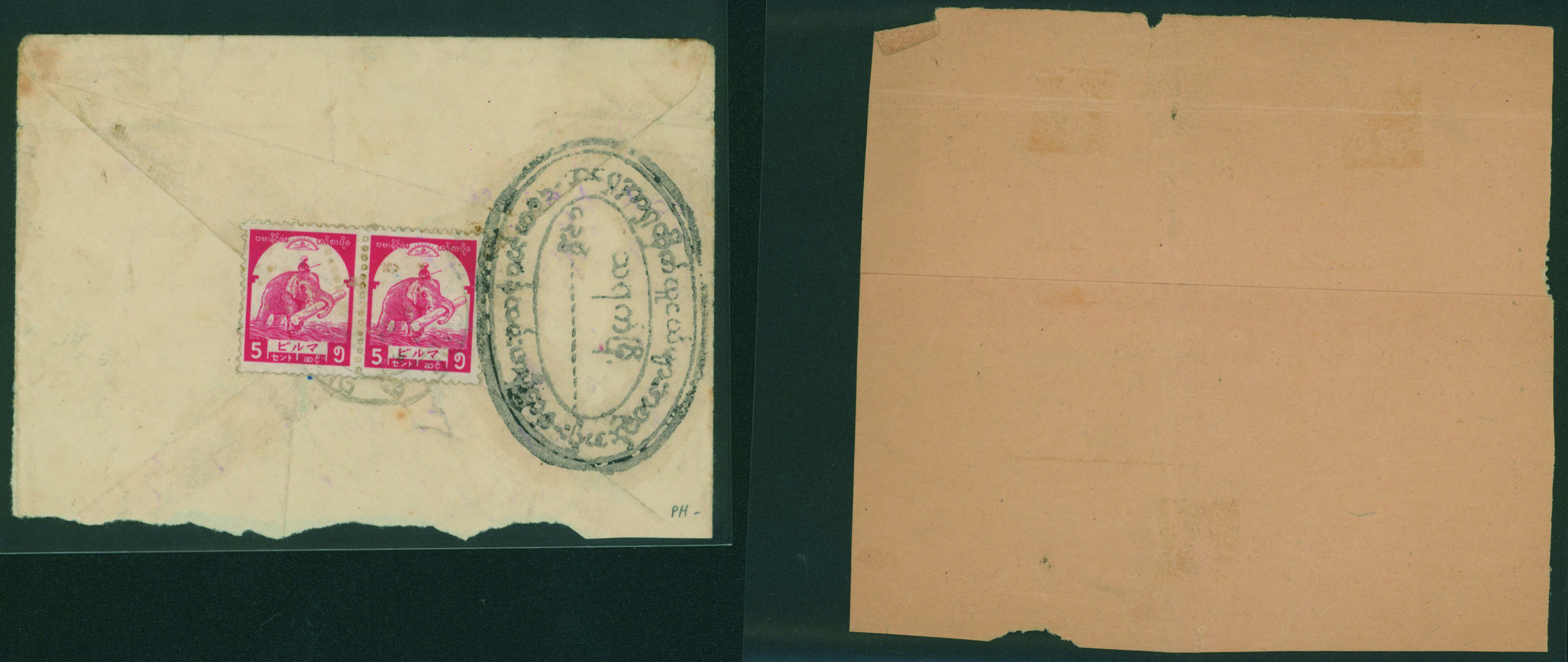 Burma 5 c pair franking damaged, cancelled by datestamp 1943-05-20 cover stained, (Image1) (Image2)