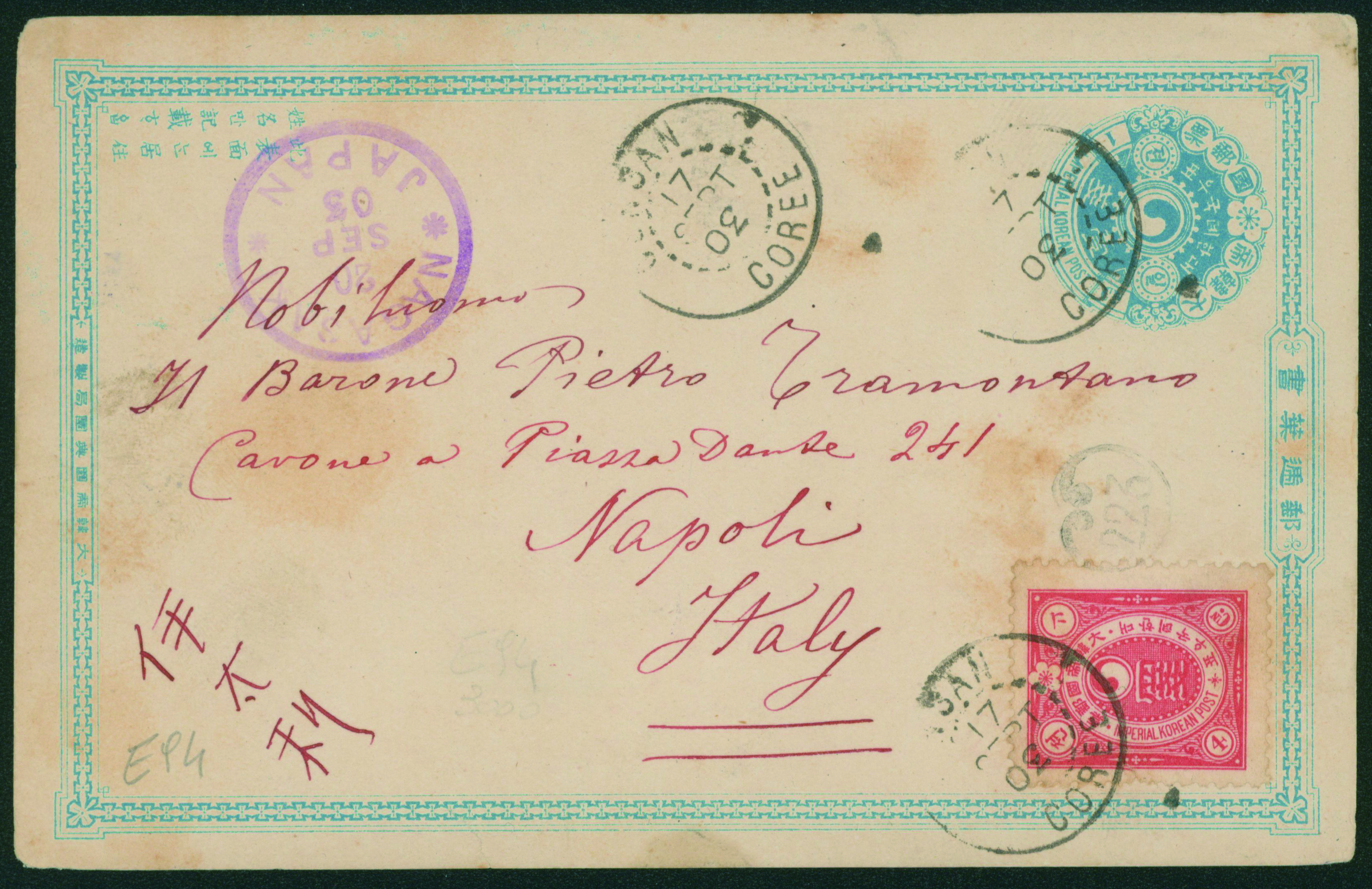 South Korea Old Korea Postcard 1sen Franking 4sen usage stained, bent, ---SAN 1903.9.17 Overpaid