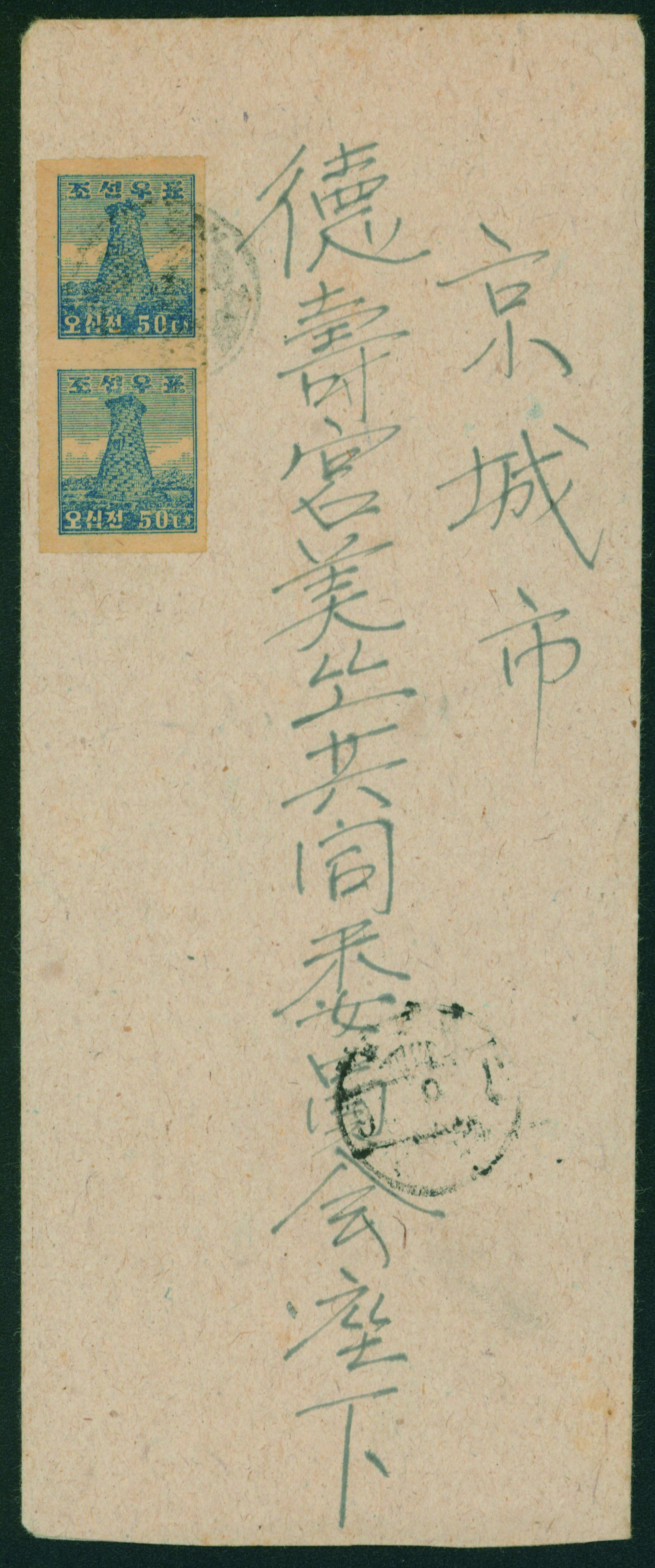South Korea 1946 USMG 1st Definitive 50ch pair cancelled by datestamp to 米ソ共同委員会 censored