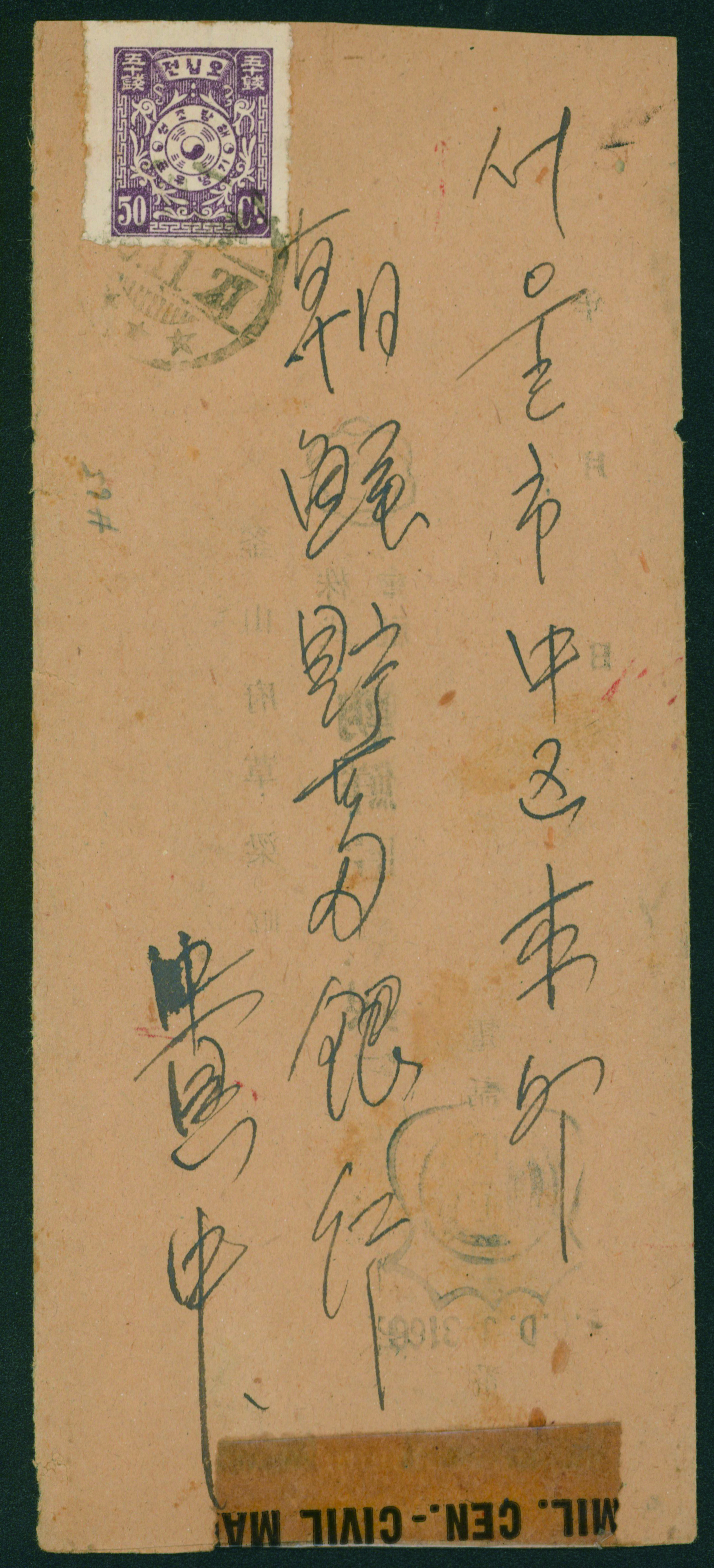 South Korea 1946 50ch Liberation Issue single franking cancelled by datestamp 1946-01-17