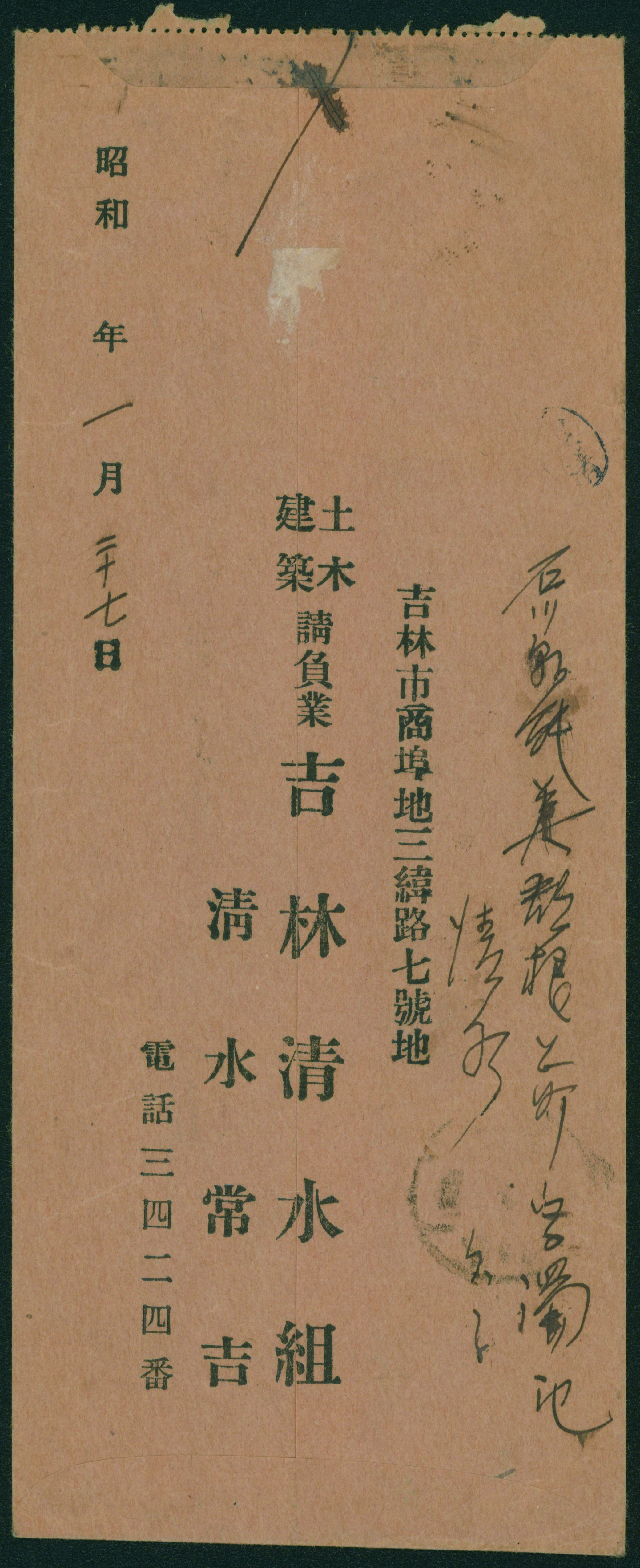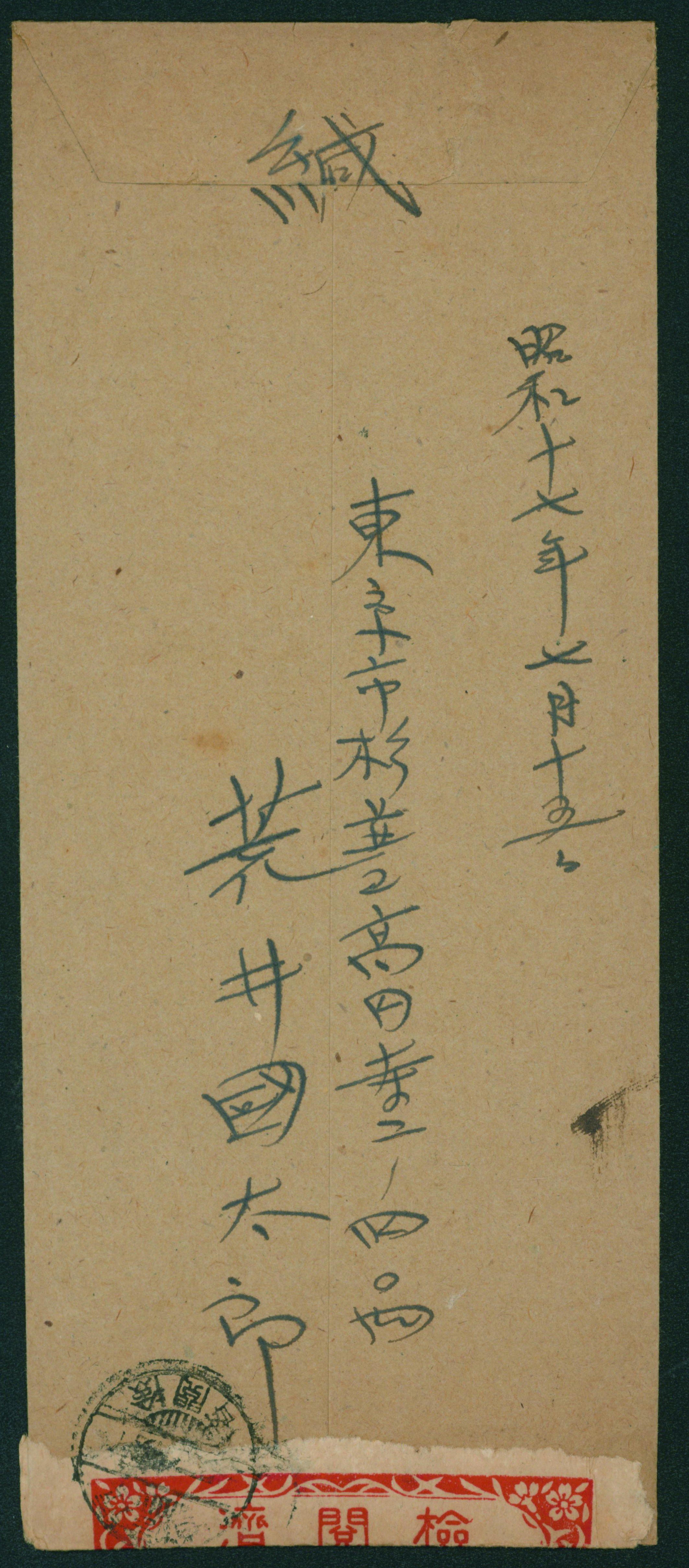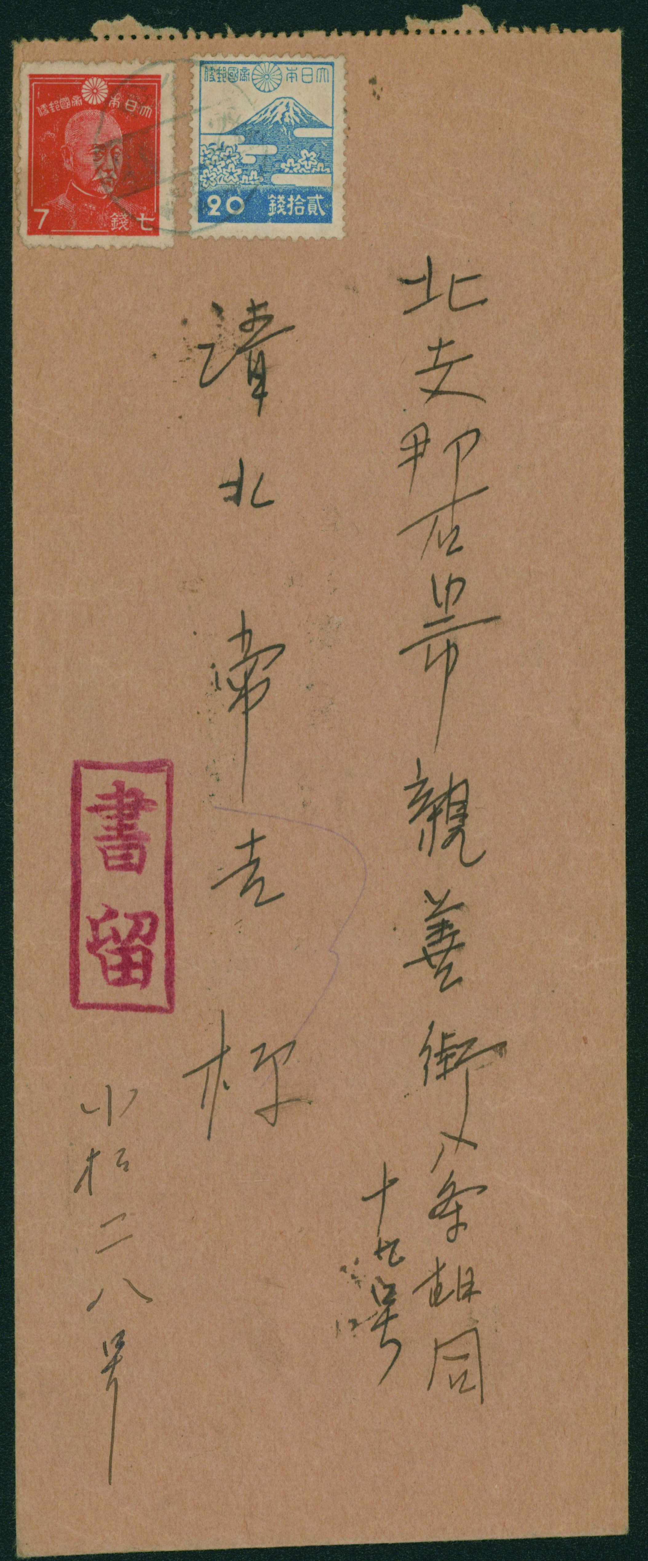 wartime issue 7 Sen, 20 Sen cancelled by comb cds 1945-01-28 Ishikawa to 北支那 (Image1) (Image2)