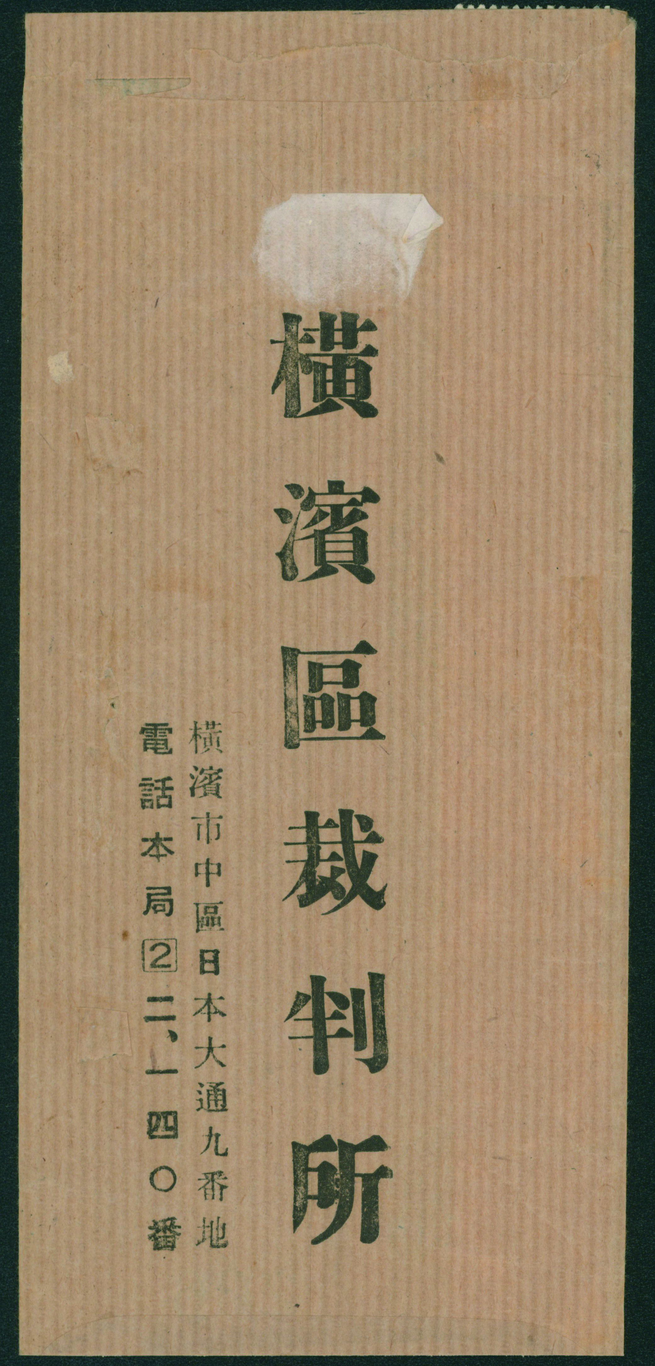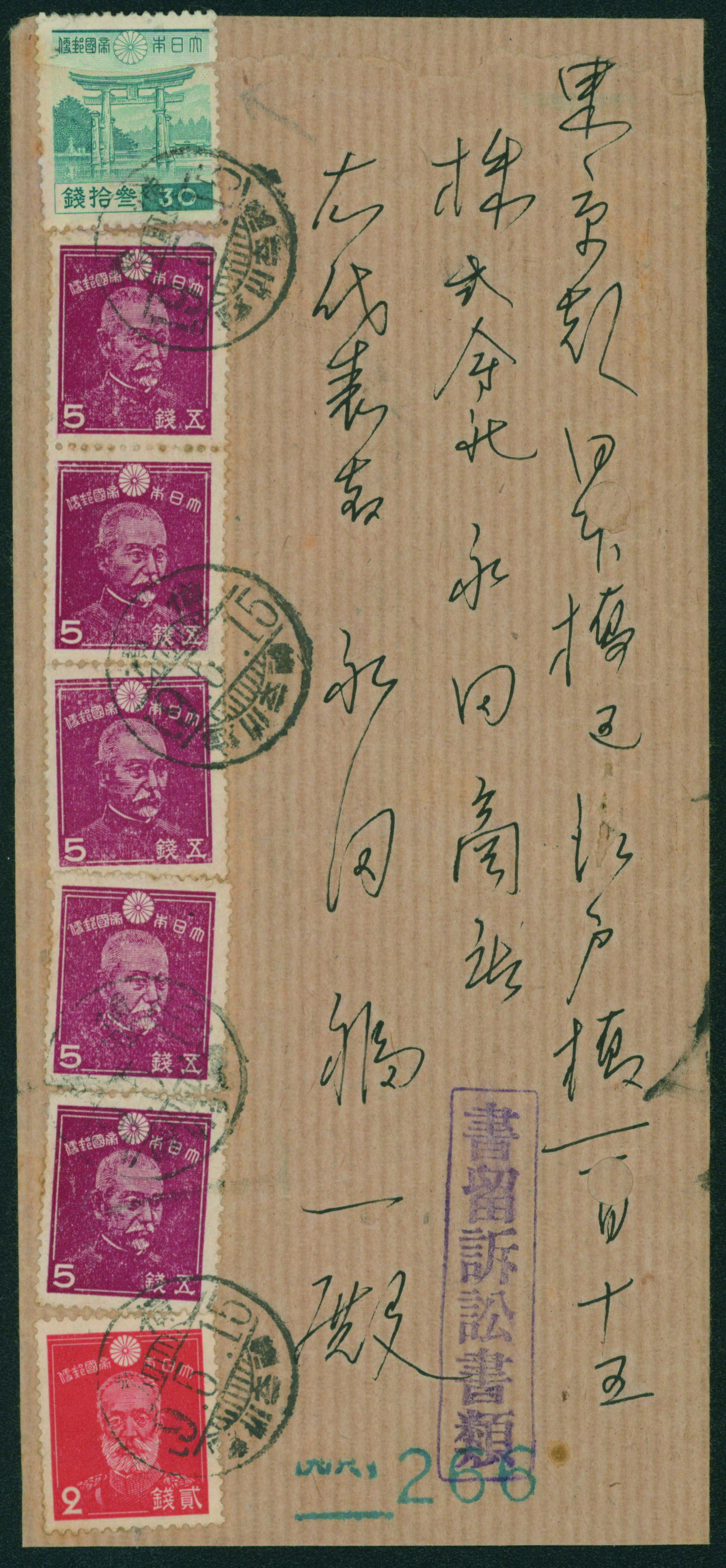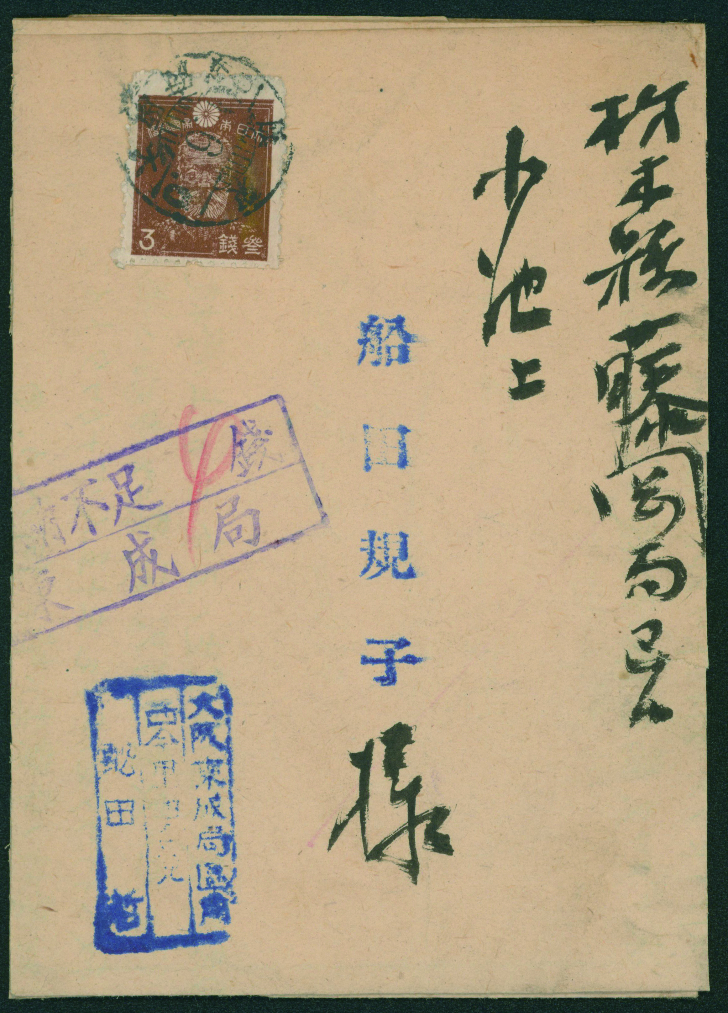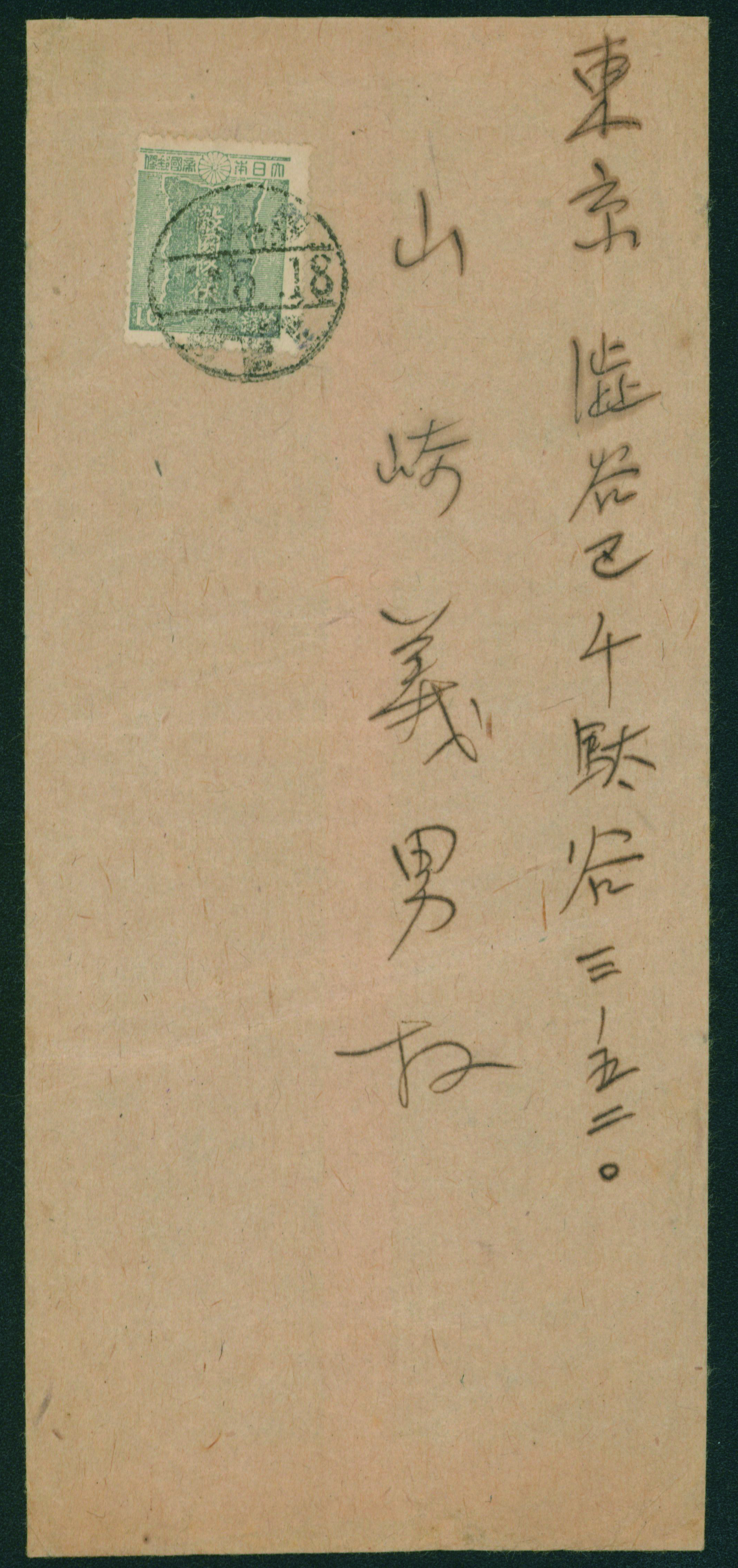 wartime issue 3 Sen single franking cancelled by comb cds 1945-06-16 Higashinari wrapper, (Image1) (Image2)