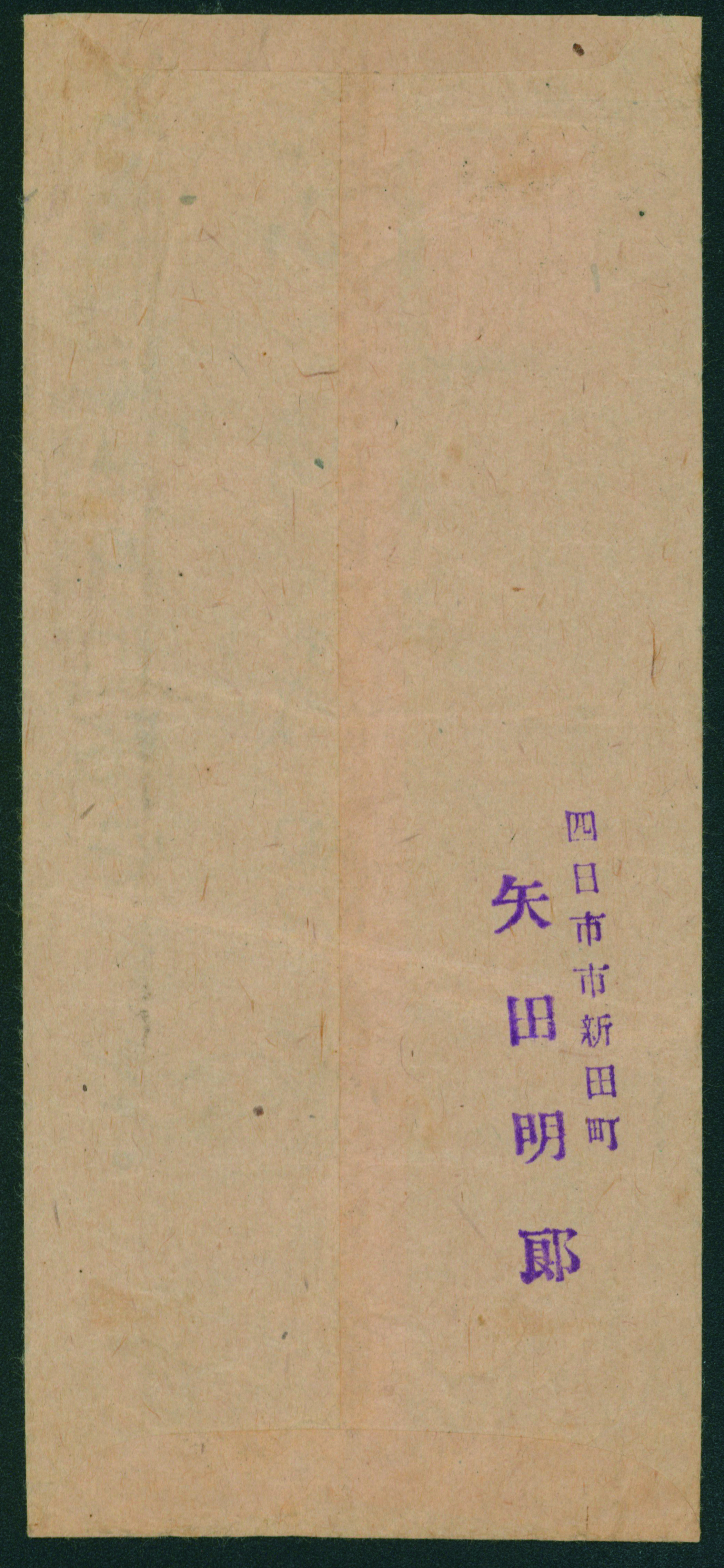 wartime issue 10 Sen blue single franking cancelled by comb cds 1945-05-18 Yokkaichi (Image1) (Image2)