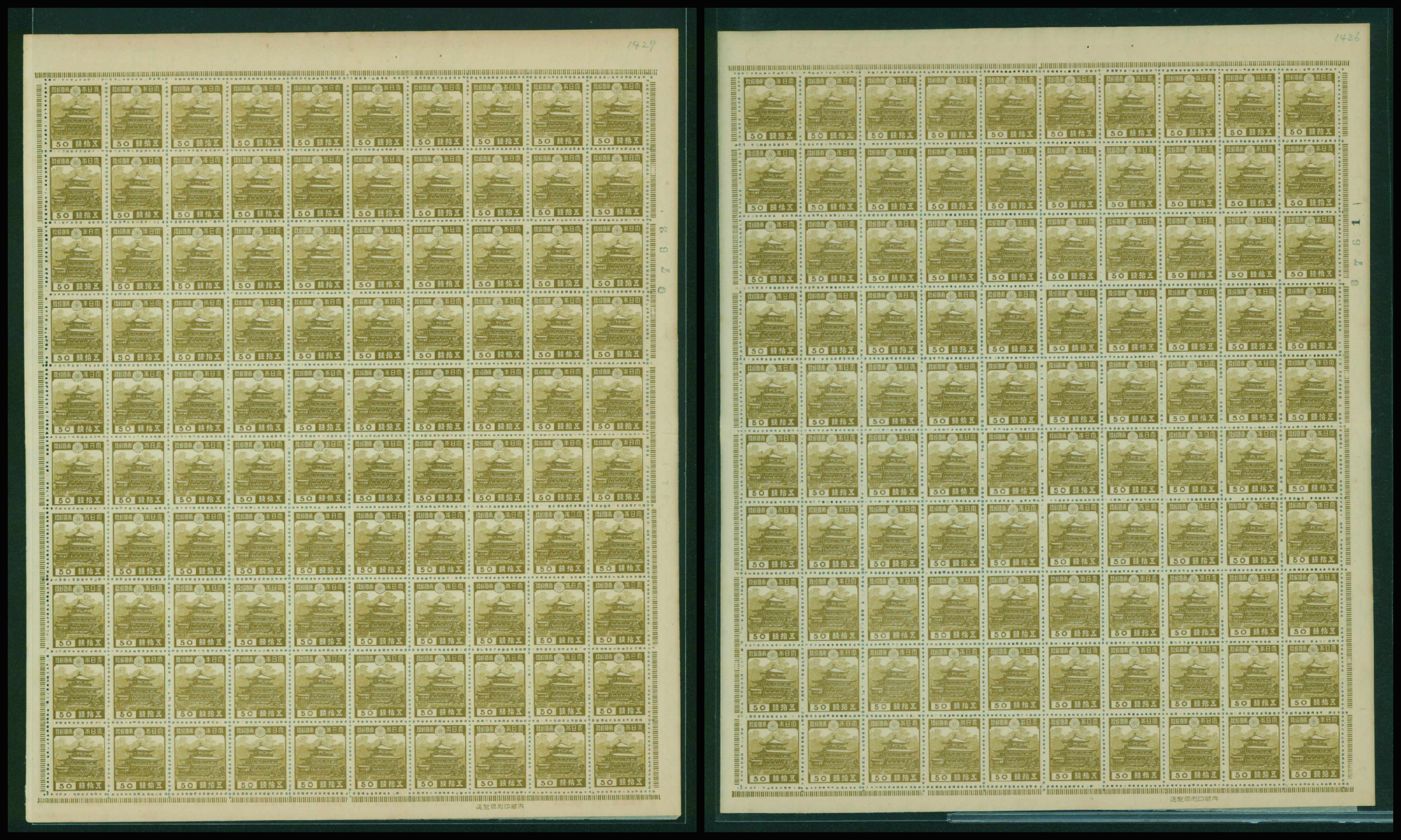 1937-1940 issue 50 Sen unused stained, slip paper attached to the back, 2 sheets (Image1) (Image2)
