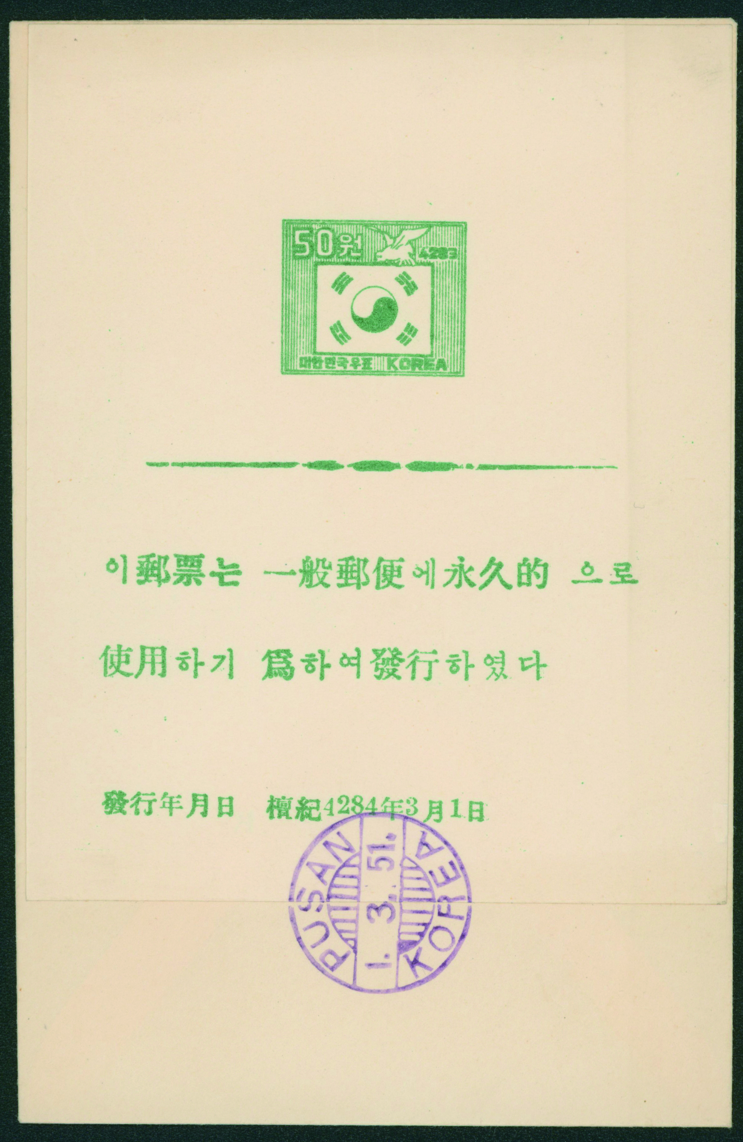 South Korea Second Definitive Issue 50w Presentation Sheet PUSAN 51.3.1 used (Image1) (Image2)