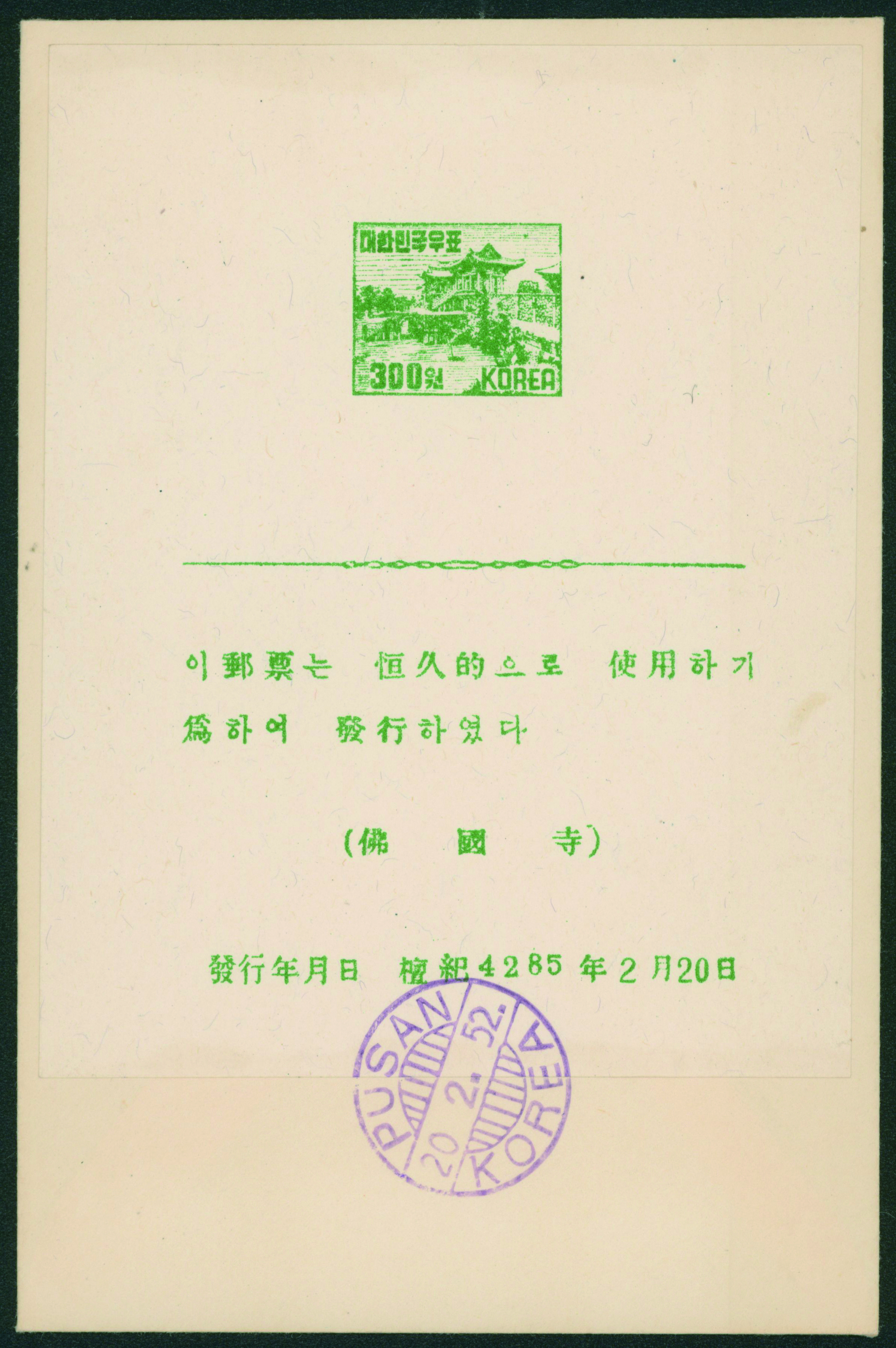 South Korea Second Definitive Issue 300w Presentation Sheet PUSAN 52.2.20 used (Image1) (Image2)