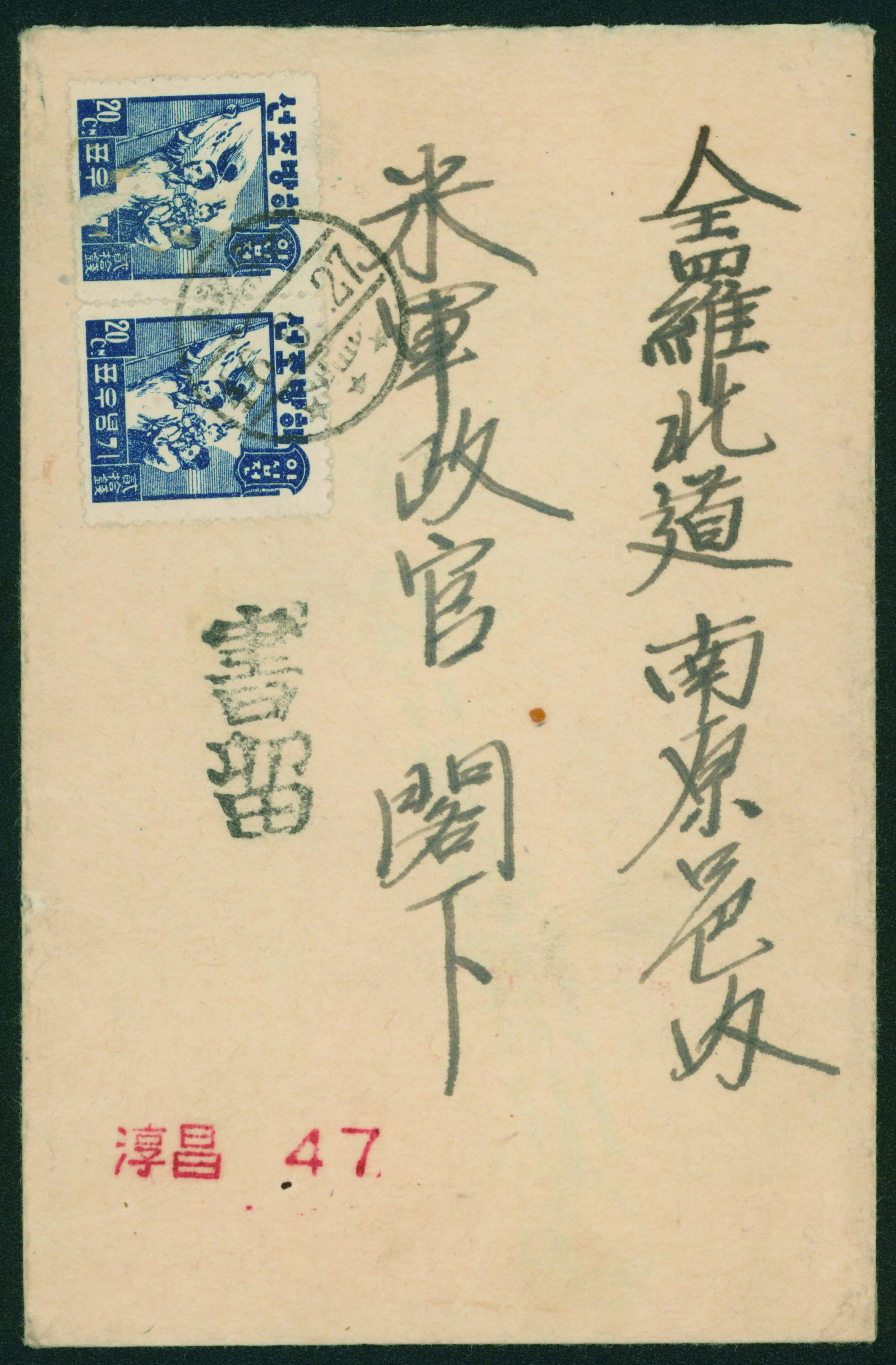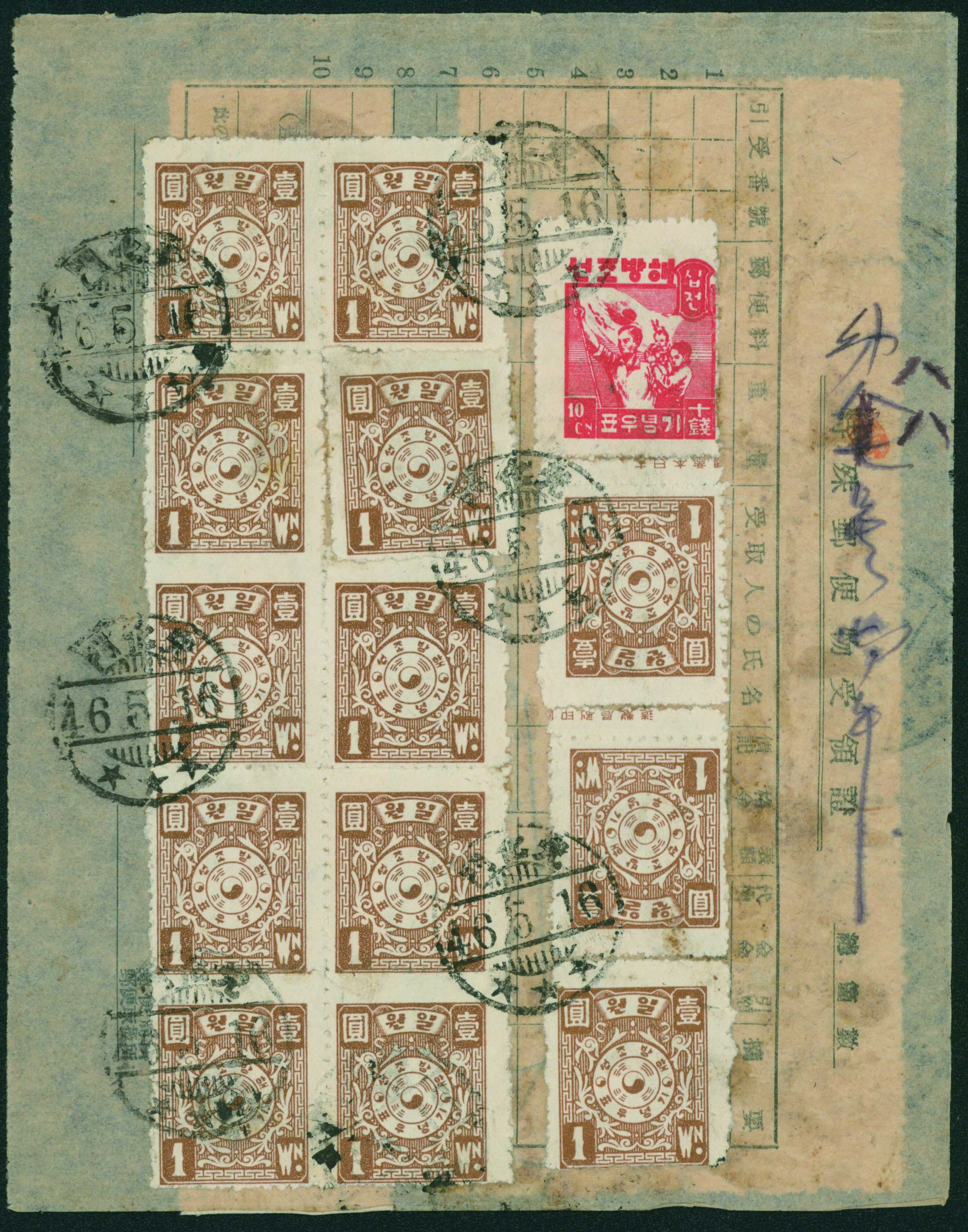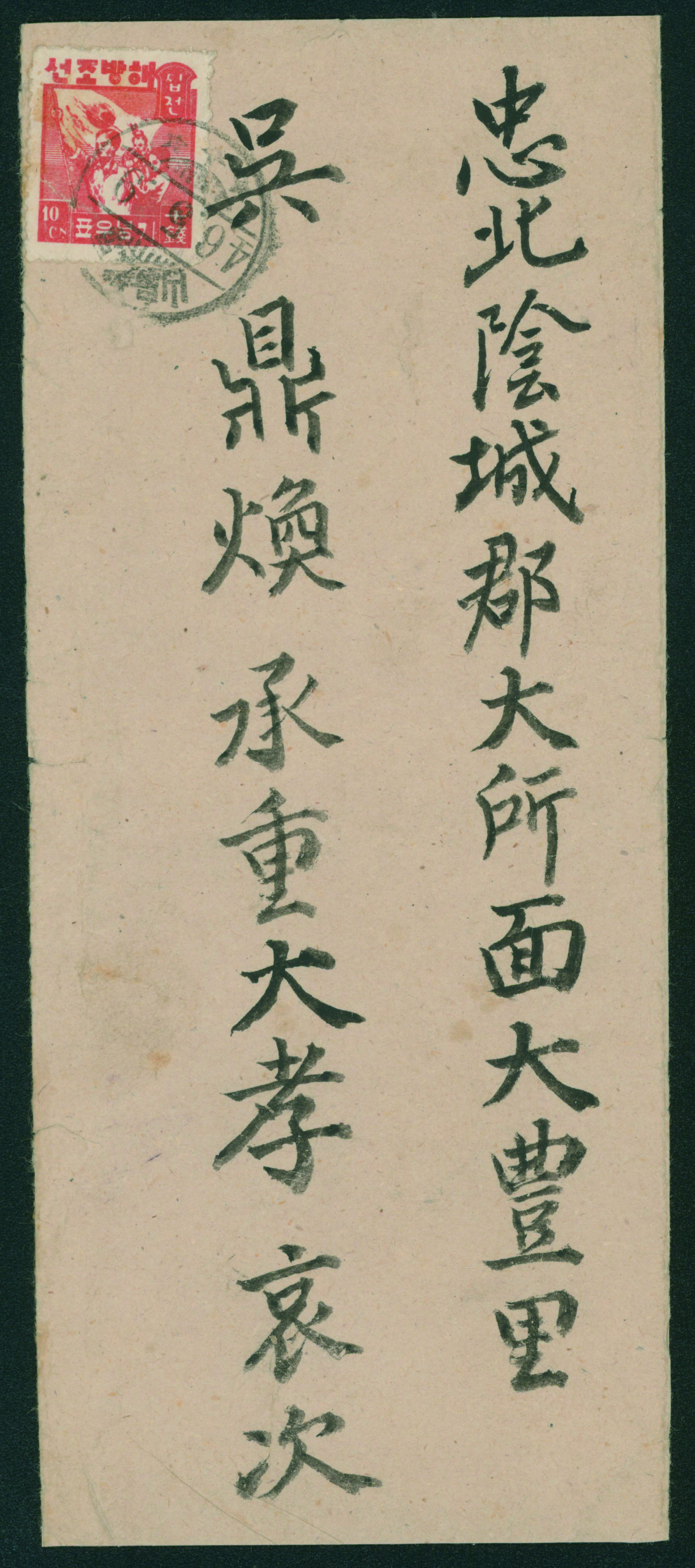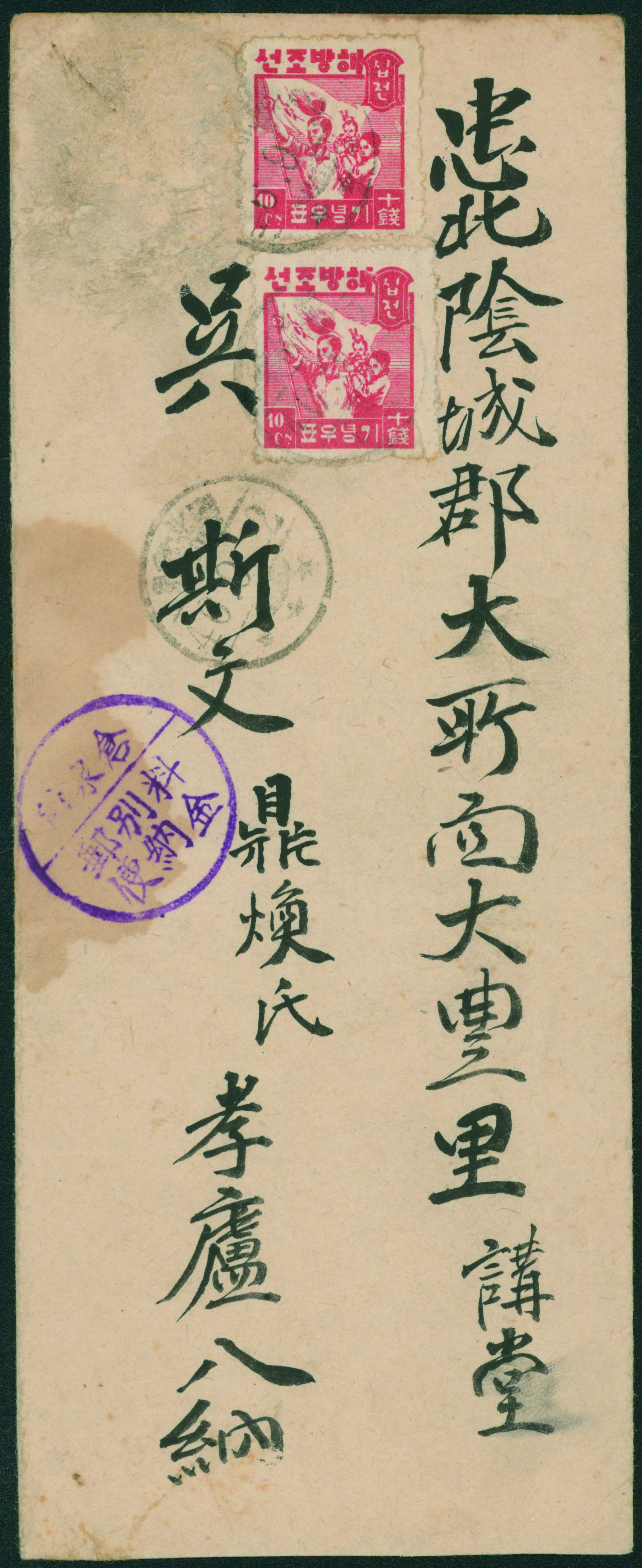 South Korea Liberation Issue 10sen Double Franking+Postage paid usage 慶北倉泉46.9.2 Rare (Image1) (Image2)