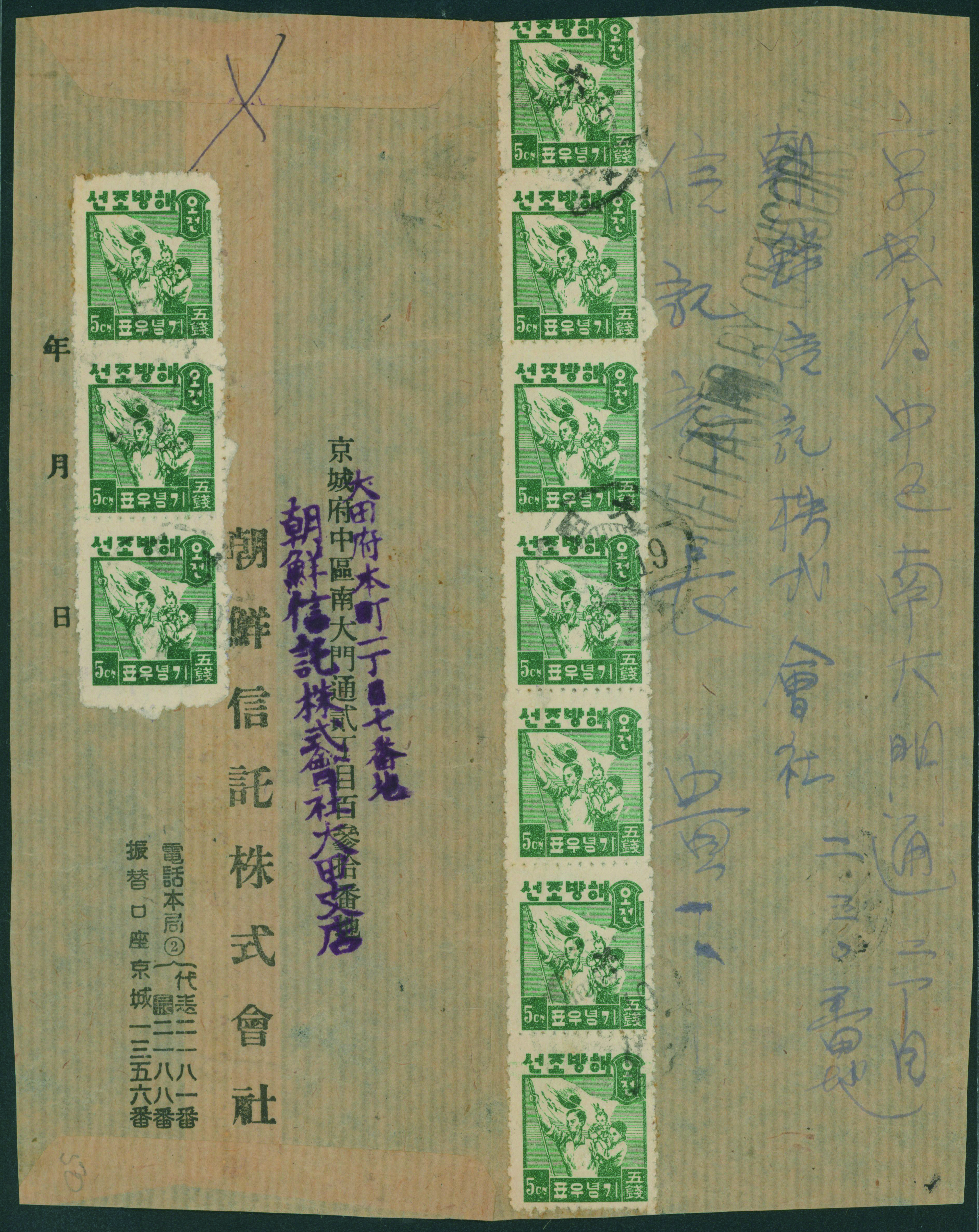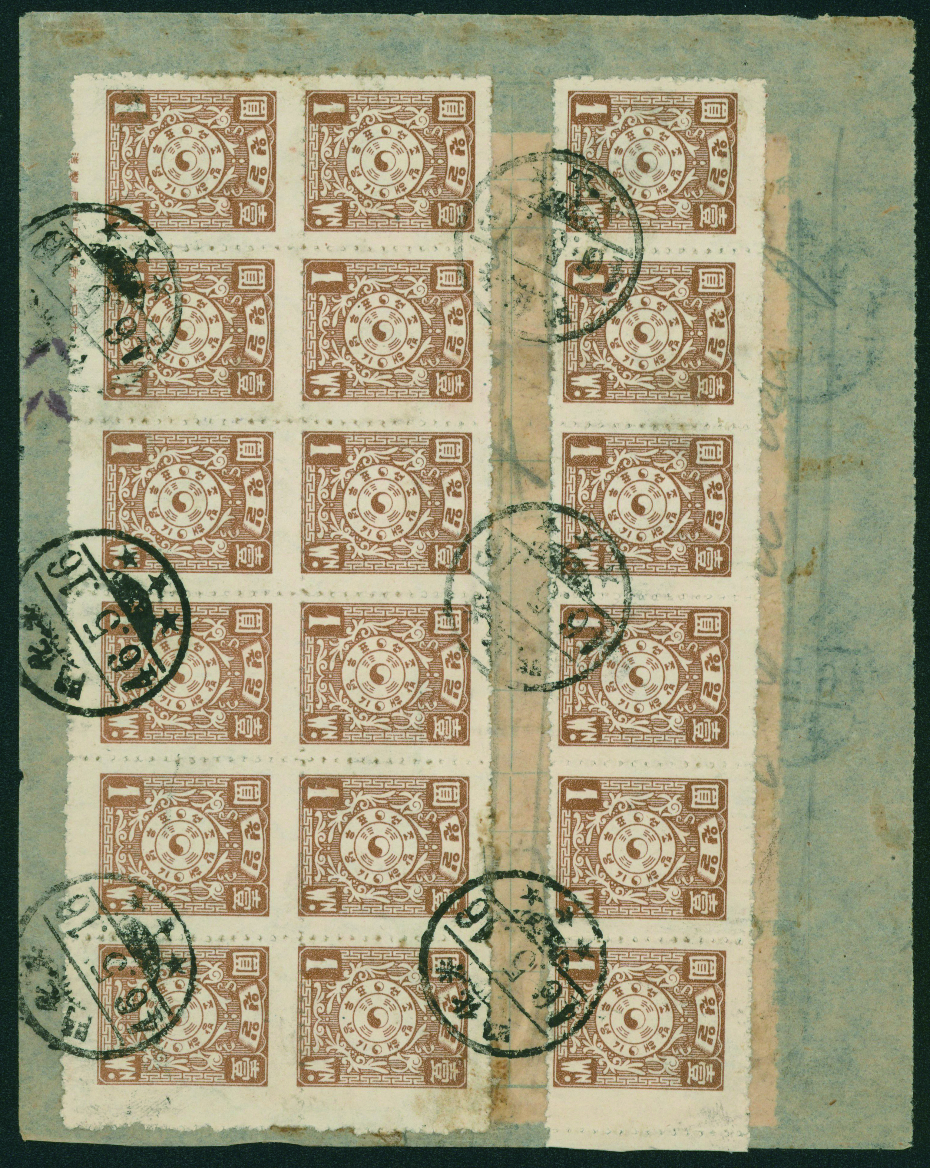 South Korea Liberation Issue Cover 5ch×10 damaged, 1946-09-19 大田 Largest Franking Cover 5ch open