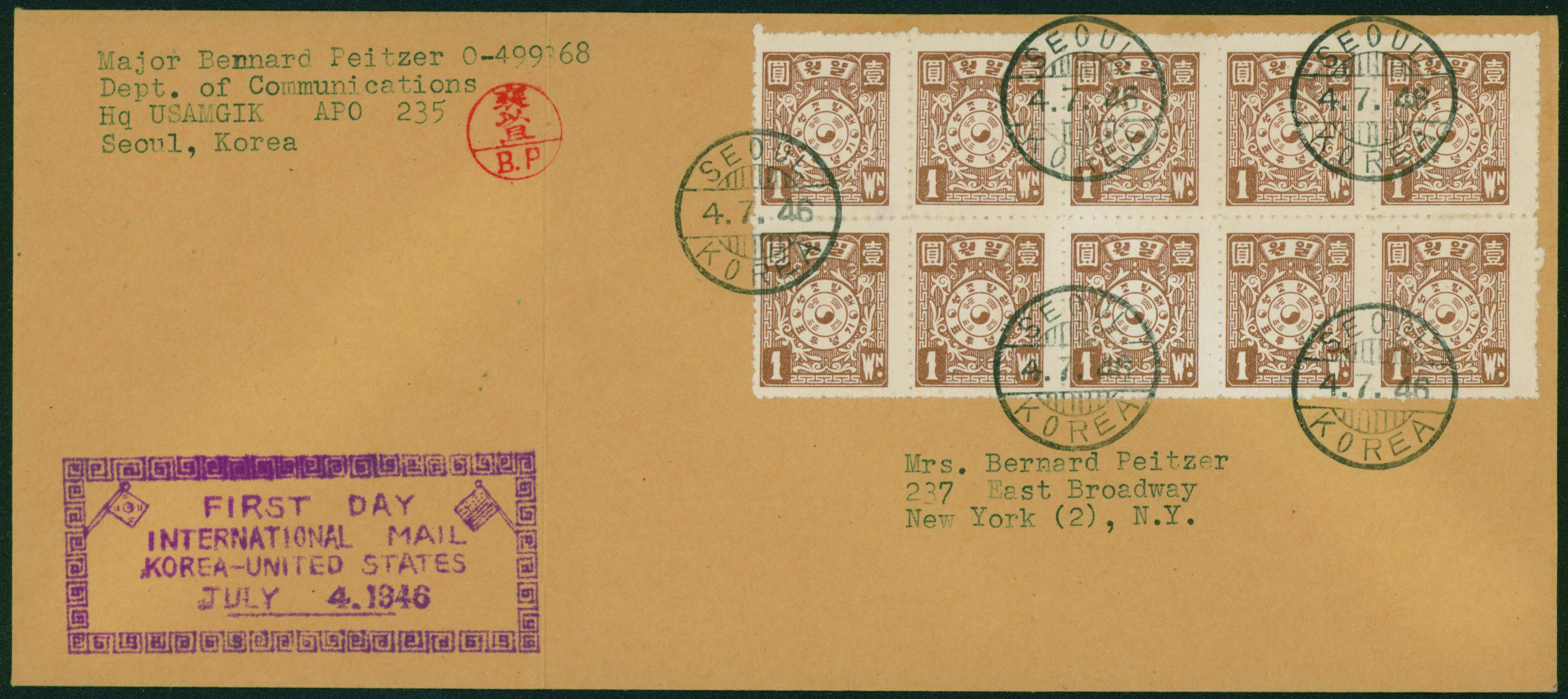 South Korea Liberation Issue 1w Block of 10 Franking Cover to United States SEOUL 46.7.4 with