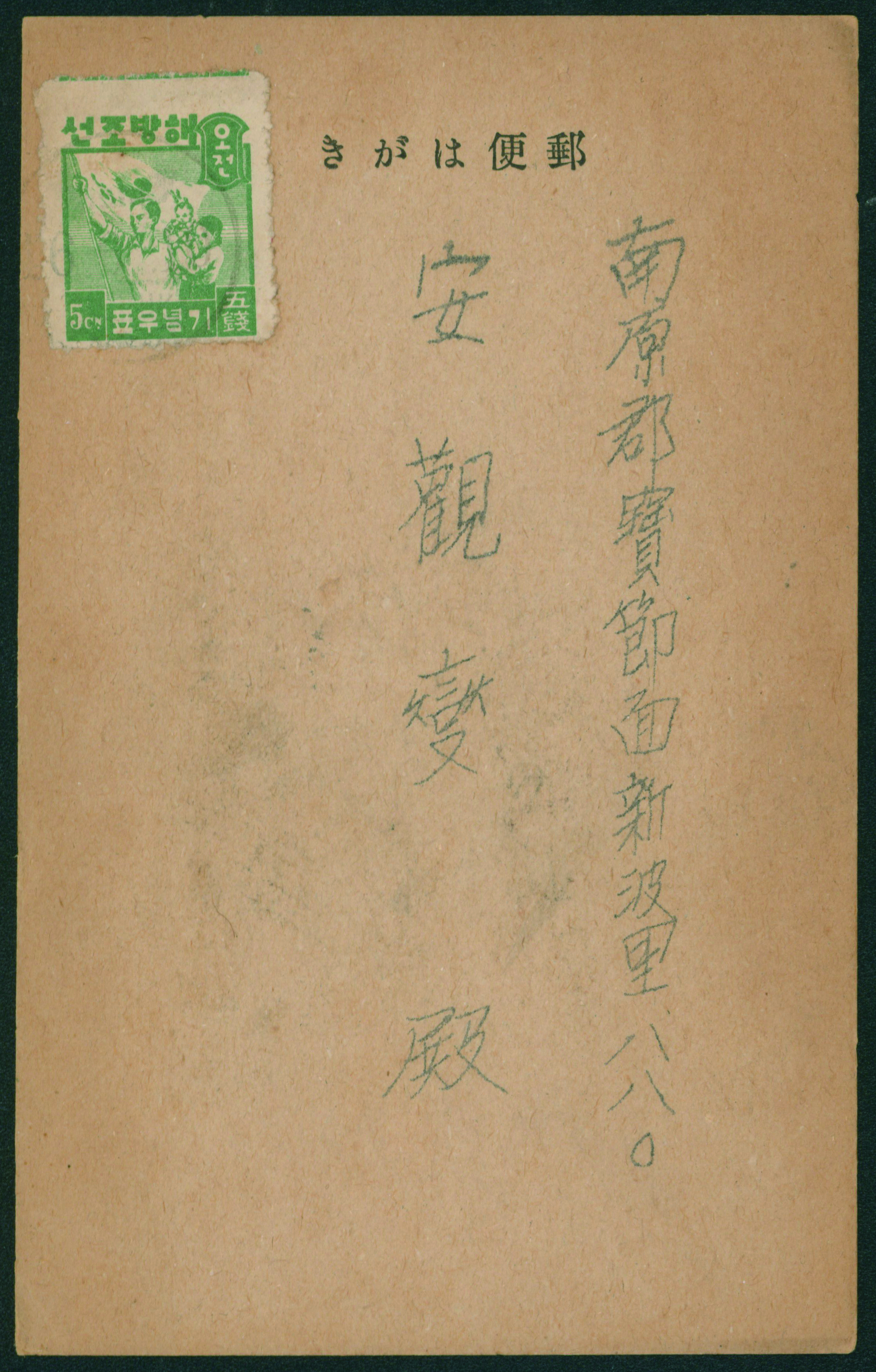South Korea Liberation Issue 5sen postcard 全州46.4.8(Unclear) Only two recorded postcards single