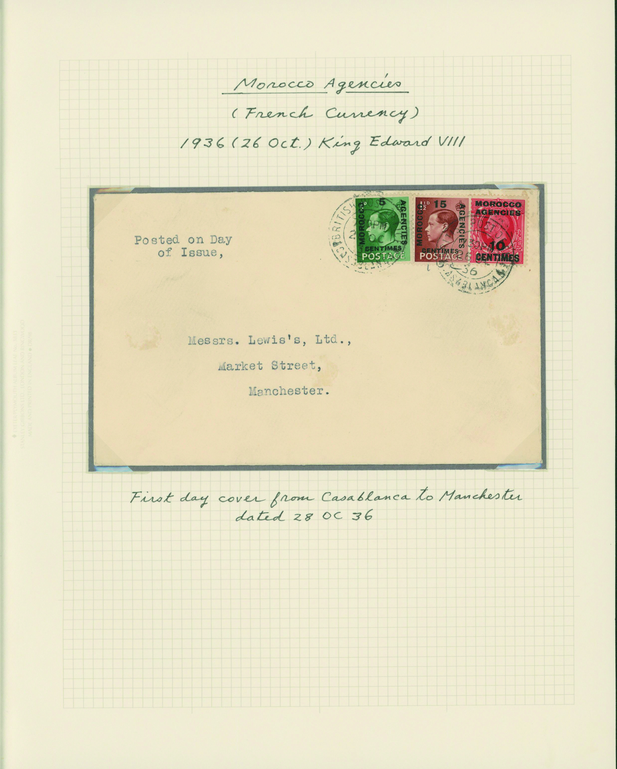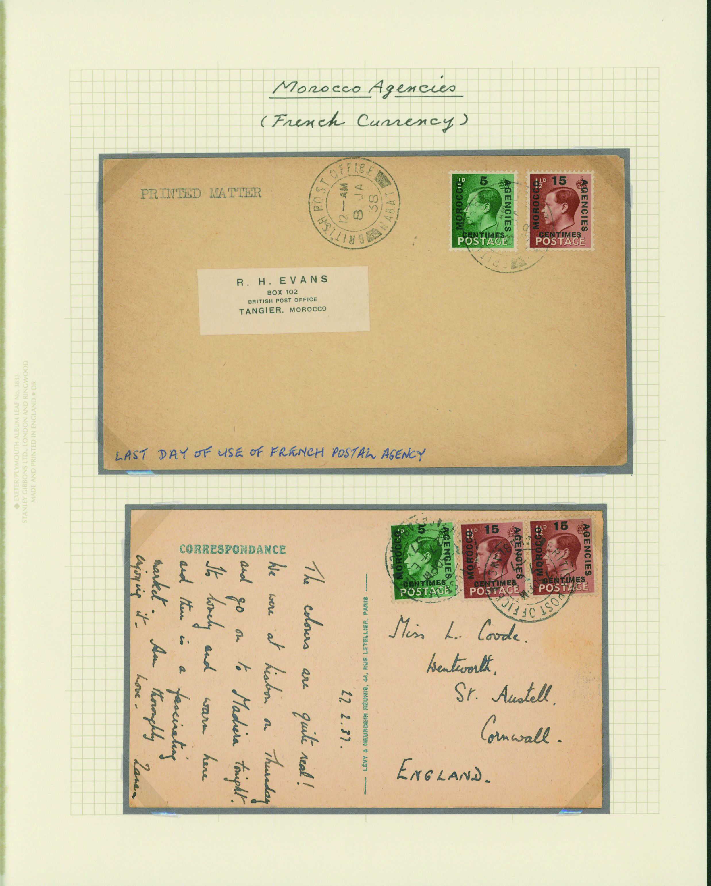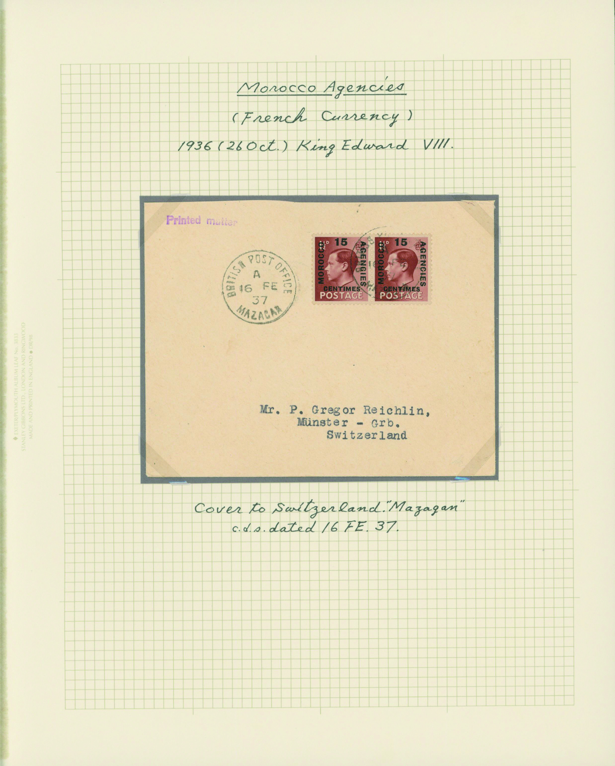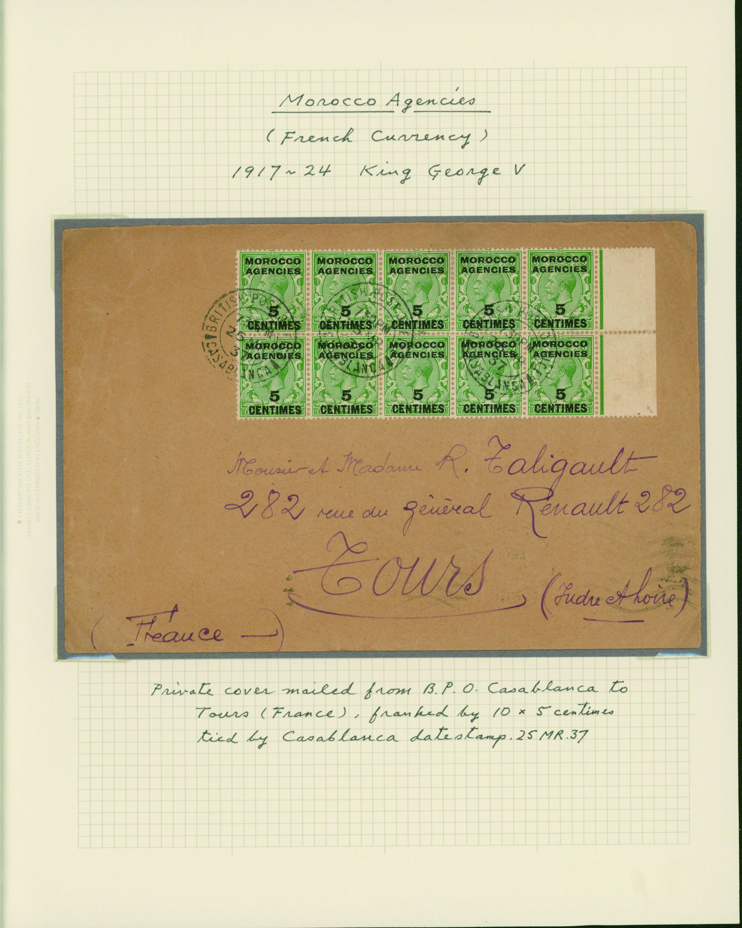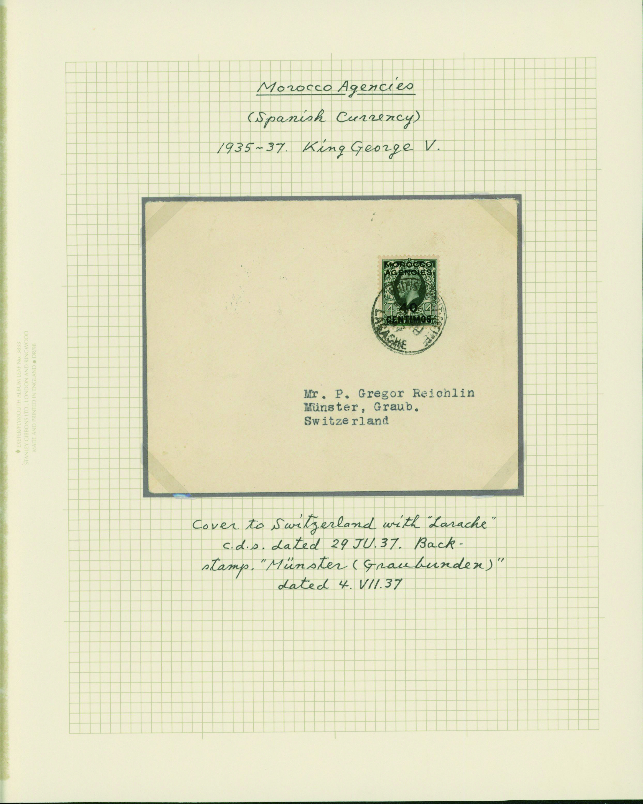 1128   imageUK British Post offices in Morocco, Spanish currency 1935-1937 7 pages, 6 covers YouTube (Image1) (Image2) (Image3) (Image4) (Image5) (Image6) (Image7) (All Images)