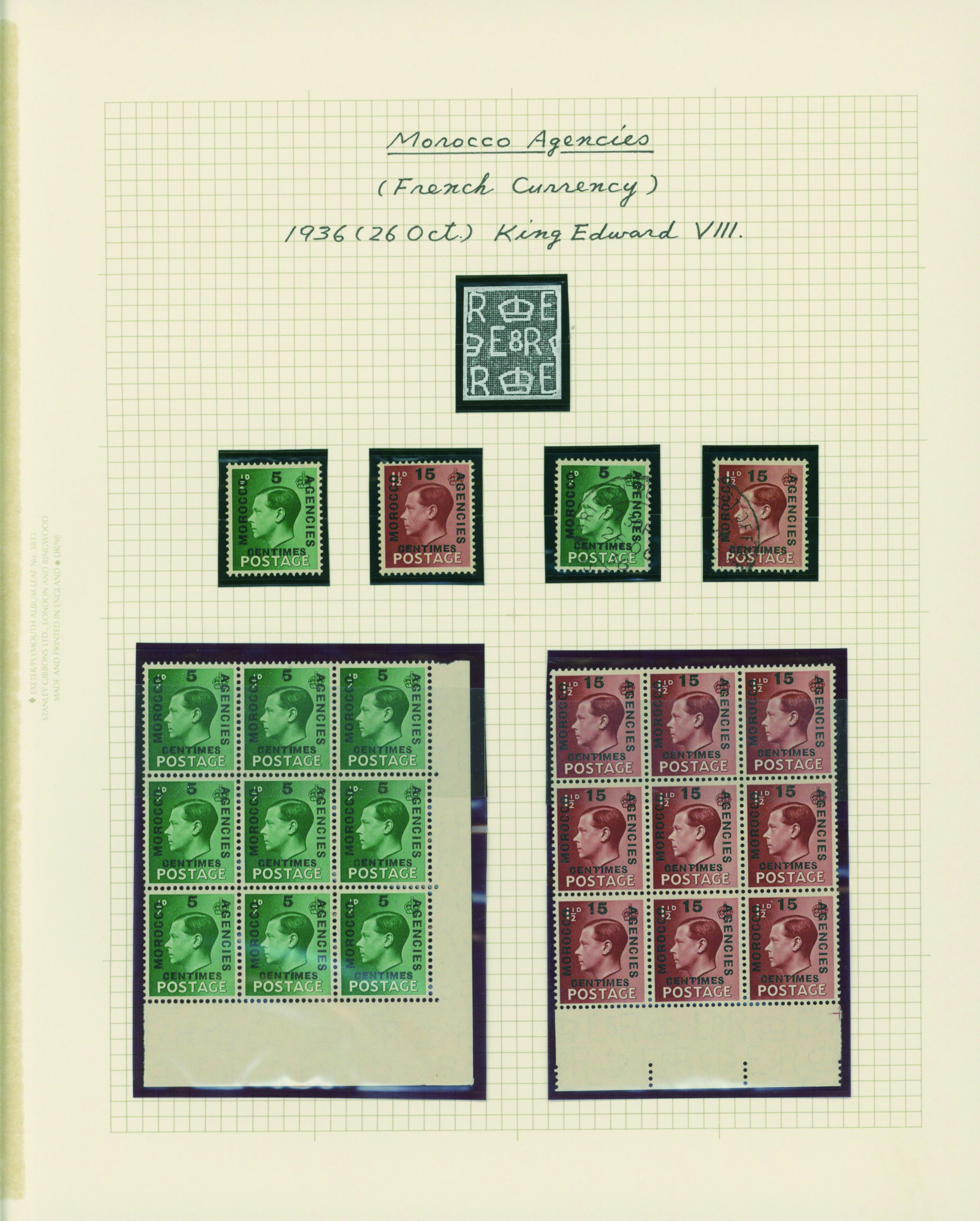1137   imageUK British post offices in Morocco, French currency 1936 KE VIII 5 leaves, 4 covers (Image1) (Image2) (Image3) (Image4) (Image5) (Image6) (All Images)