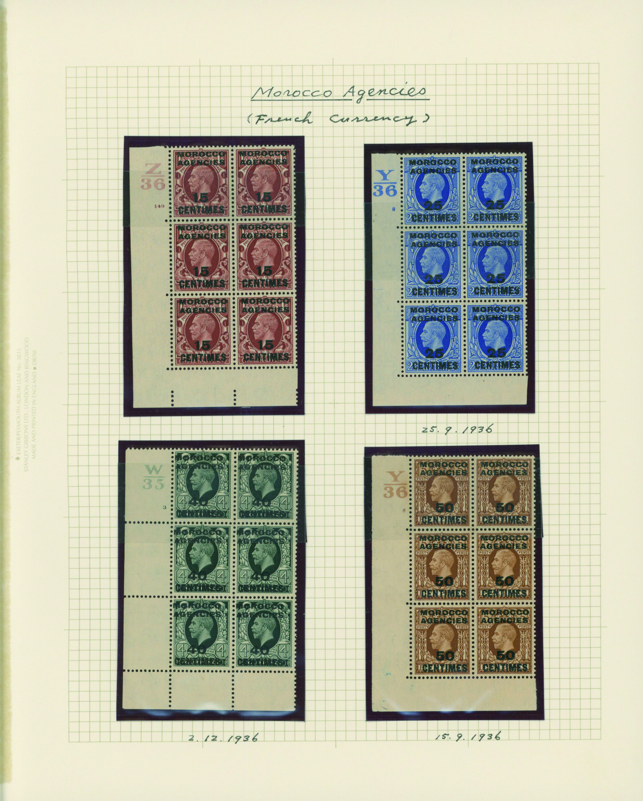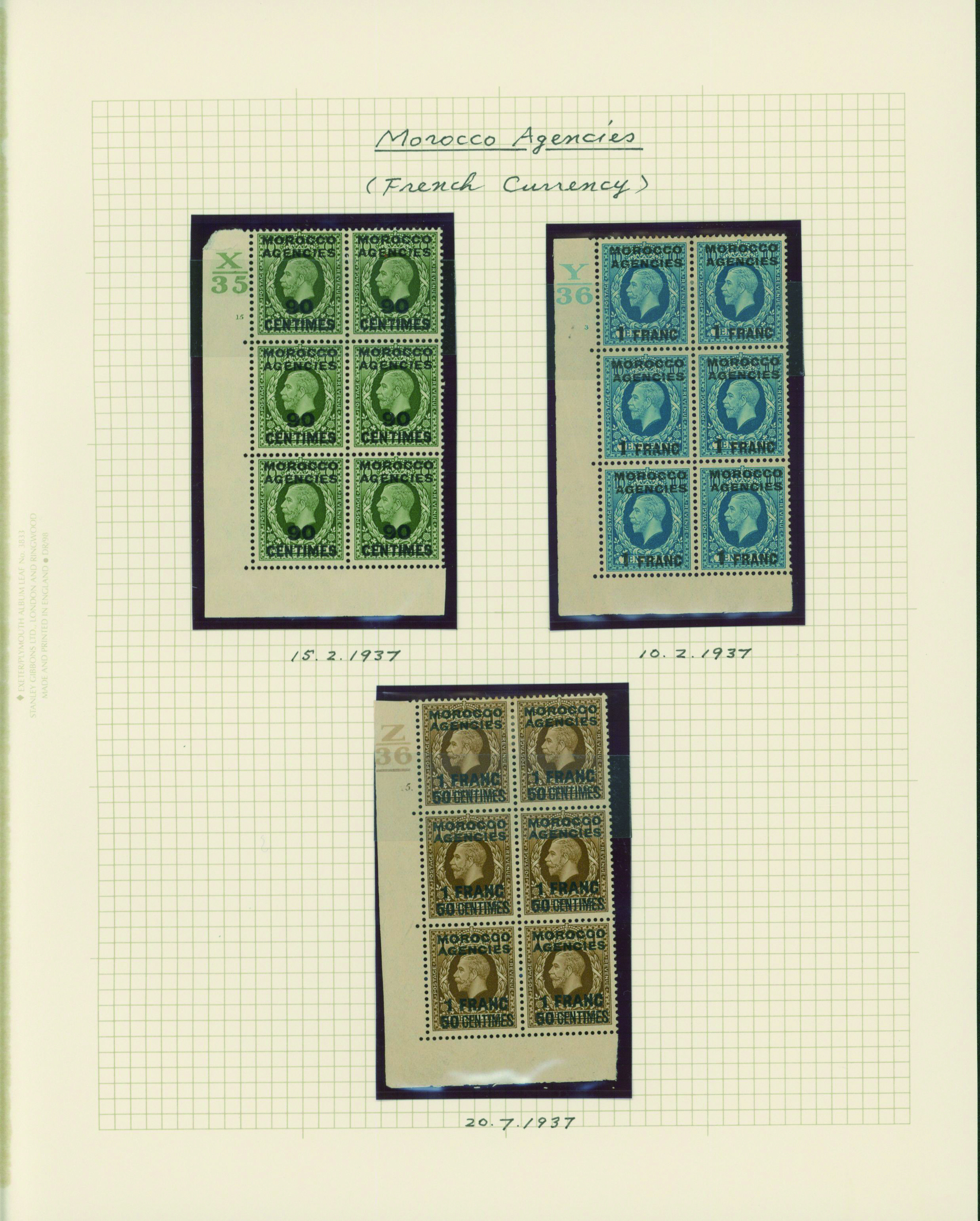 1135   imageUK British post offices in Morocco, French currency KGV 6 leaves Plate number blocks and etc mainly unused with some used, (Image1) (Image2) (Image3) (Image4) (Image5) (Image6) (Image7) (All Images)
