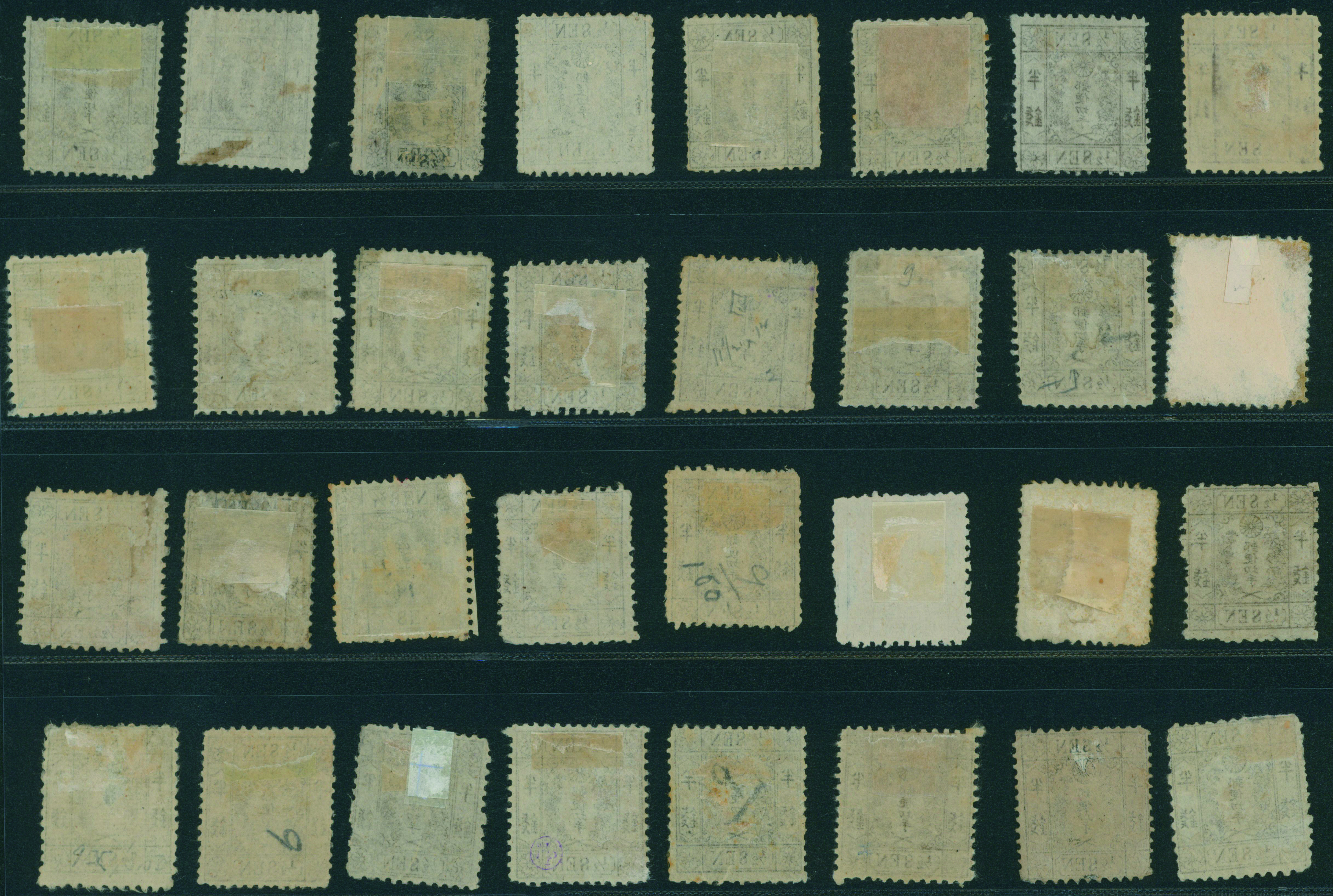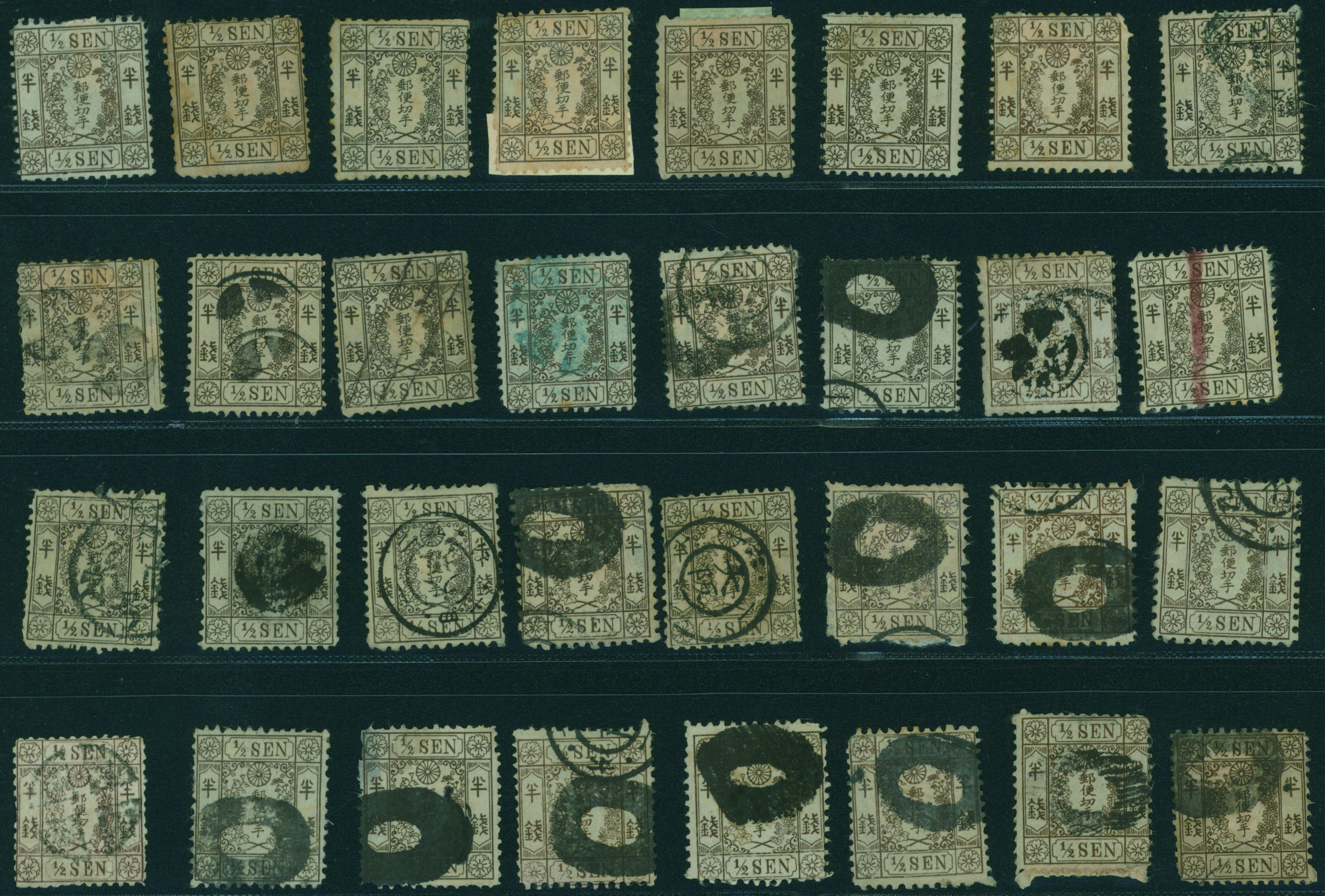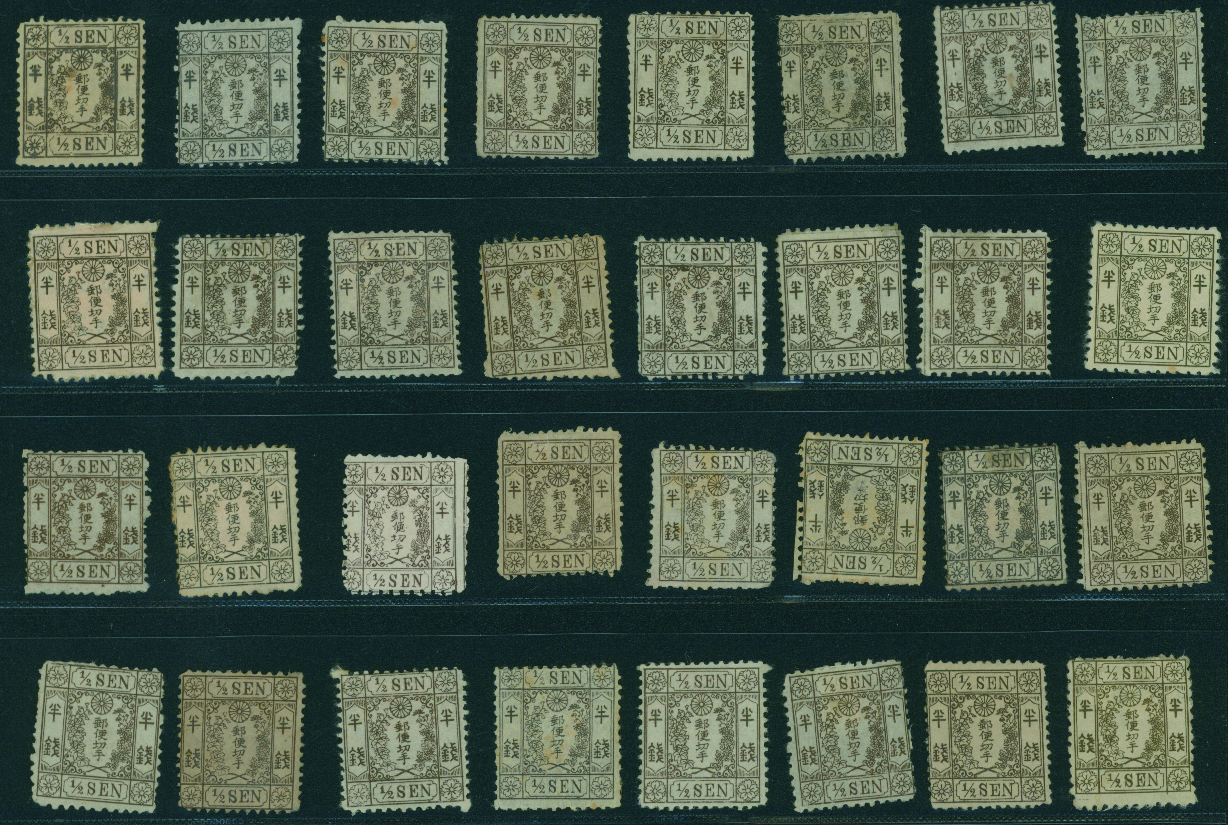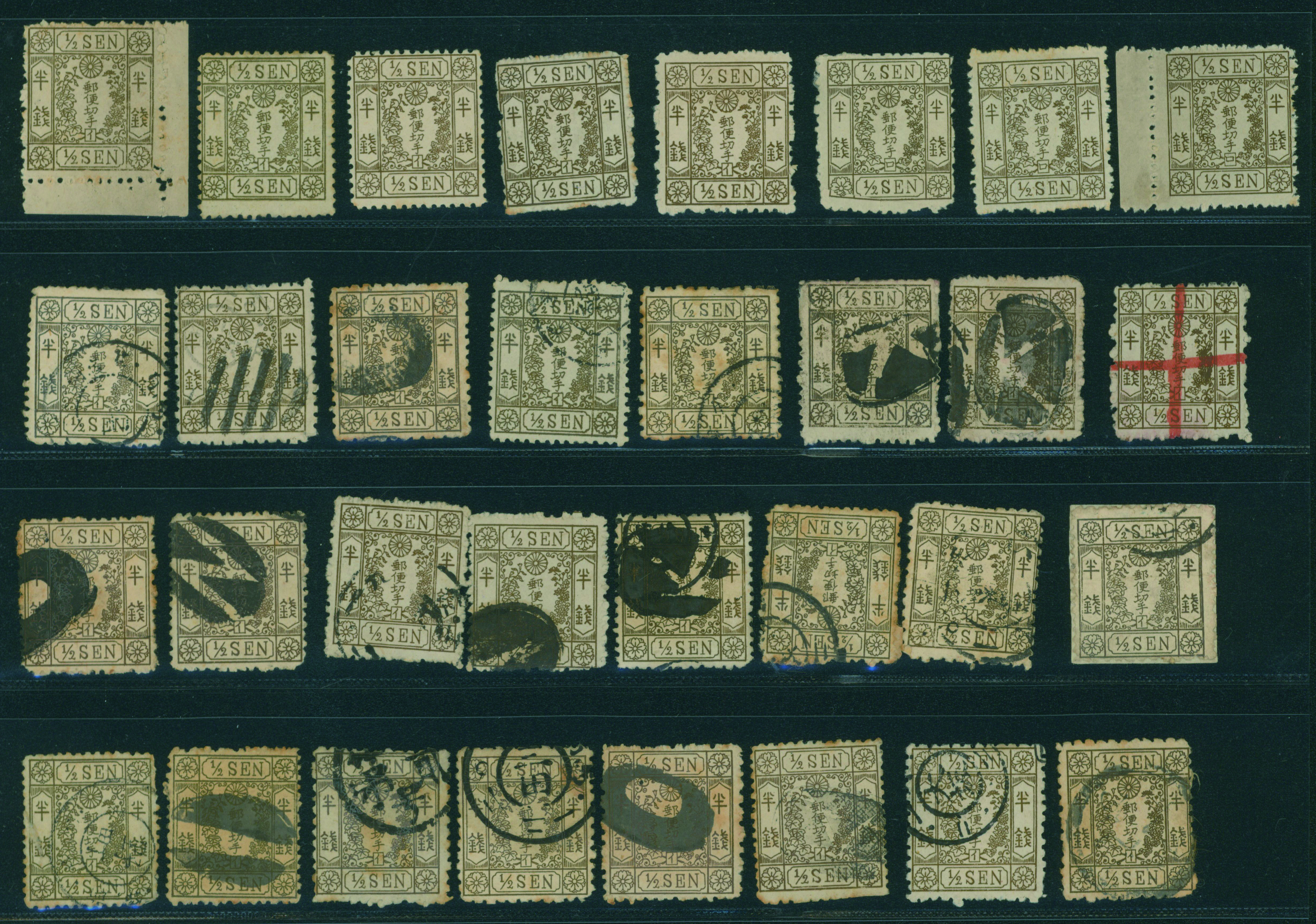 1874 Cherry Blossom Imported Paper half Sen brown with kana (32) mixed condition of unused and