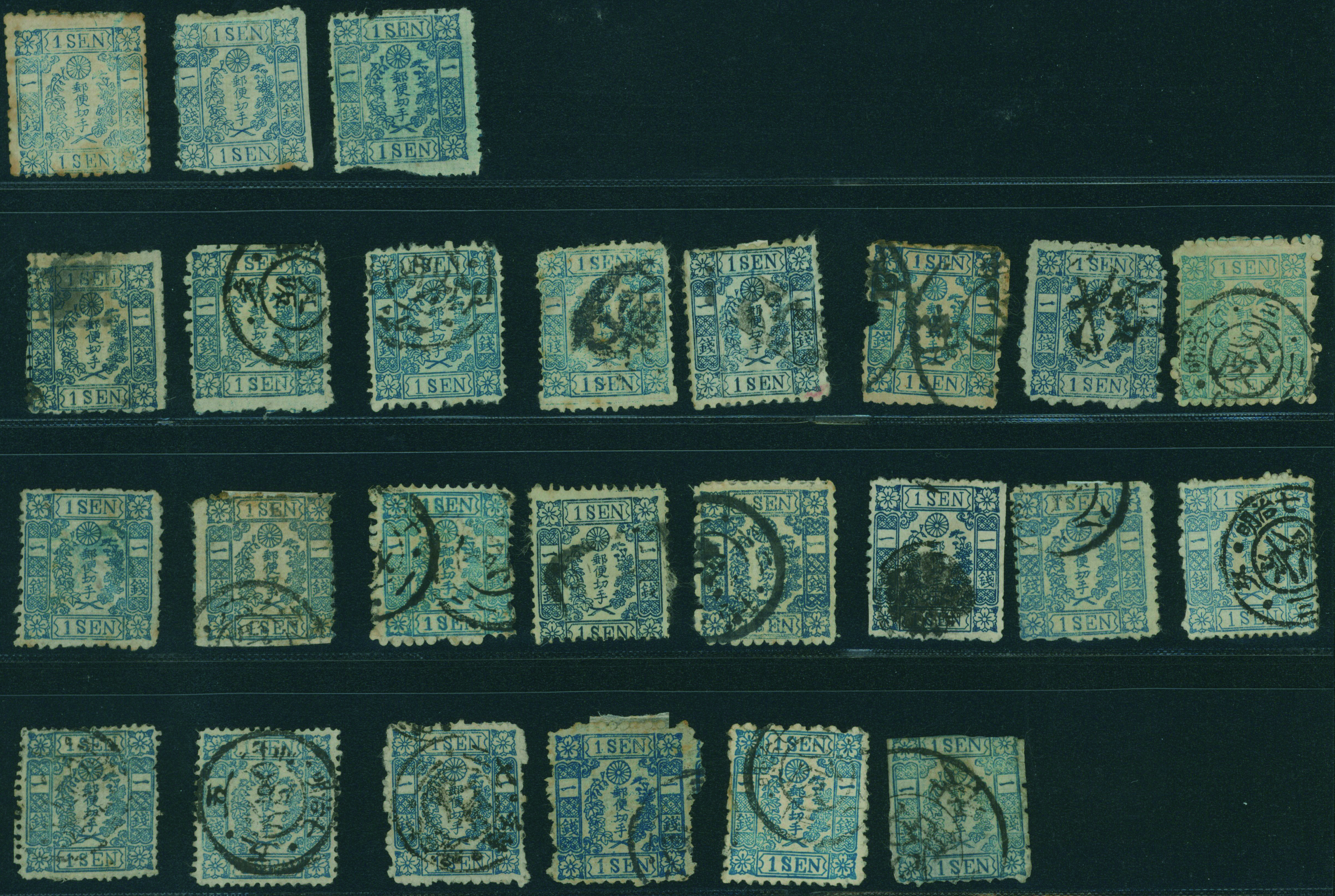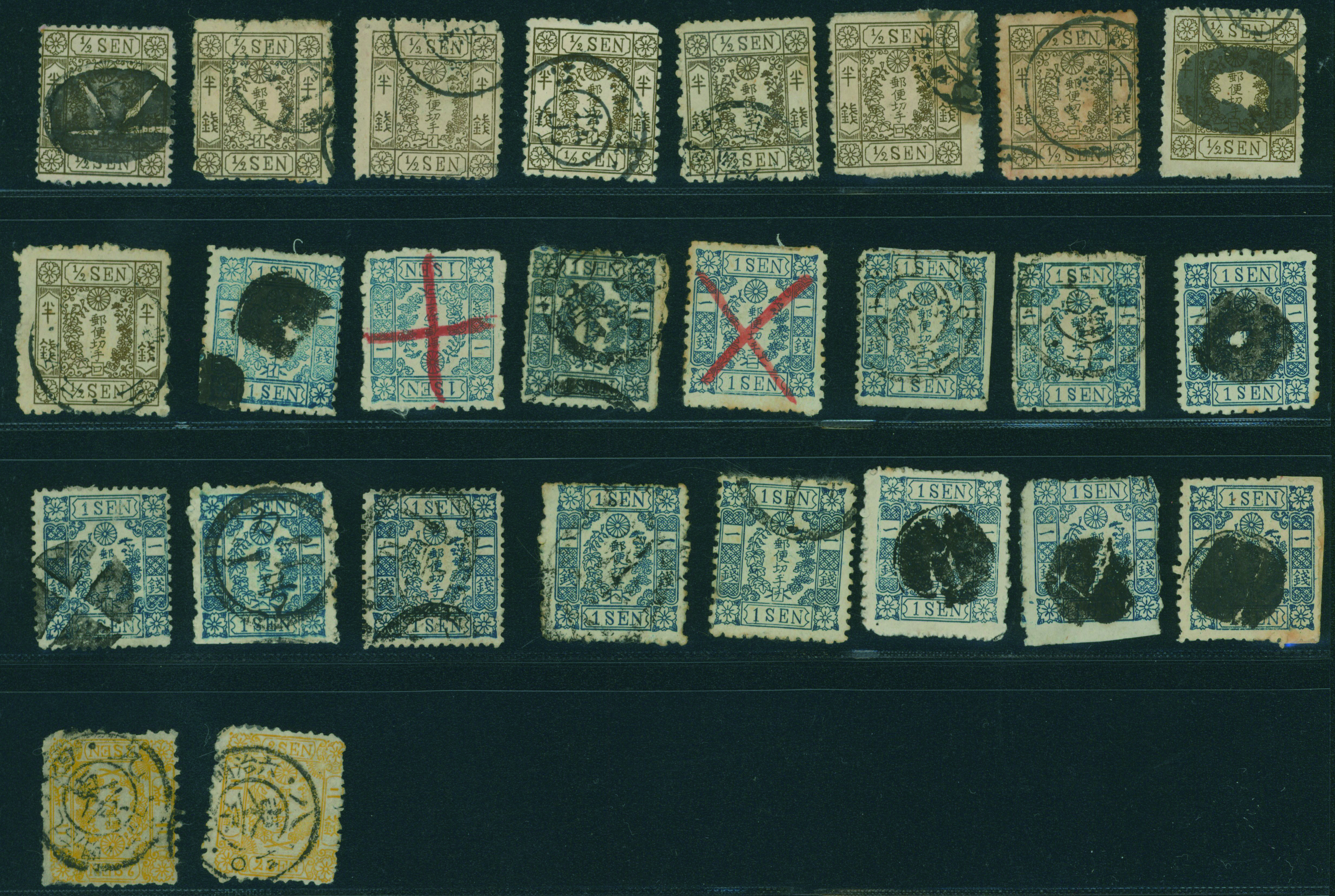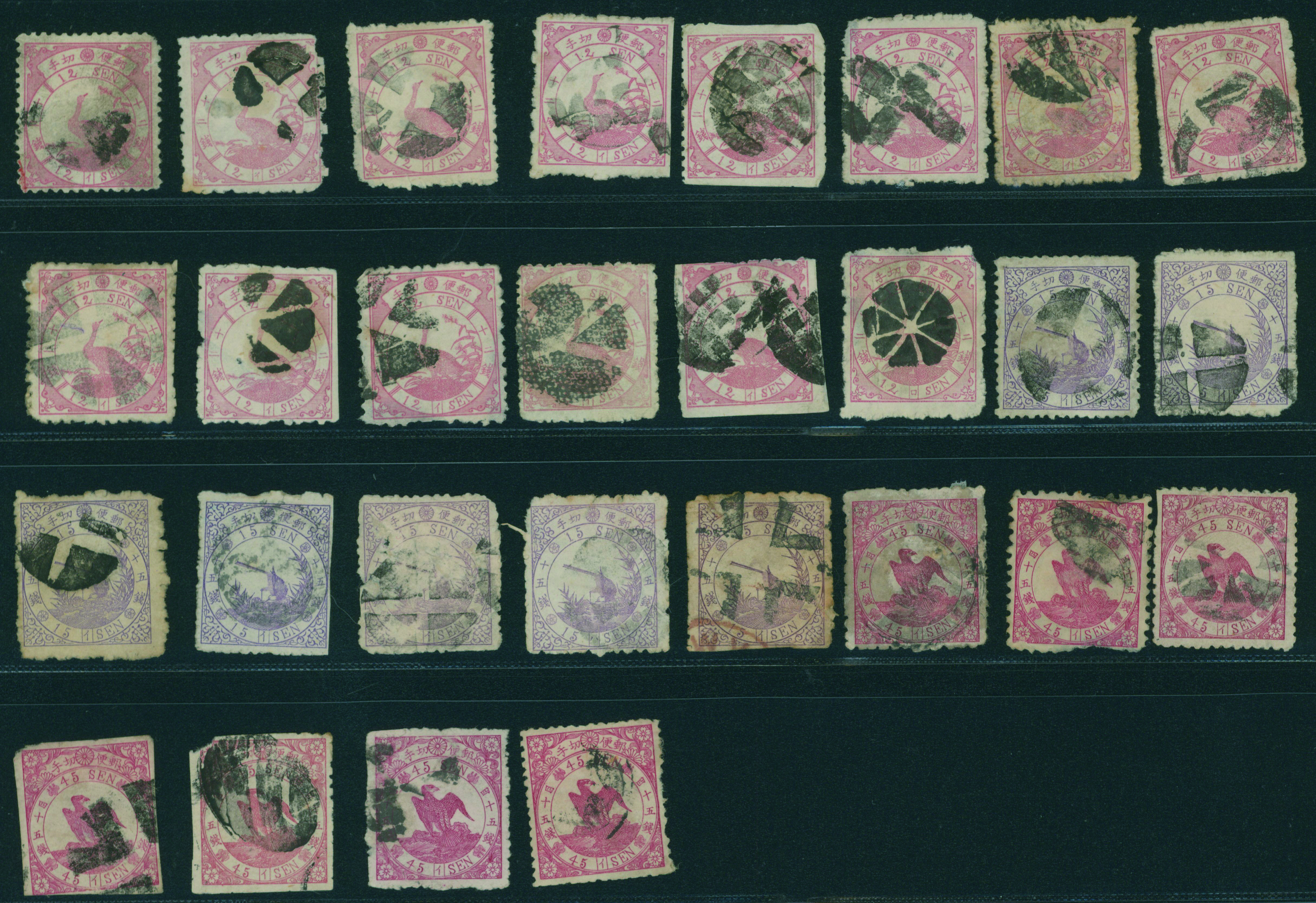 1875 Bird issue 12 Sen, 15 Sen, 45 Sen 28 examples used cancelled by obliteration (Image1) (Image2)