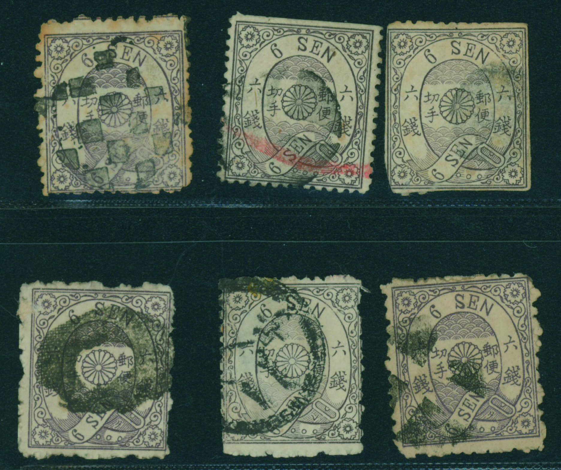 1874 Cherry Blossom Imported Paper 6 Sen with kana (6) used cancelled by obliteration numeral