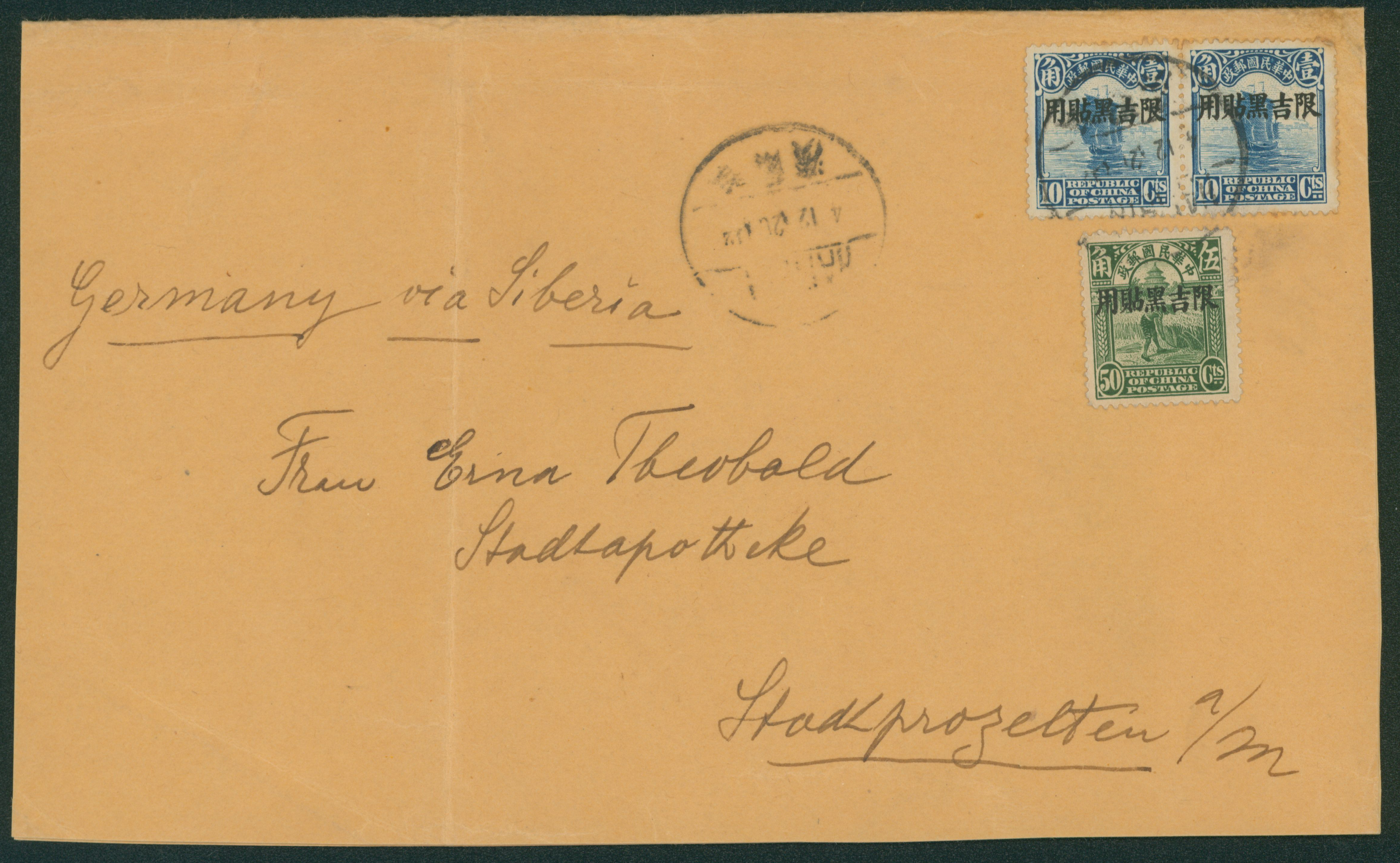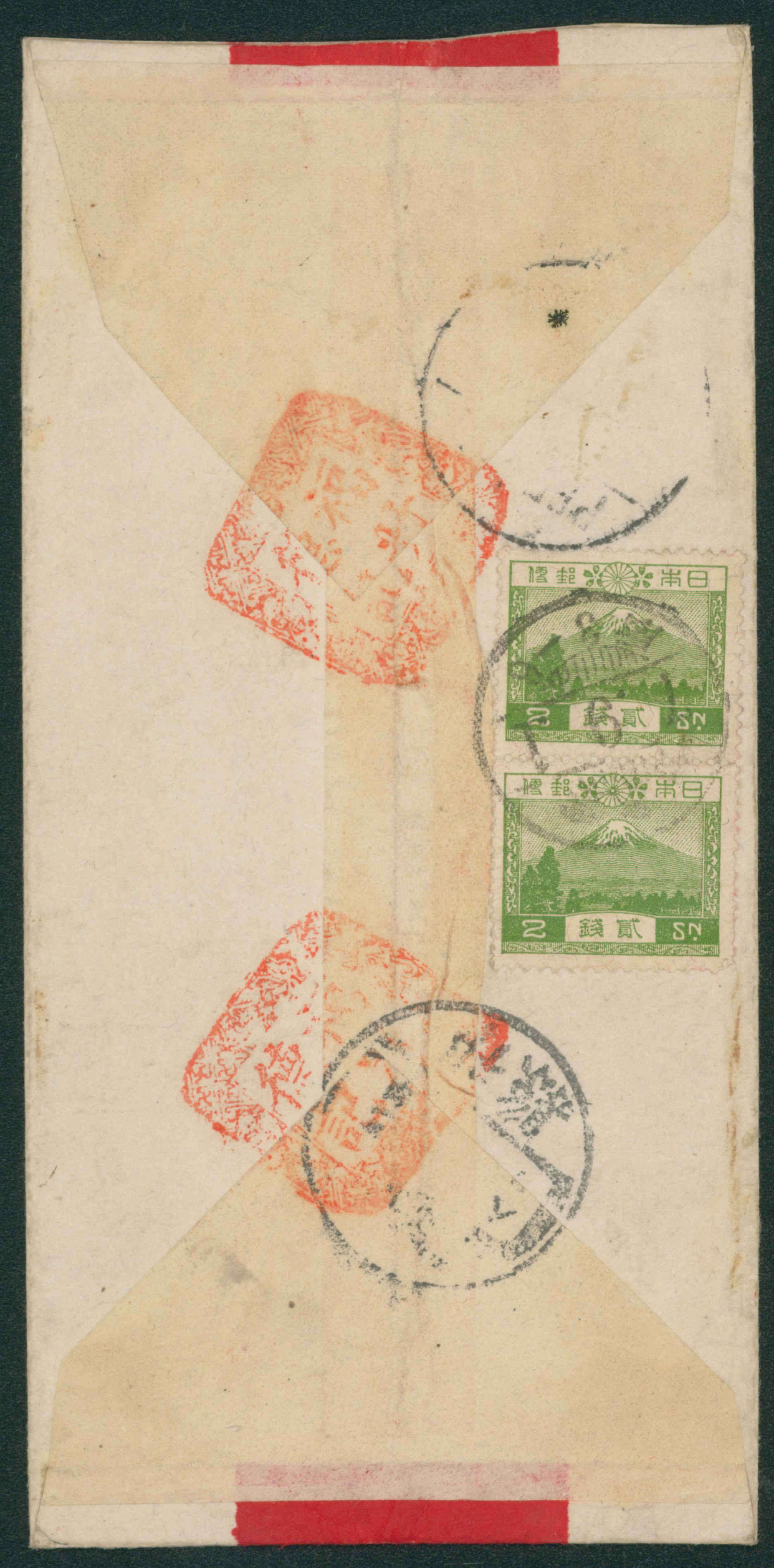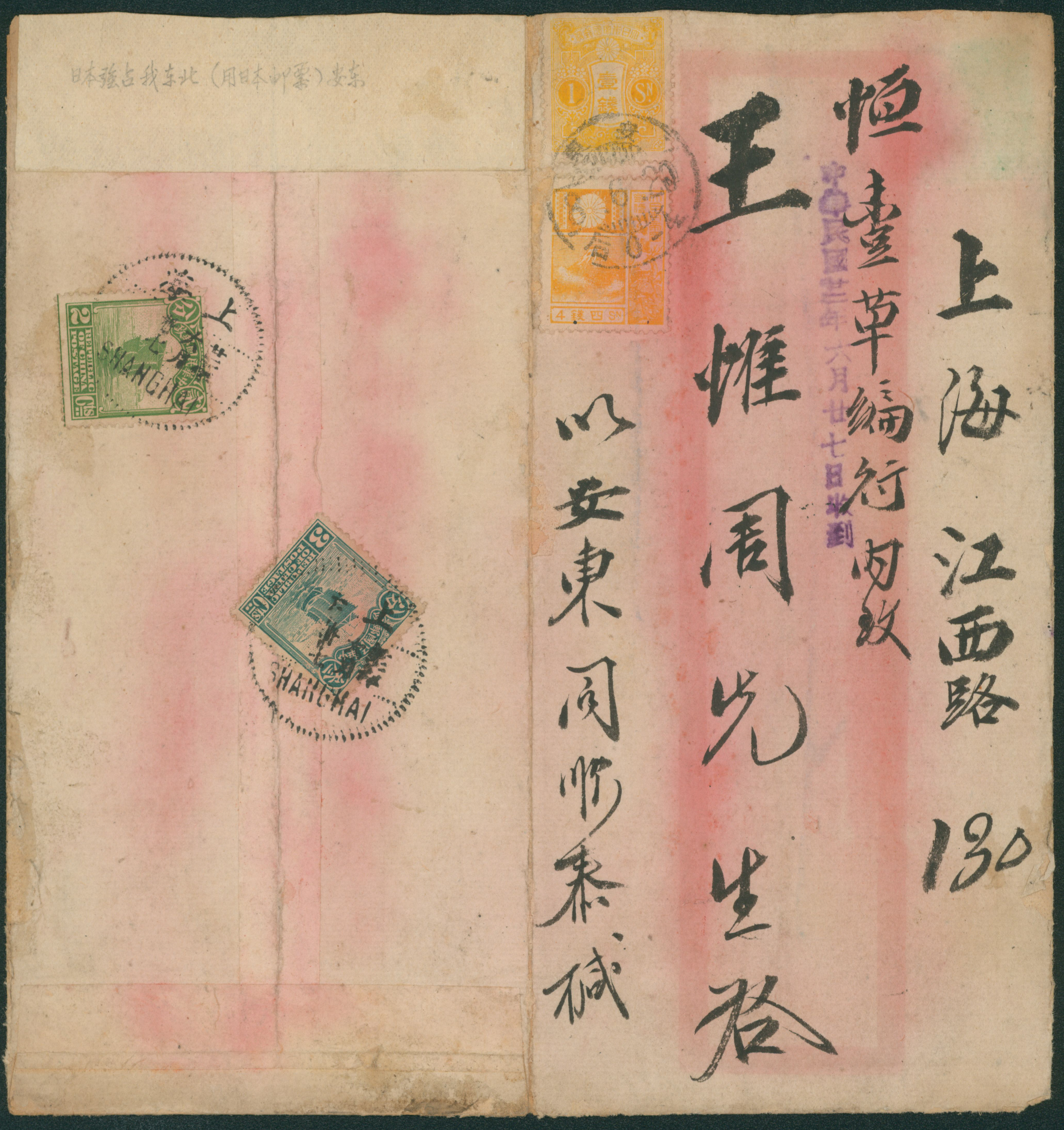 203 167,192 image1926-1931 The fifth issue, 3rd period, flat printer 1 Sen, 1930-1931 Landscape issue, die II 4 Sen orange damaged, cancelled by comb cds 1933-06-20 Anton to Shanghai open cover, (Image1) (Image2) (All Images)