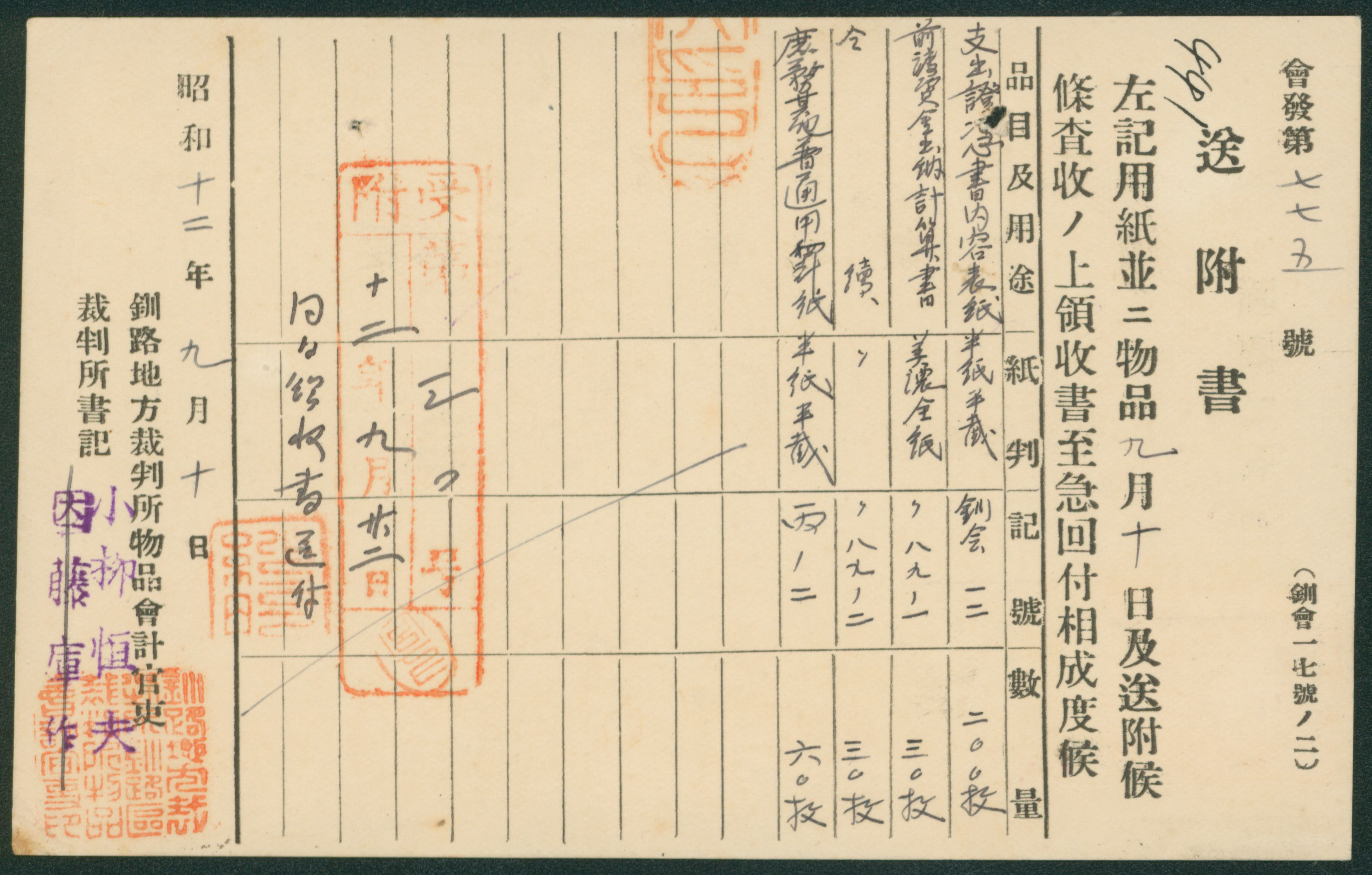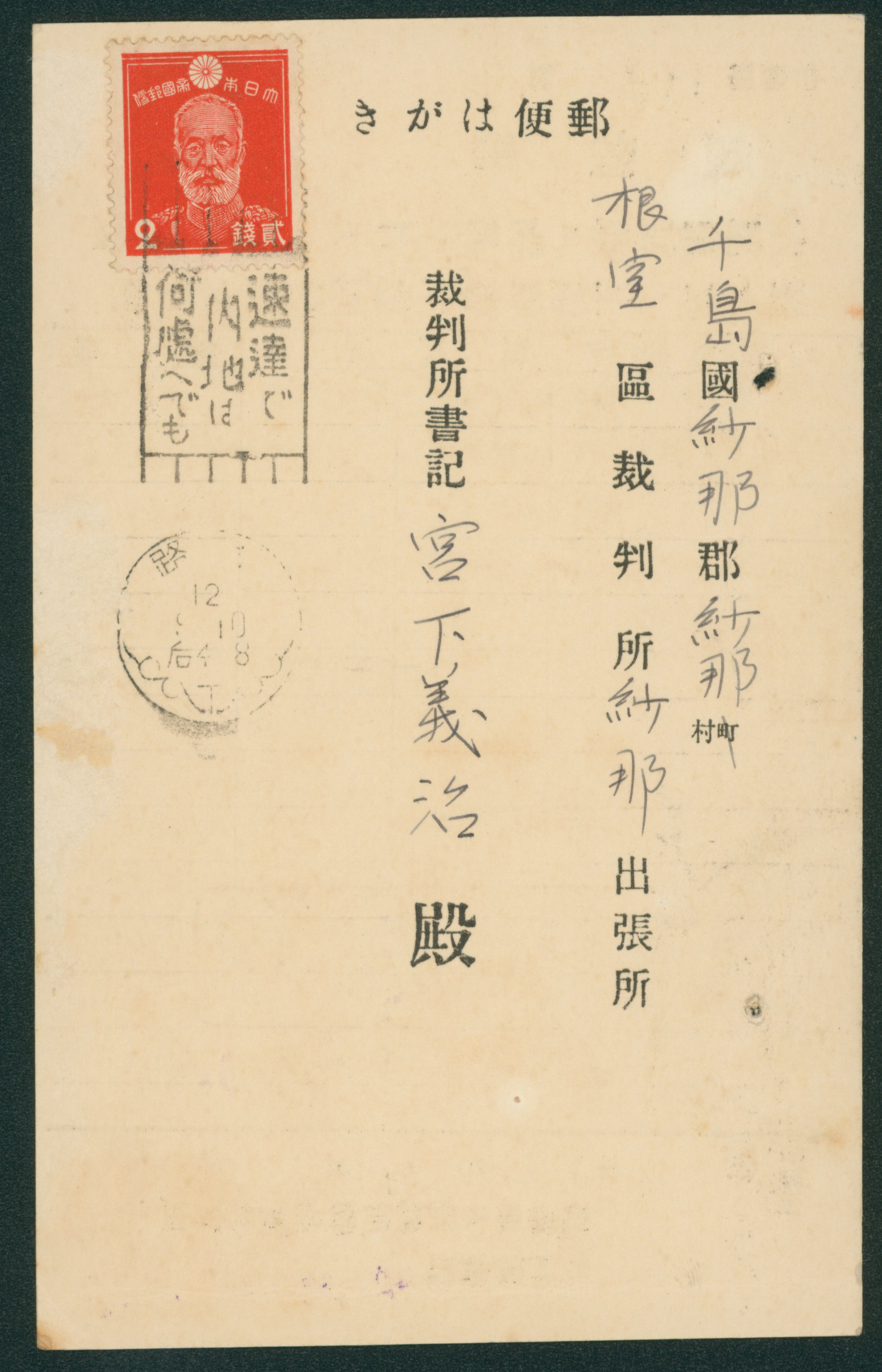 208 223 image1937-1940 issue 2 Sen single franking cancelled by machine cancellation 1937-09-10 Kushiro to 根室区裁判所紗那出張所(千島) cover having holes, (Image1) (Image2) (All Images)