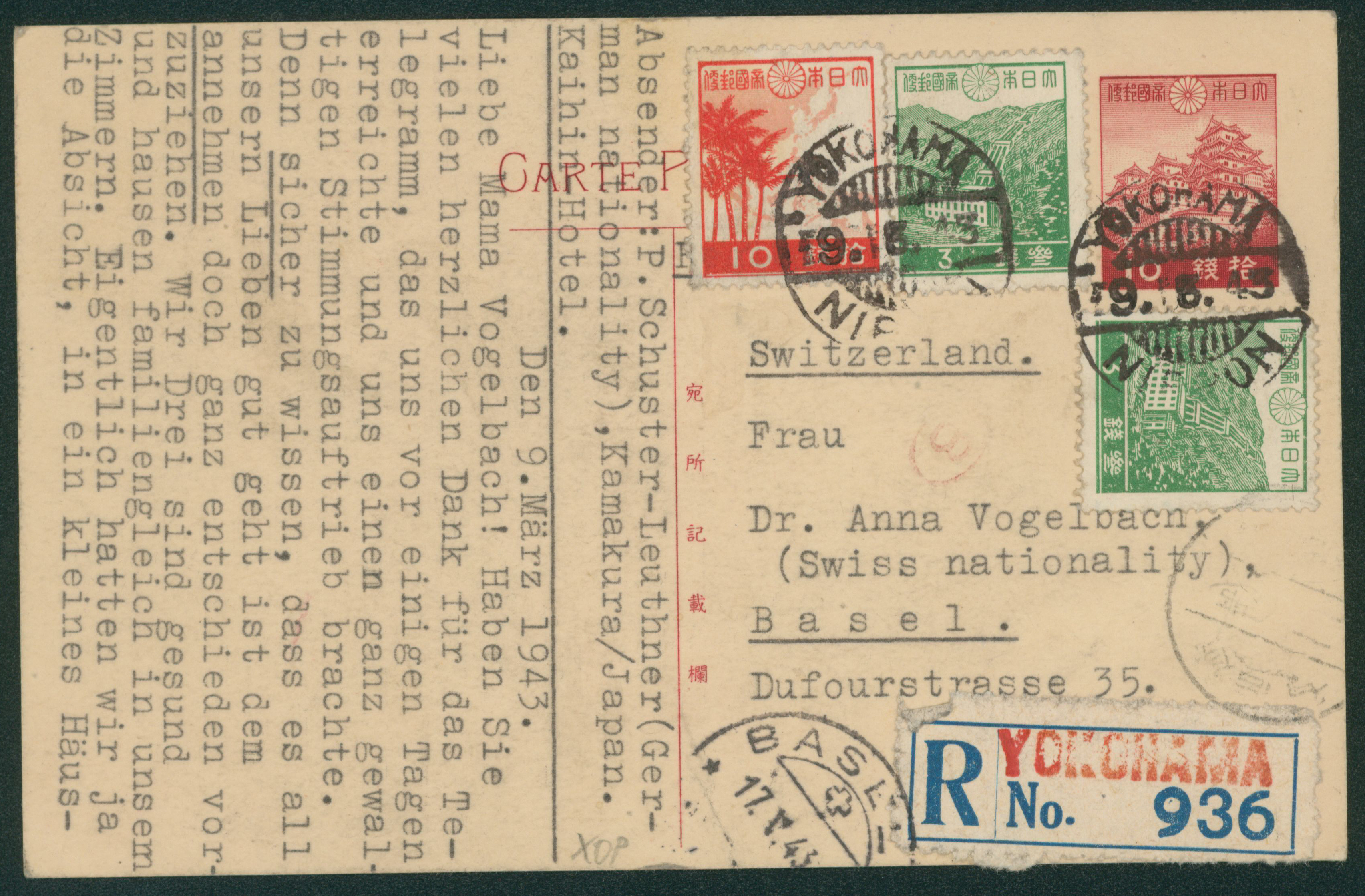 220 FC24,224(2),255 imageSurface Postcard 1940 issue 10 Sen, 1937-1940 issue 3 Sen, wartime issue 10 Sen red cancelled by roman letter comb cds in black 1943-03-19 YOKOHAMA to Switzerland arrival :BASEL censored (Image1) (Image2) (All Images)