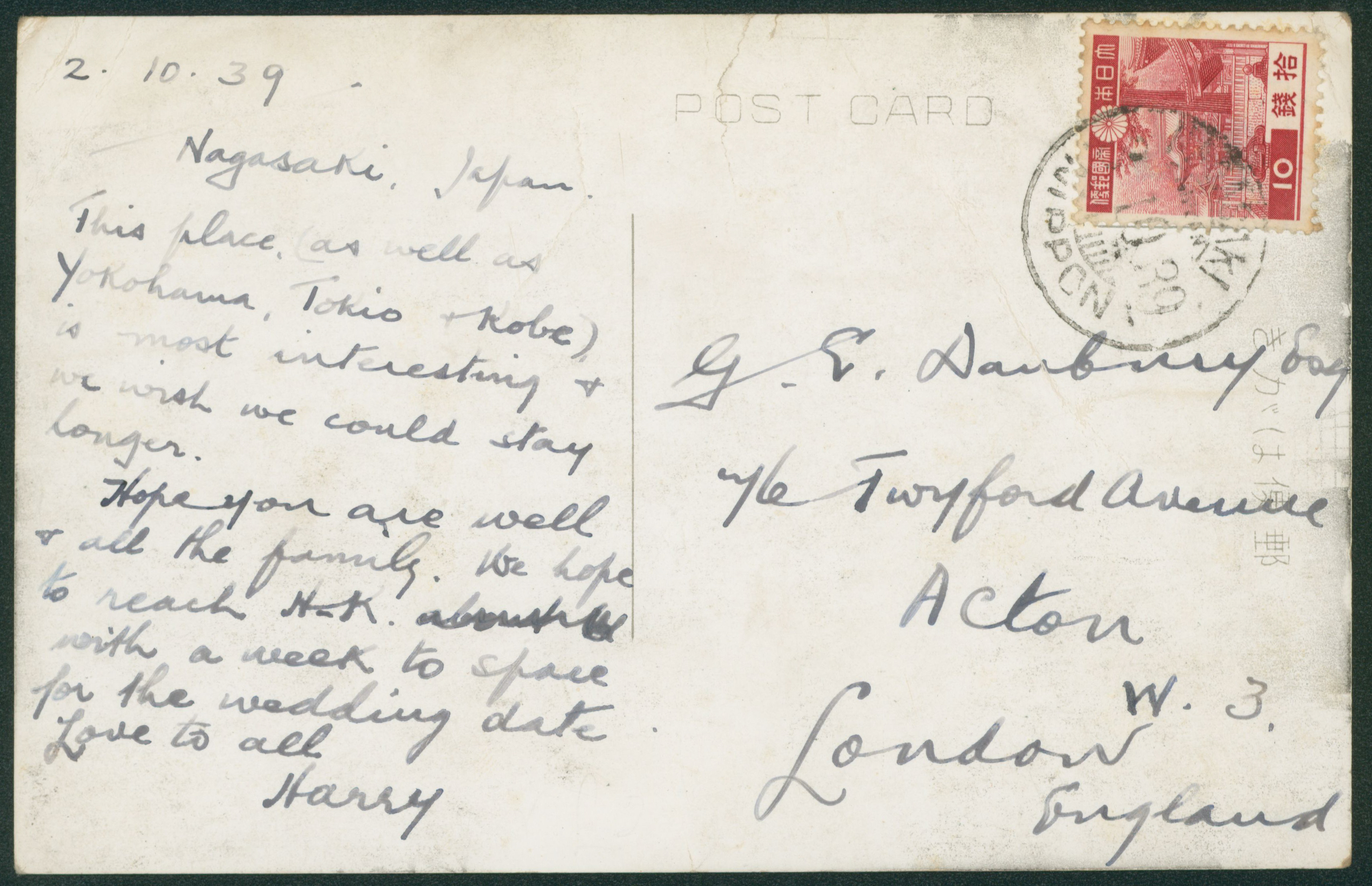 257 230 image1937-1940 issue 10 Sen single franking cancelled by roman letter comb cds in black 1939-10-04 NAGASAKI (Image1) (Image2) (All Images)
