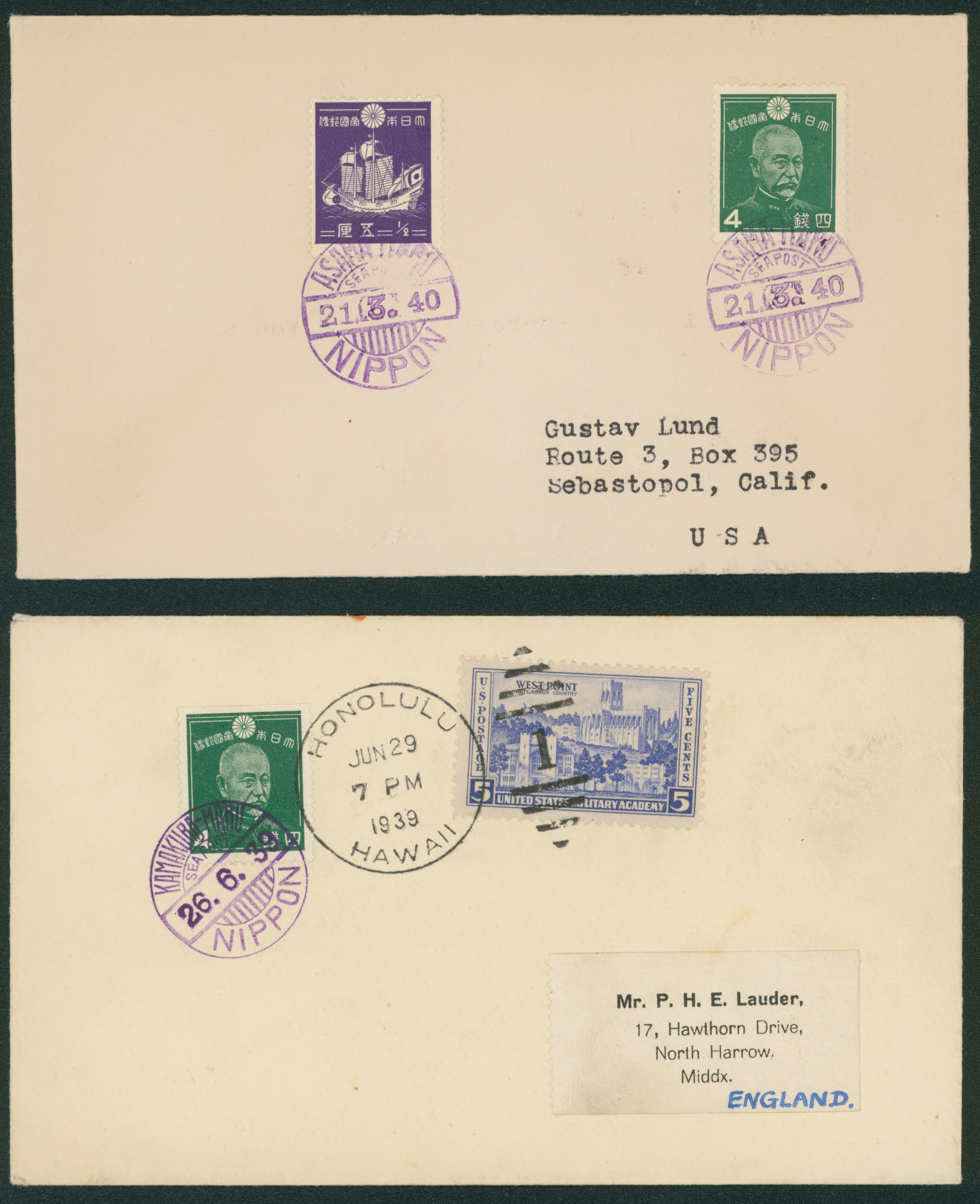 259 221,225 image, 2 covers 1937-1940 issue 5 Rin , 4 Sen cancelled by roman letter comb cds in purple 1940-03-21 ASAMA-MARU to USA (Image1) (Image2) (All Images)