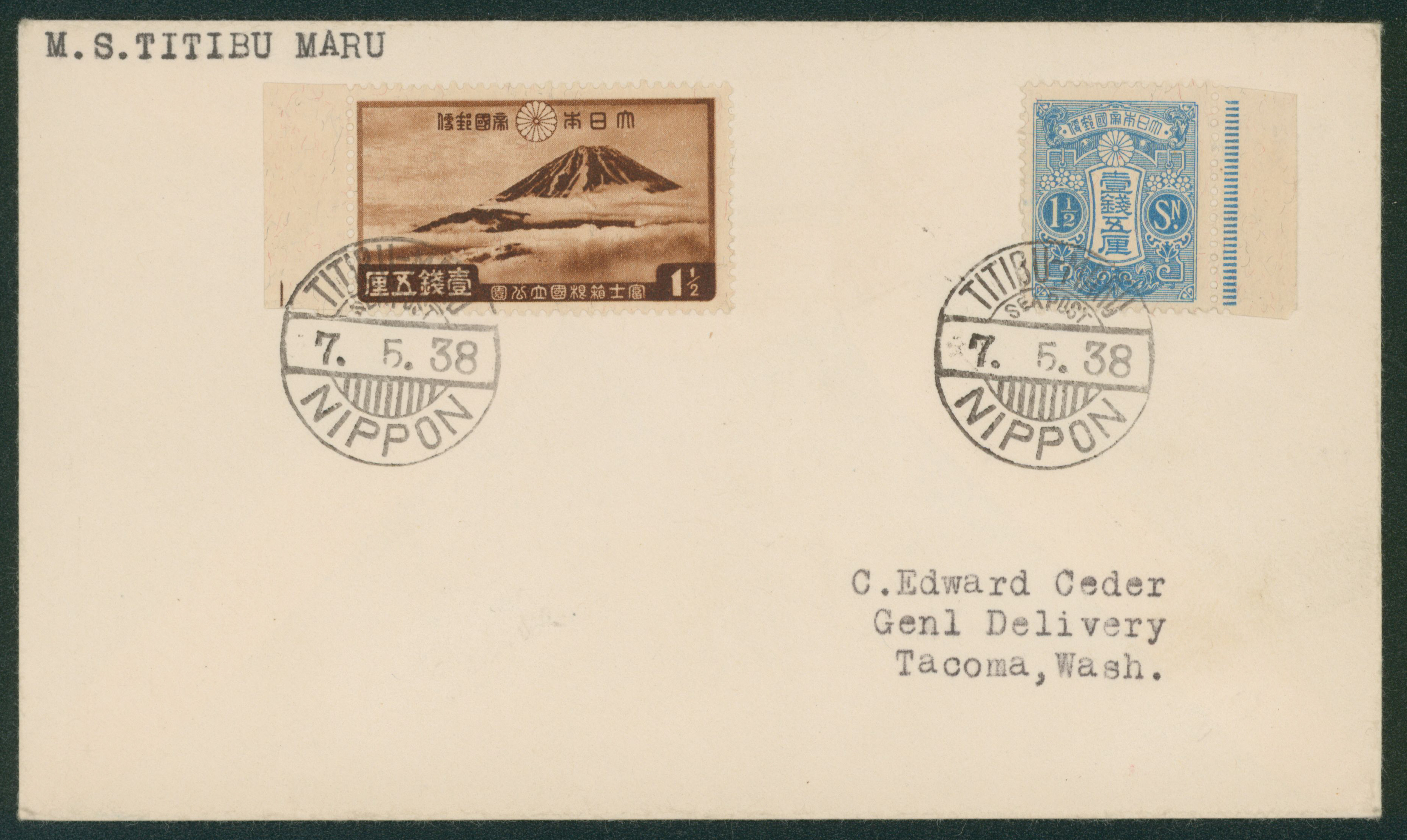 258 P1,159 imageNational park Fuji Hakone 1.5 Sen, 1926-1935 The fifth issue, 3rd period, rotary press 1.5 Sen cancelled by roman letter comb cds 1938-05-07 TITIBU-MARU (Image1) (Image2) (All Images)