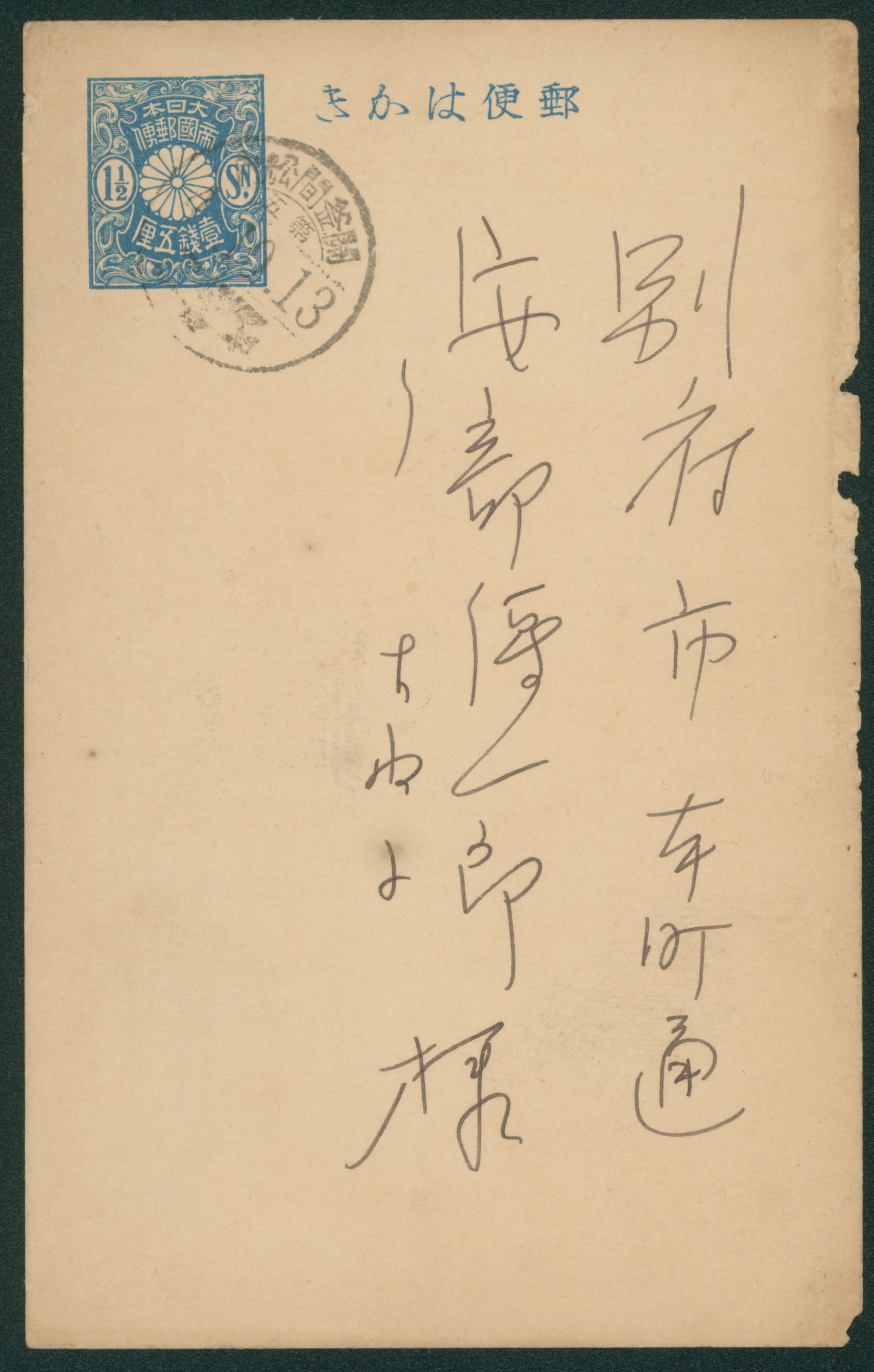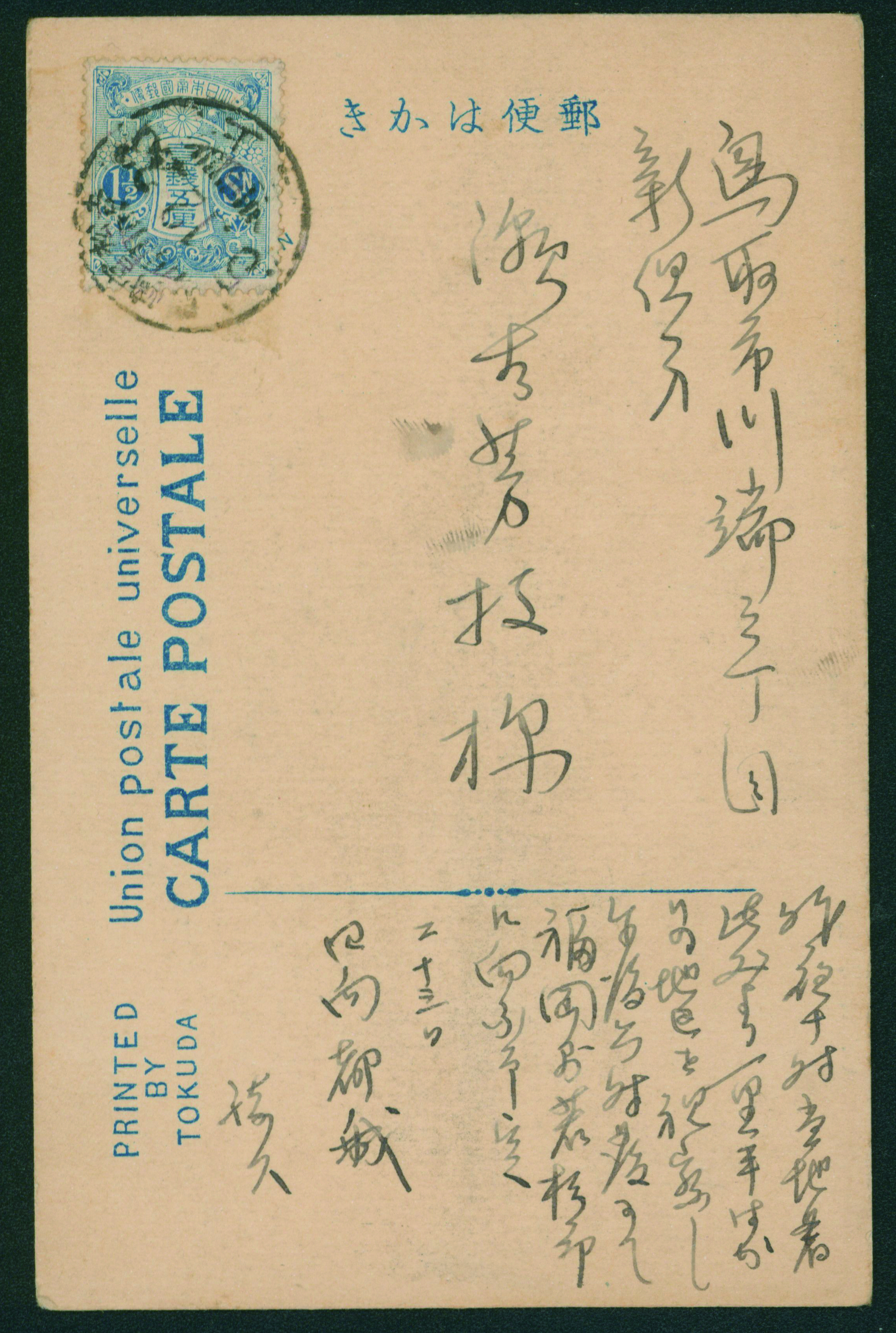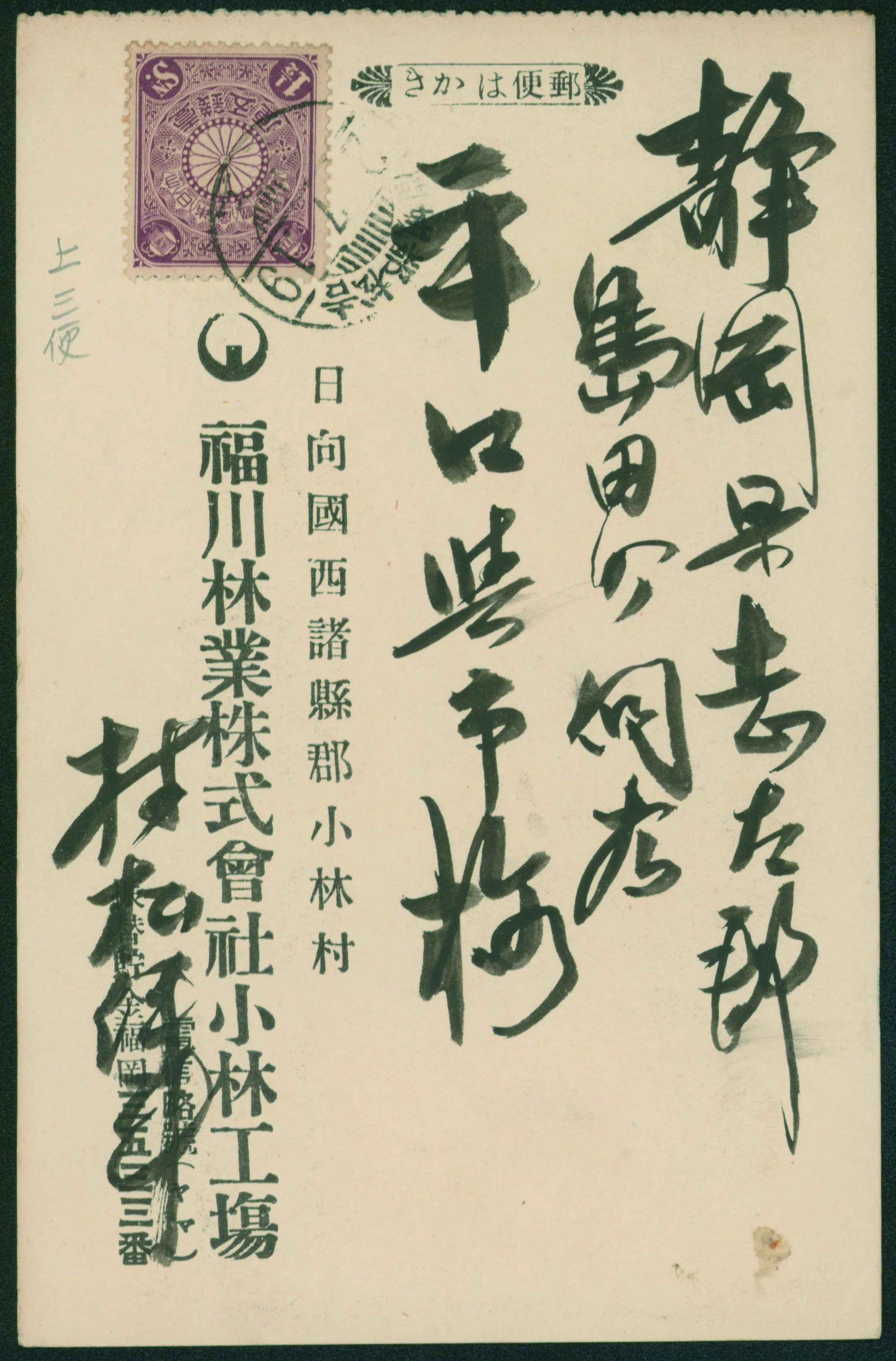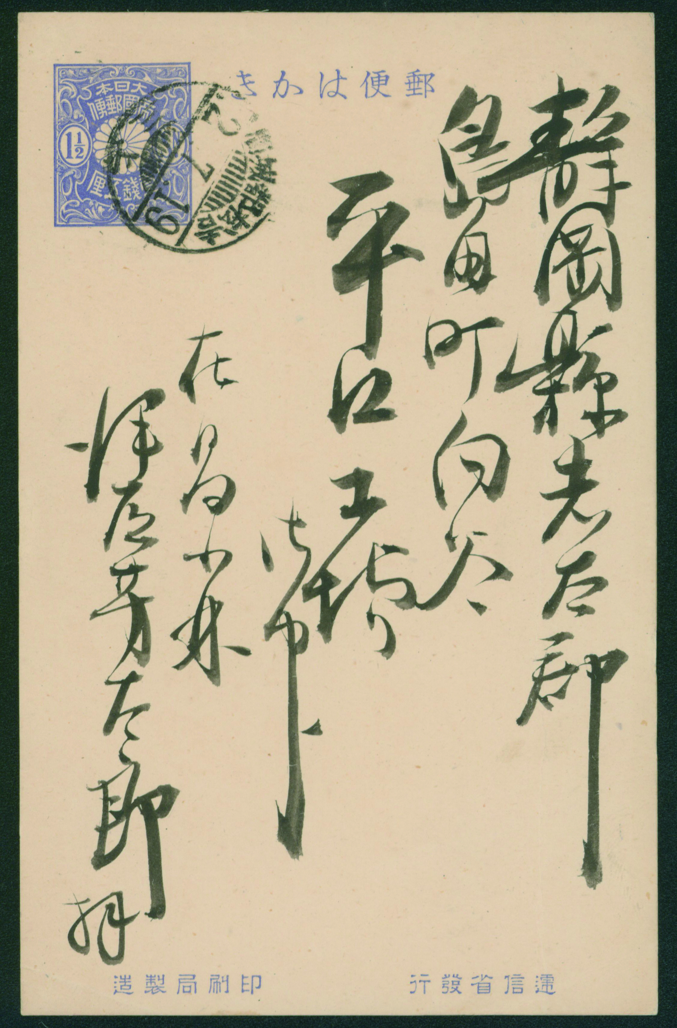 253 PC22 imageInternal Postalcard 1911 issue 1.5 Sen cancelled by train post cancellation 1913-07-19 between Yoshimatsu and 都城 (Image1) (Image2) (All Images)