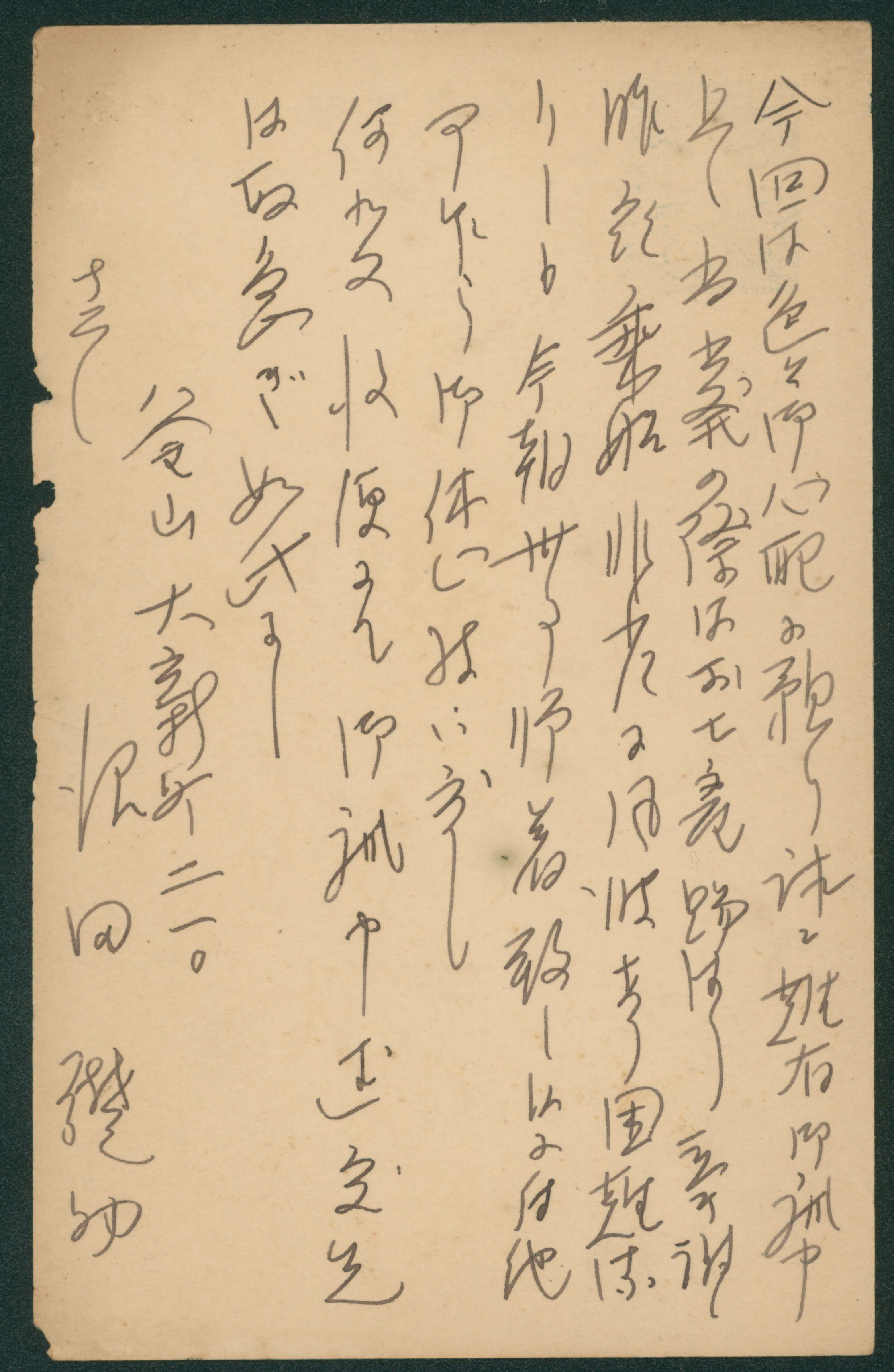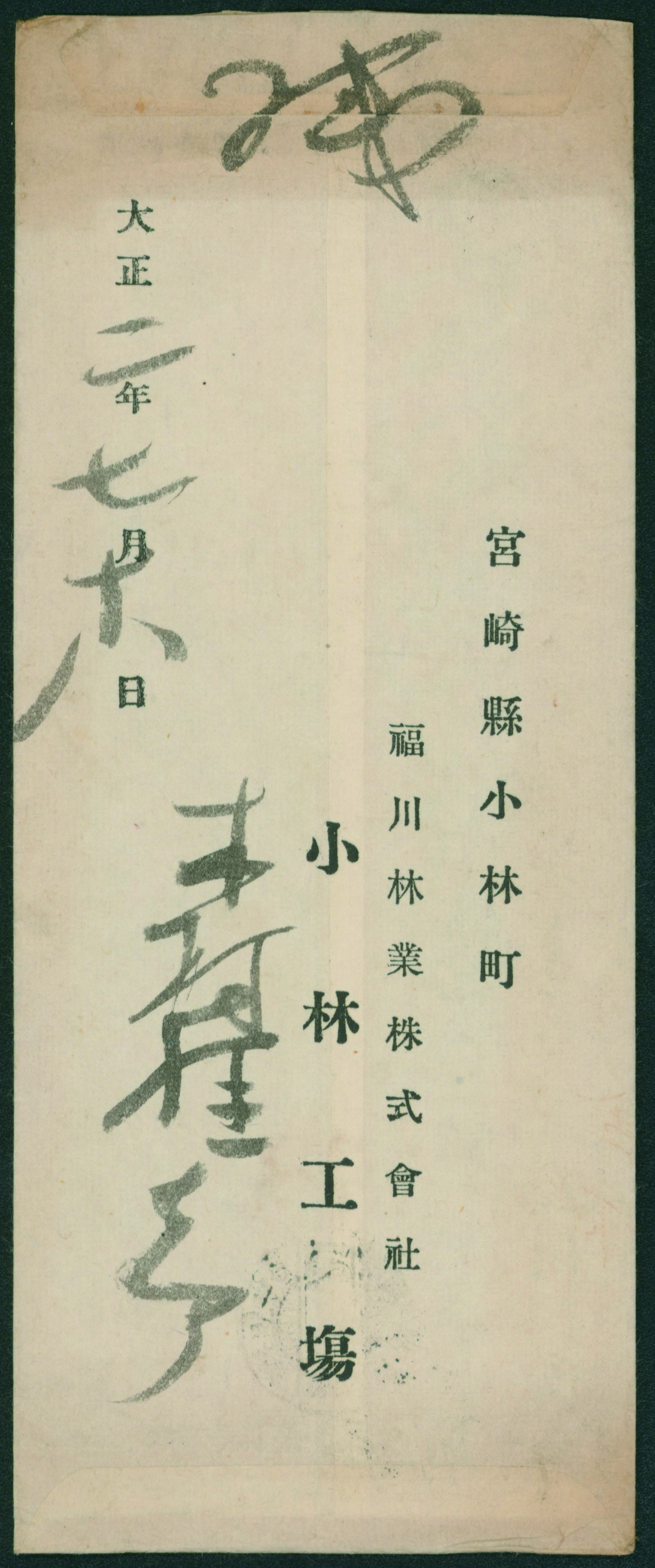 250 146 image1914-1925 The fifth issue, 2nd period 3 Sen single franking cancelled by train post cancellation 1917-07-06 between Yoshimatsu and Miyazaki torn cover, (Image1) (Image2) (All Images)