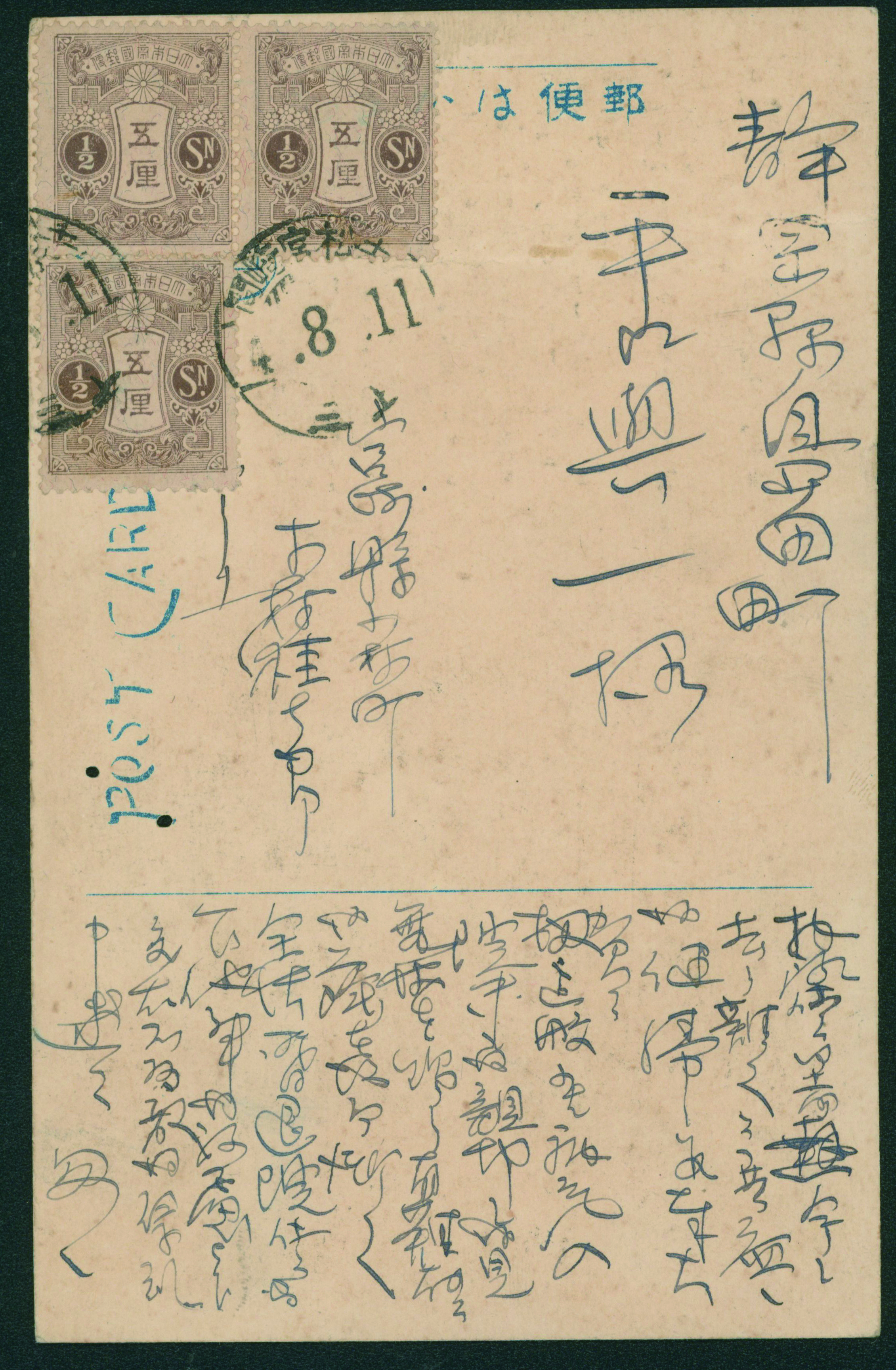 261 144,146 image, 3 post(al) cards 1914-1925 The fifth issue, 2nd period 1.5 Sen, 3 Sen cancelled by comb cds 1921-03-29 to France (Image1) (Image2) (All Images)