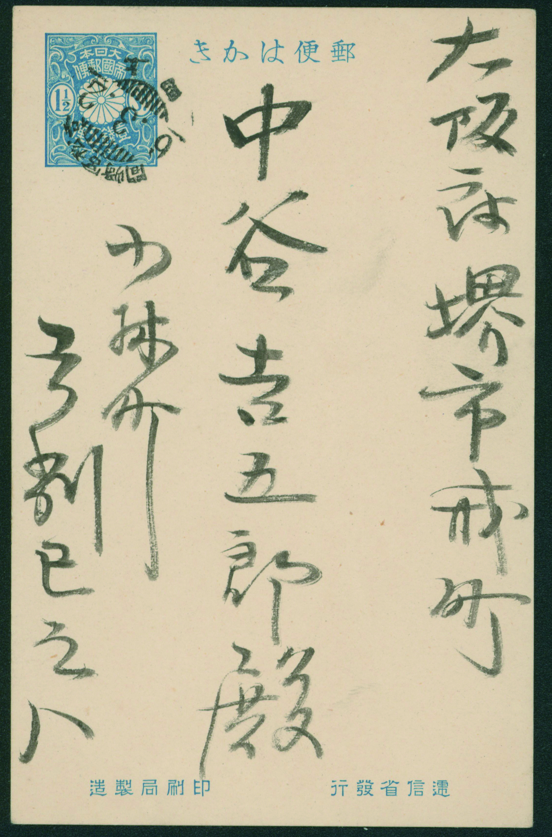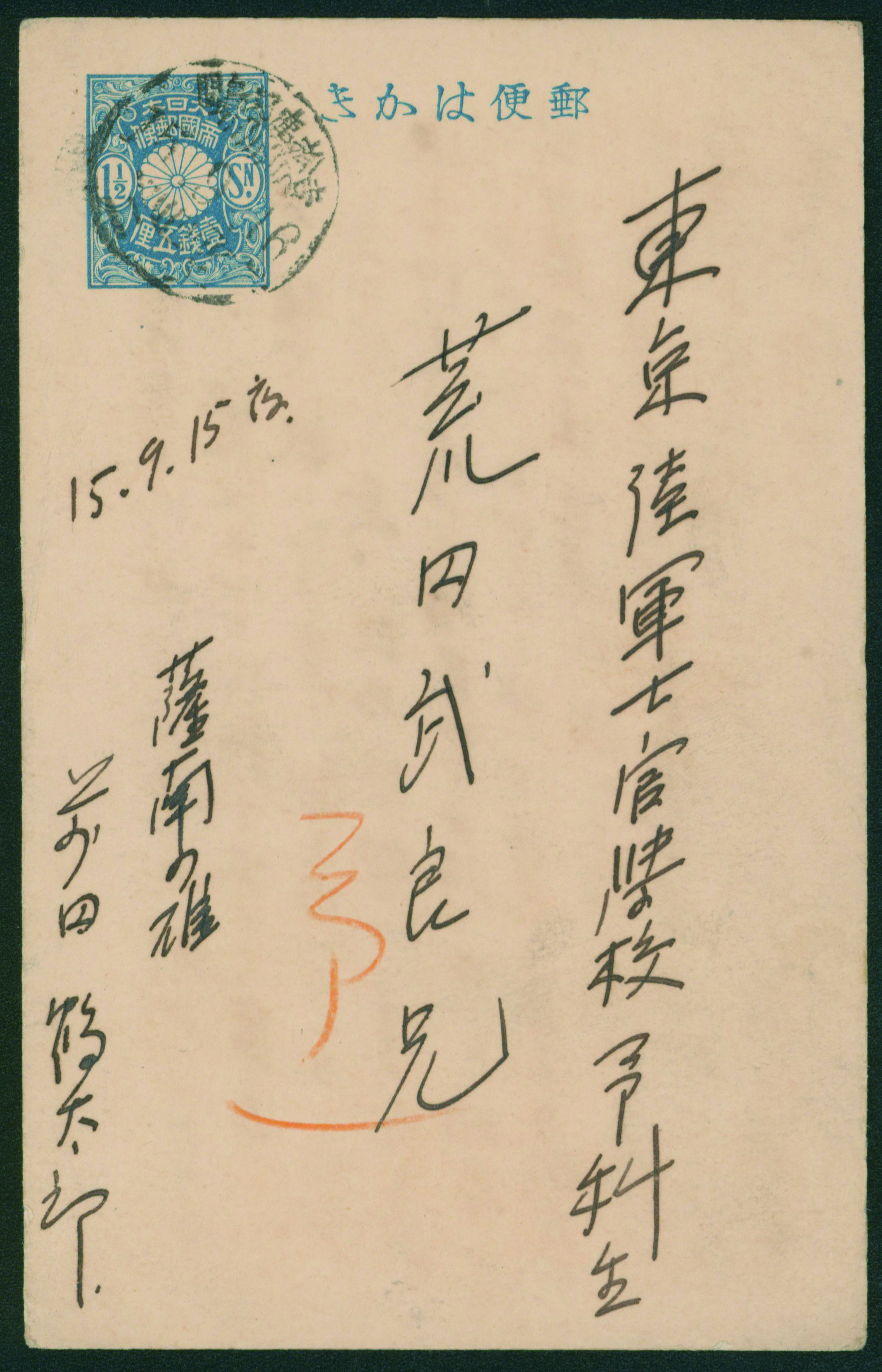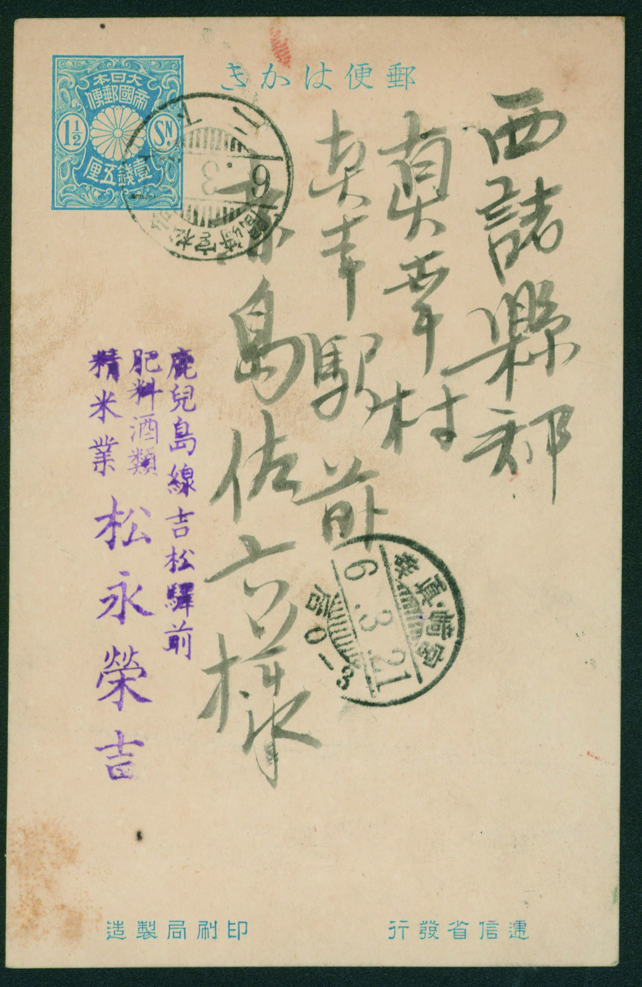 256 PC24 imageInternal Postalcard 1911 issue 1.5 Sen cancelled by train post cancellation 1926-09-16 between Yoshimatsu and Kagoshima (Image1) (Image2) (All Images)