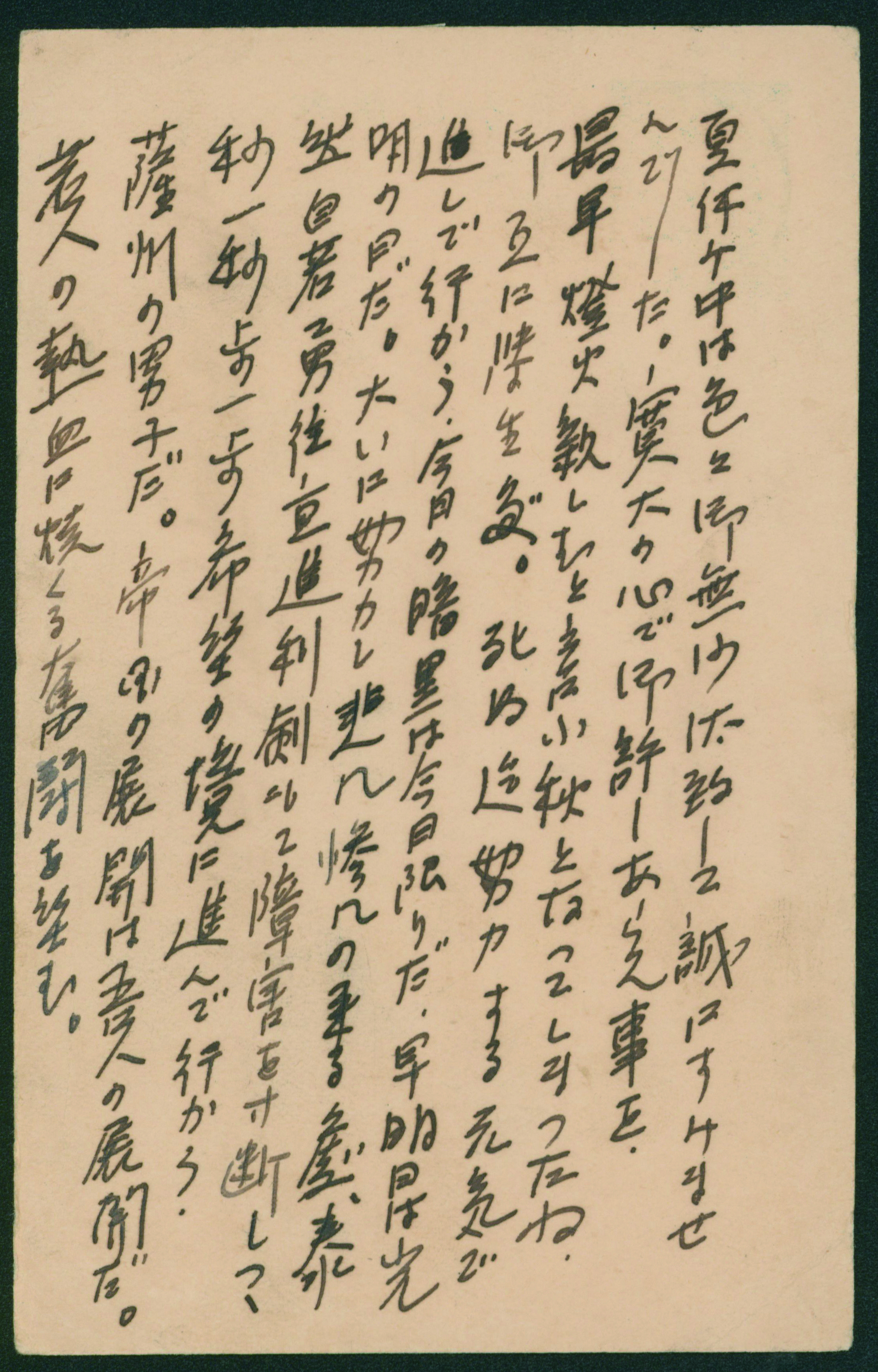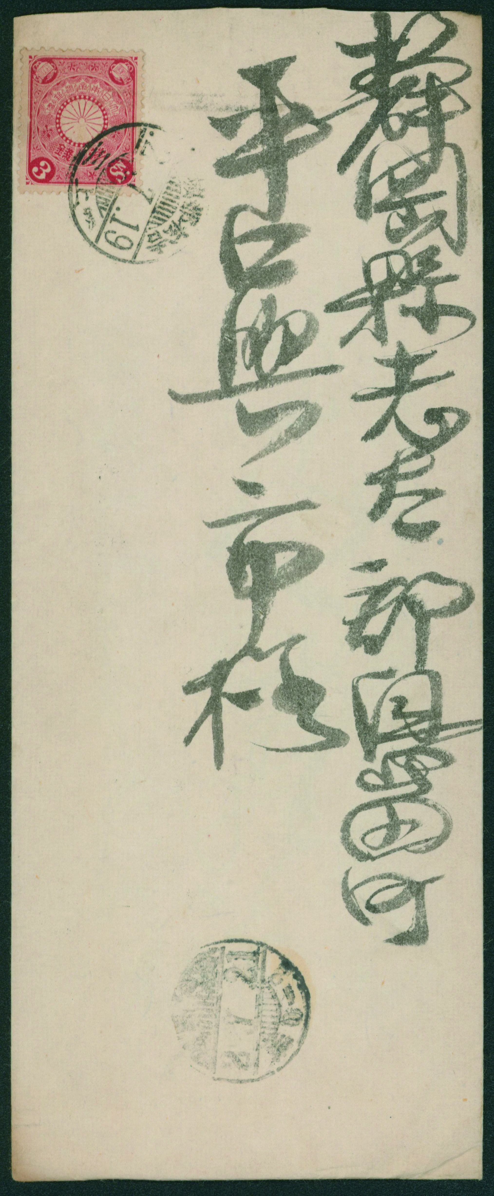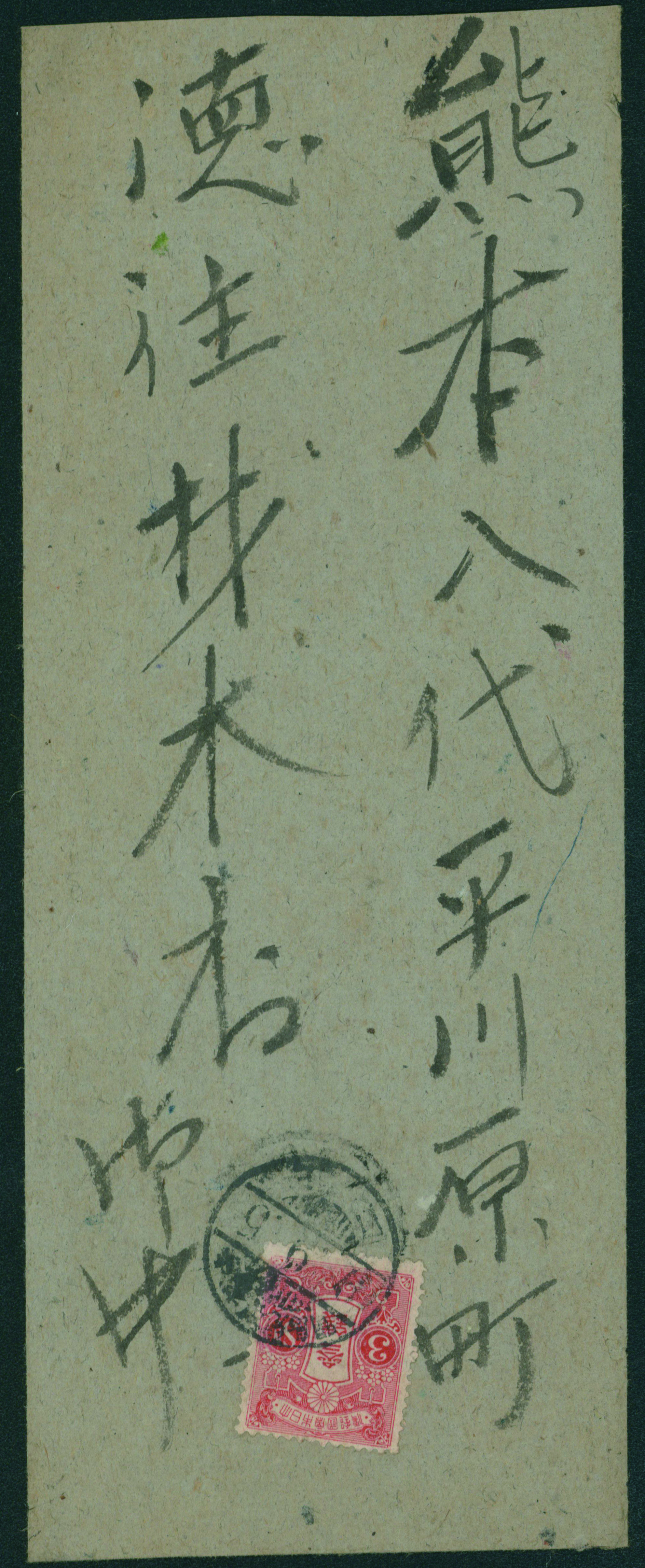 249 146 image1914-1925 The fifth issue, 2nd period 3 Sen single franking cancelled by train post cancellation 1920-09-05 between Yoshimatsu and Kagoshima (Image1) (Image2) (All Images)