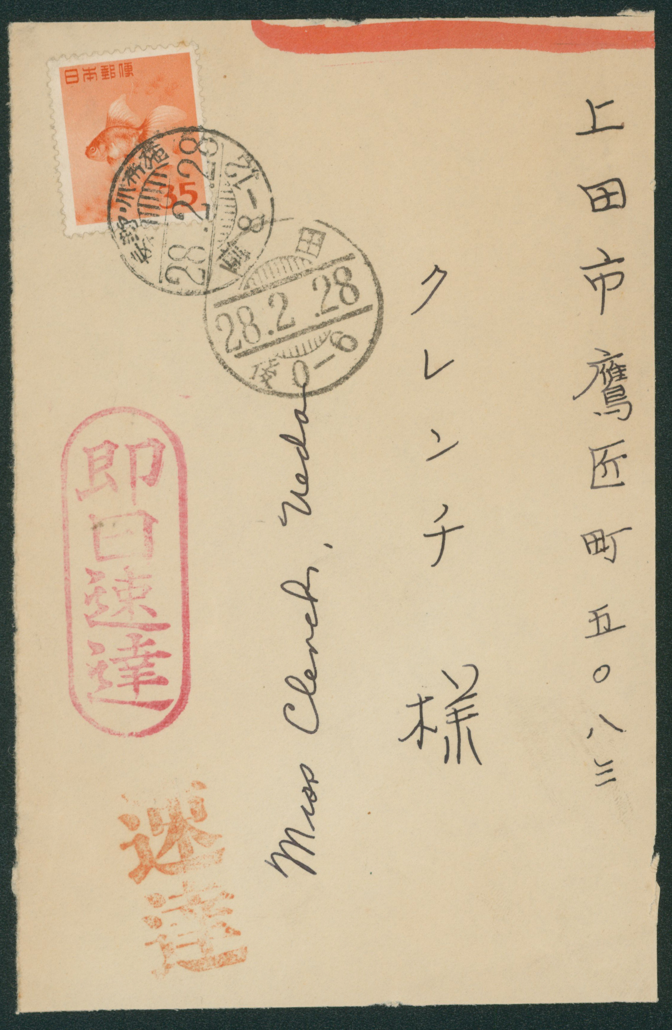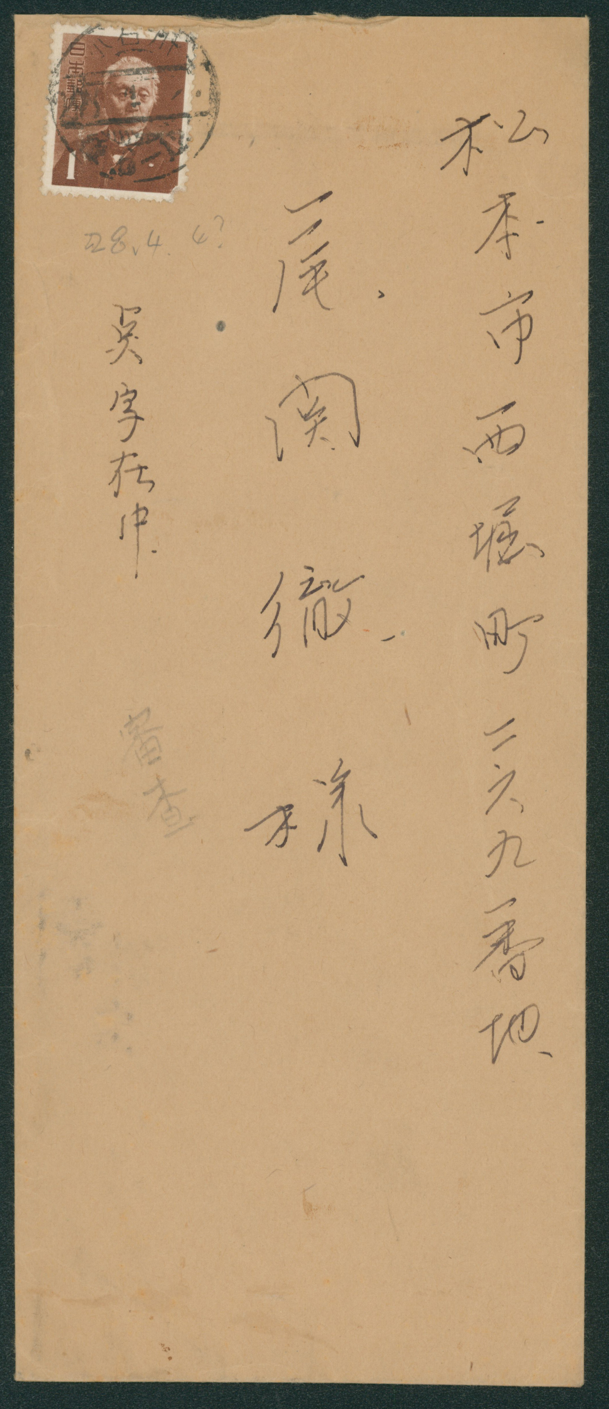 372 363 image1952-1959 issue 35 Yen single franking cancelled by comb cds 1953-02-28 小布施(Nagano) to Ueda only front of the cover, (Image1) (Image2) (All Images)