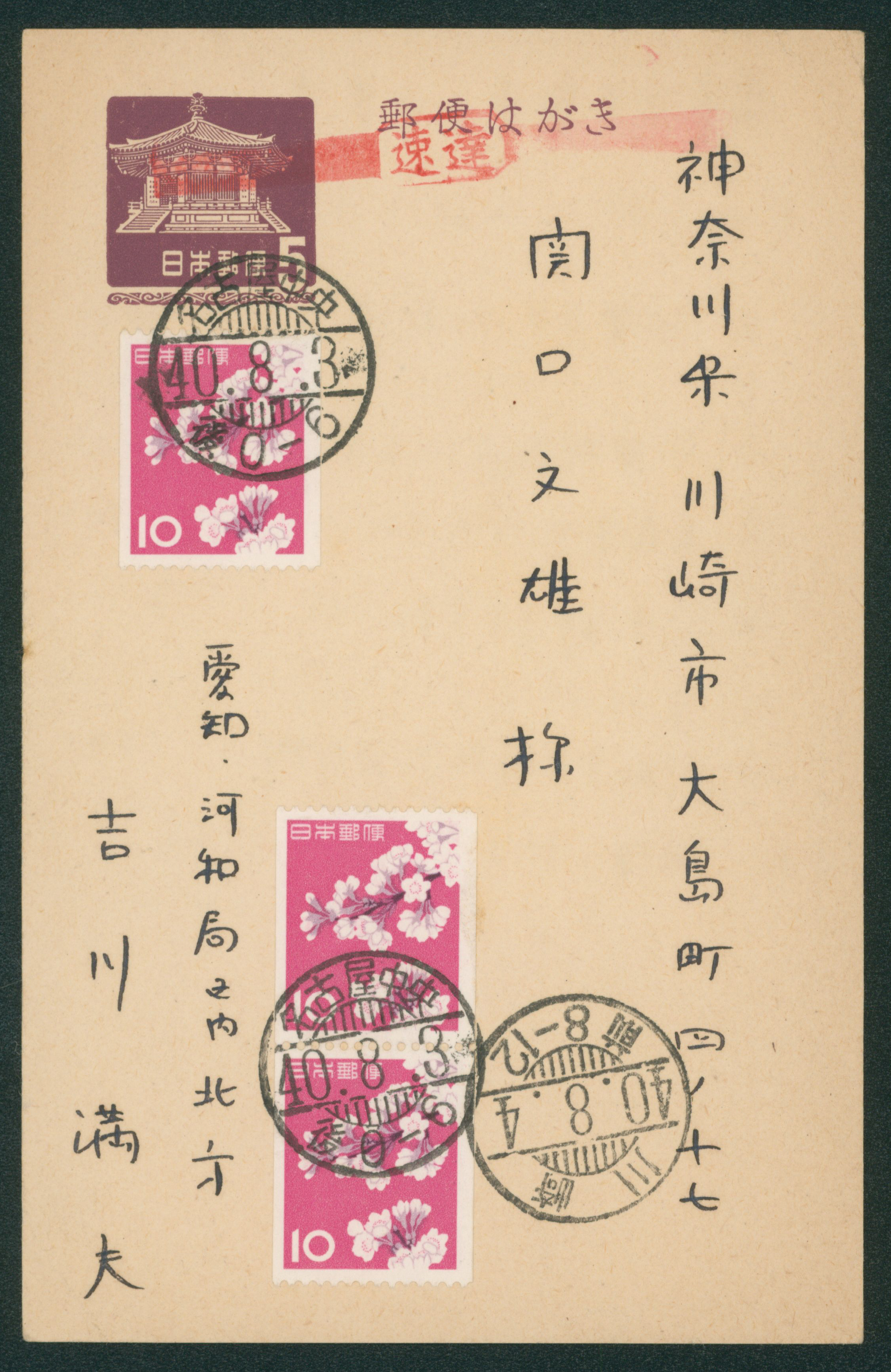 377 PC57,382(3) imageInternal Postalcard 1961 issue 5 Yen , 1961-1965 issue 10 Yen Coil cancelled by comb cds 1965-08-03 Nagoya to Kawasaki arrival :8/4 (Image1) (Image2) (All Images)